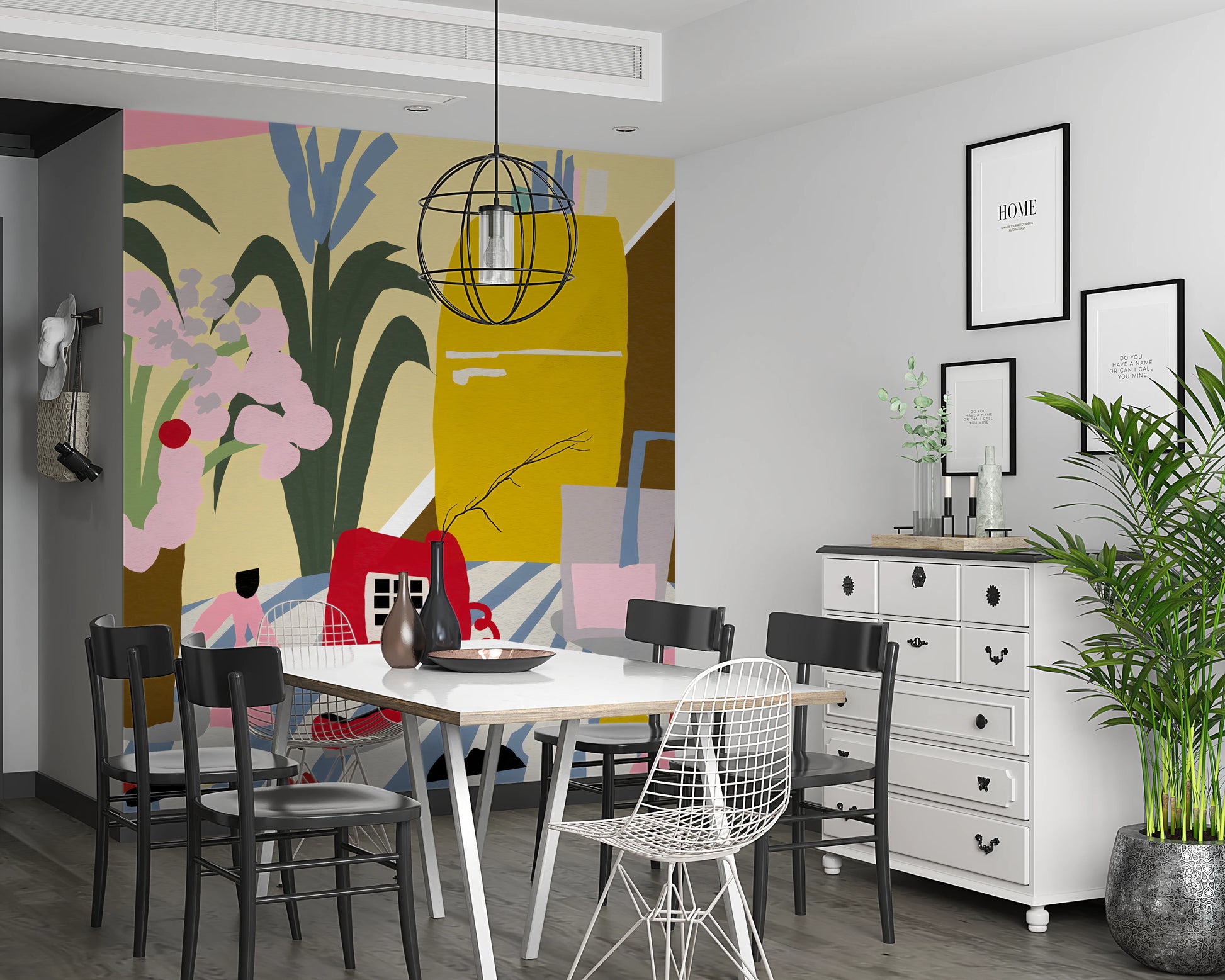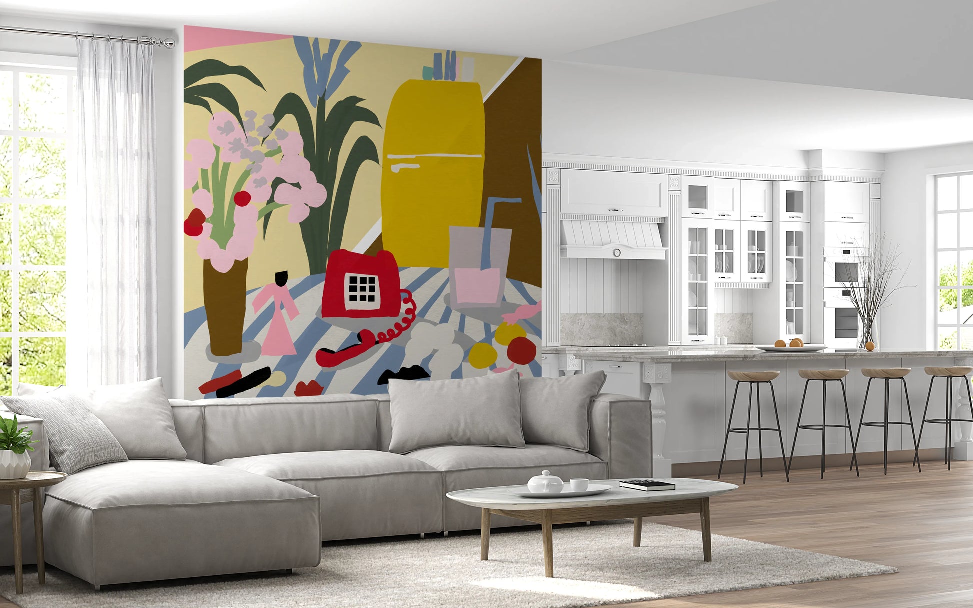Step back in time with this captivating "Vintage Mid-Century Kitchen Still Life" wall décor. This artwork celebrates the iconic design sensibilities of the era, depicting a stylised kitchen scene filled with retro charm. A sunshine-yellow refrigerator stands tall, while a classic red rotary phone and a refreshing glass of pastel pink drink sits invitingly nearby. Bold, graphic floral arrangements add a touch of natural beauty to the scene, all set upon a striped tablecloth that exudes a sense of playful nostalgia. The colour palette is pure mid-century modern, with a blend of muted and vibrant tones creating a warm and inviting atmosphere. Perfect for adding a touch of retro flair to any room, this still life brings a sense of history and style to your walls.
