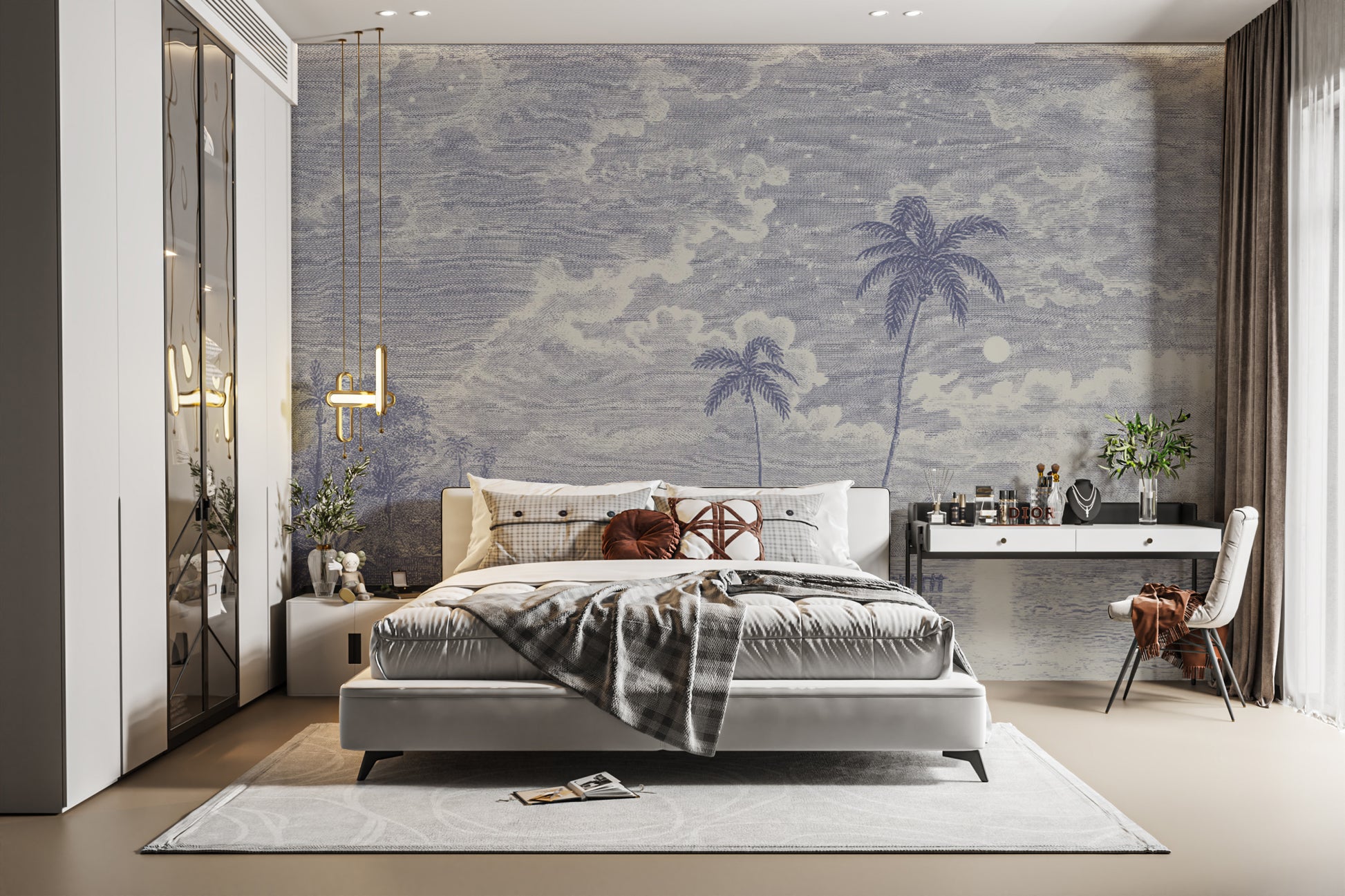 Vintage Moonlit Tropical Beach Engraving Wallpaper