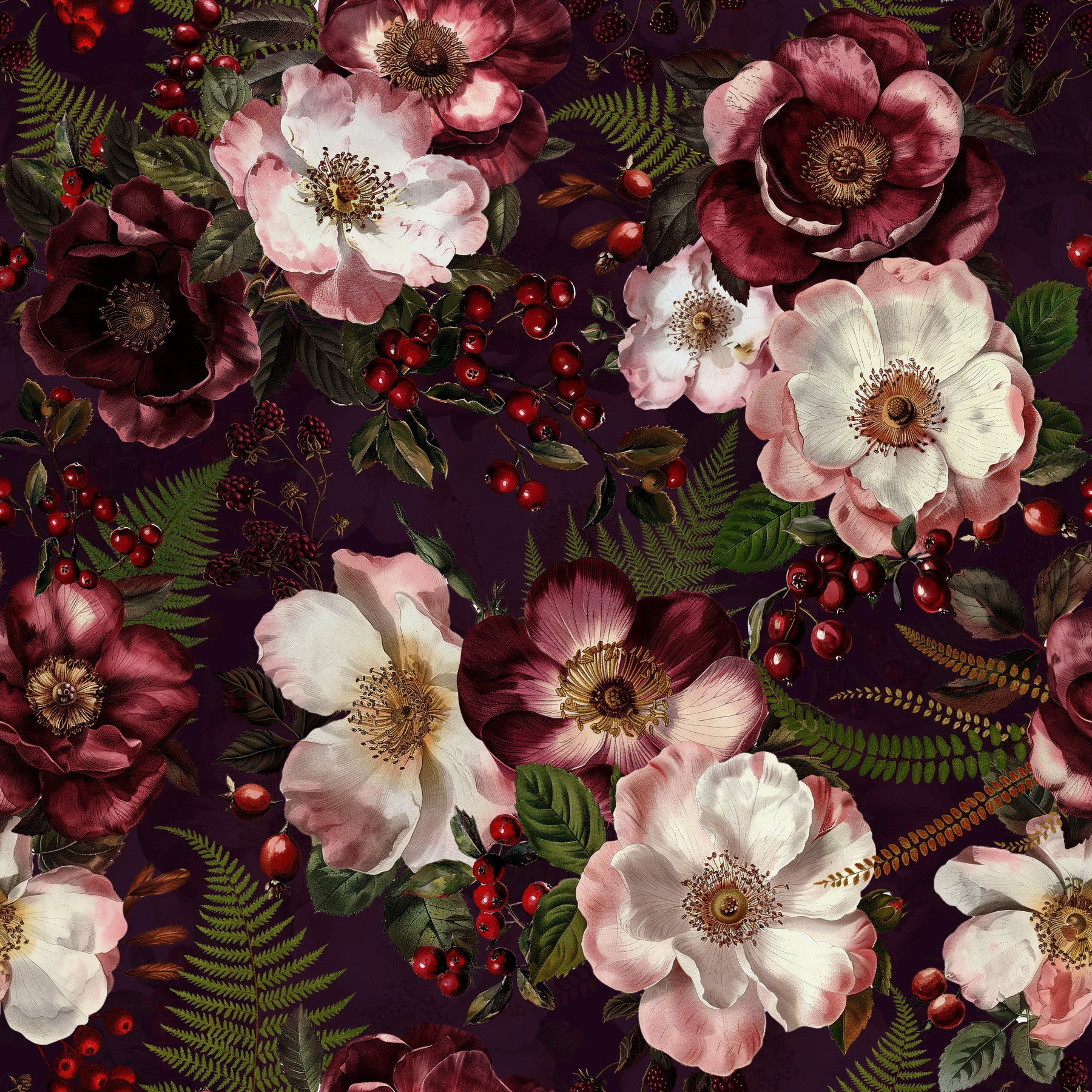 Embrace the enchanting allure of 'Vintage Mystic Night Roses,' a digital wallpaper that transports you to a realm of nocturnal beauty. Deep burgundy and blush pink roses, rendered in a captivating vintage style, intertwine with lush ferns and clusters of glistening berries. The rich, dark background enhances the mystical ambiance, creating a captivating and sophisticated atmosphere. This wallpaper seamlessly blends romantic floral artistry with an air of subtle mystery, perfect for adding a touch of elegant darkness to your digital space. The exquisite detail in each bloom and berry evokes a sense of timeless charm, making it an ideal choice for those who appreciate refined, captivating design.
