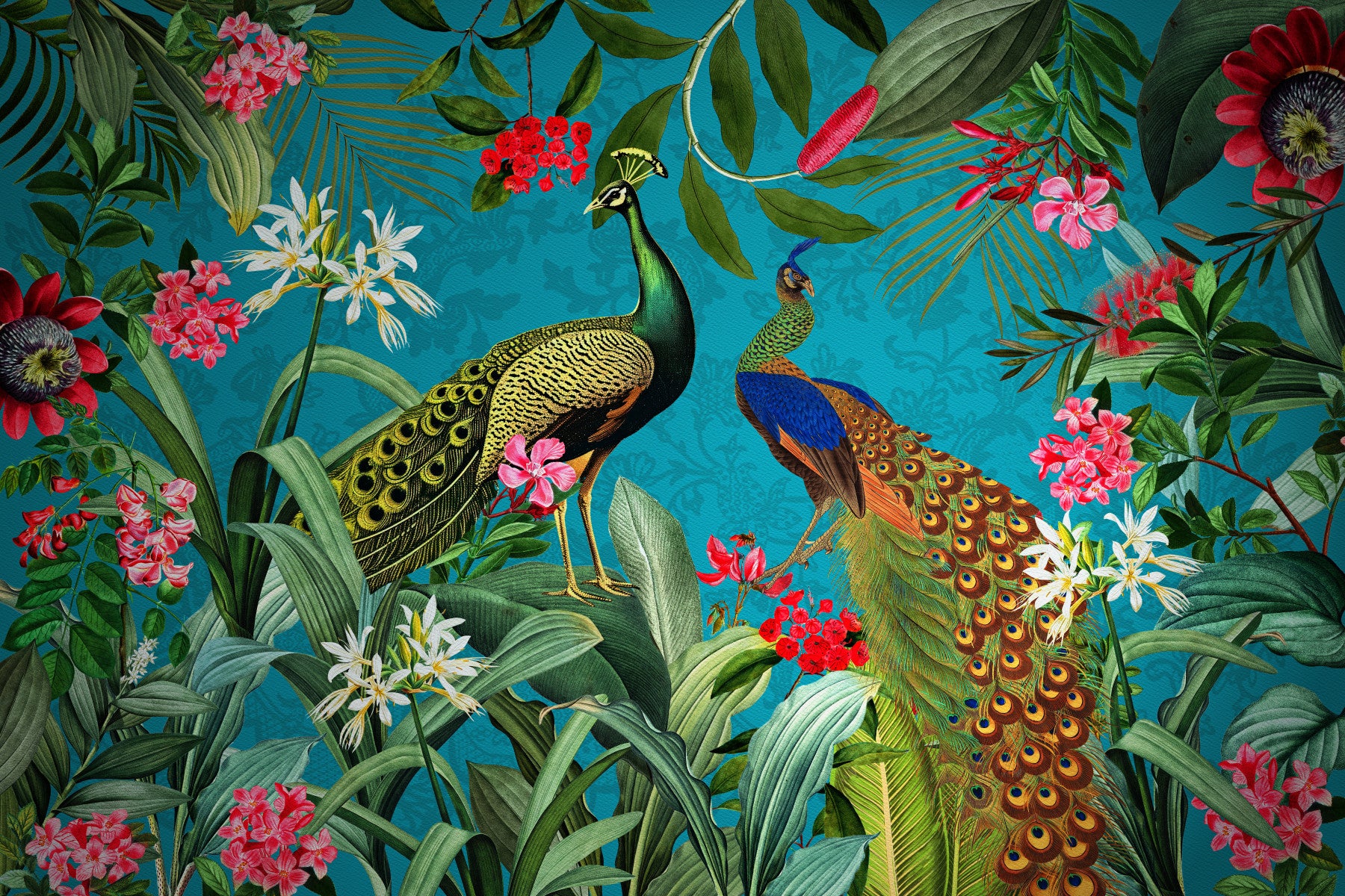 Escape to a lush, vibrant paradise with this vintage-inspired wallpaper. Two majestic peacocks, rendered in exquisite detail with a rich color palette, take center stage amidst a profusion of exotic blooms. Intricate botanical illustrations of vibrant pink and red flowers, alongside elegant white lilies, intertwine with lush green foliage against a deep teal background. The vintage aesthetic is enhanced by a subtle damask-like texture, creating a sense of timeless beauty and opulence. This wallpaper evokes a feeling of tranquility and exotic wonder, perfect for adding a touch of vintage charm and natural elegance to any space.