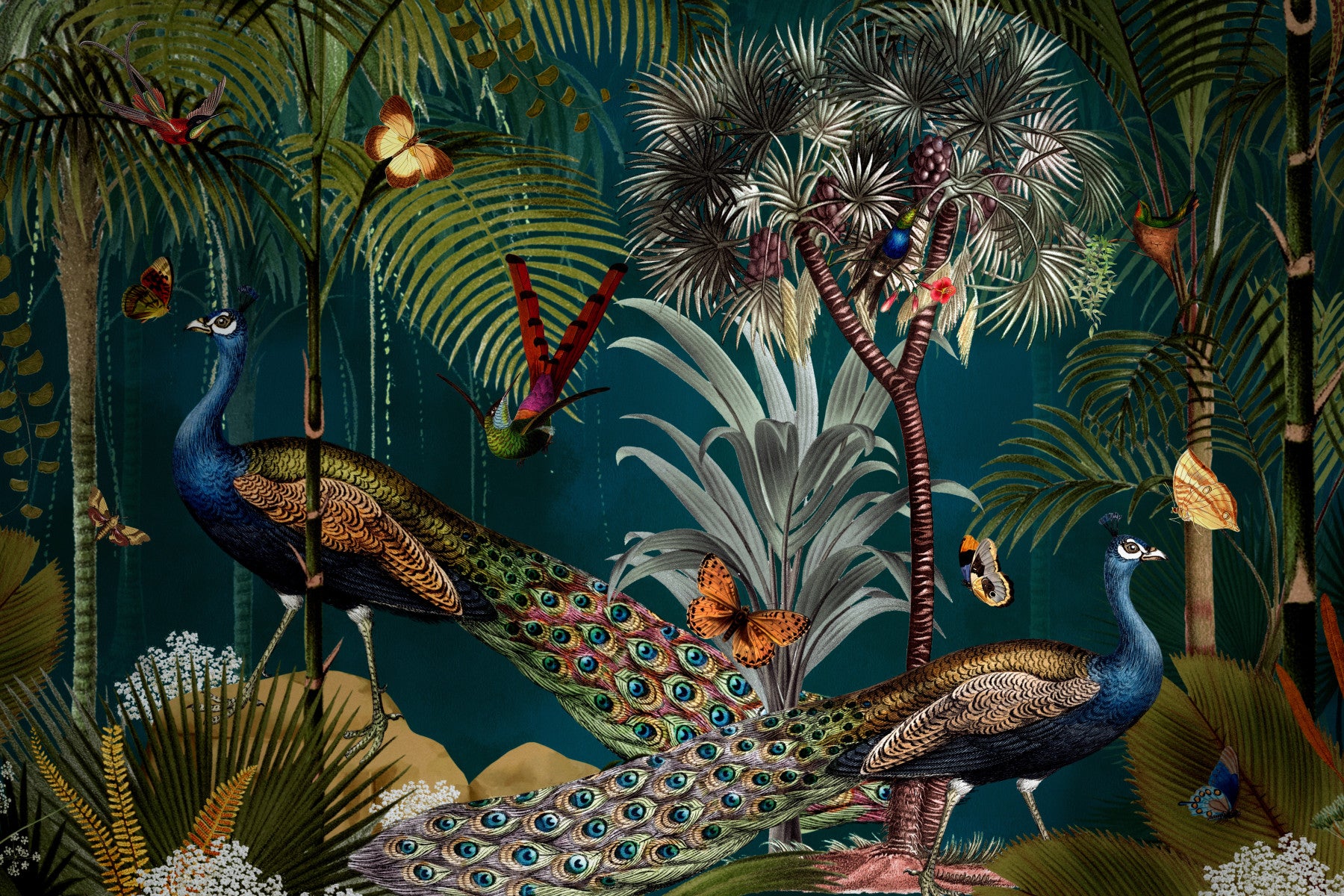Immerse yourself in a lush, tropical paradise with this captivating wallpaper. Two majestic peacocks, rendered in exquisite detail, stroll through a vibrant jungle teeming with exotic birds and butterflies. The deep teal backdrop enhances the richness of the peacock's plumage and the surrounding foliage, creating a sense of serene tranquility. This wallpaper is perfect for adding a touch of opulent, natural beauty to any space, transforming your walls into a secret garden escape.