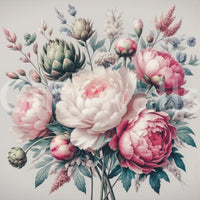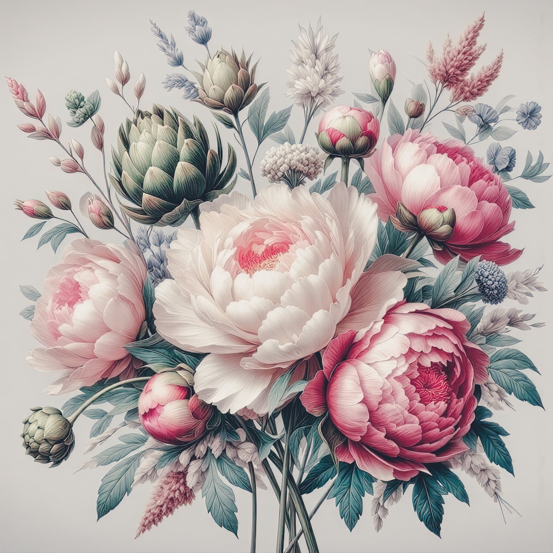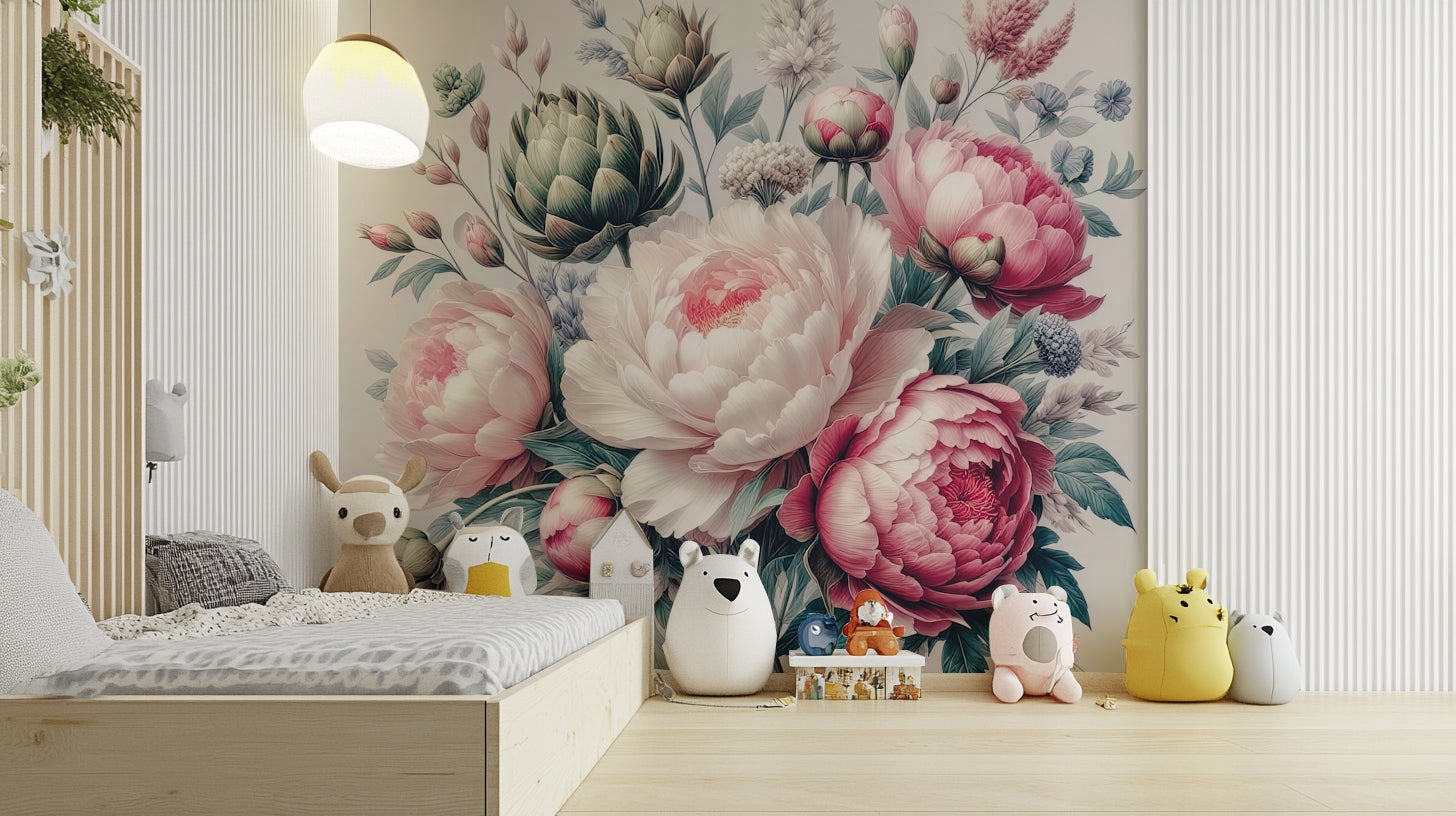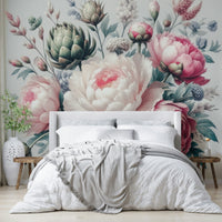 This floral wallpaper for walls features clusters of peony blooms in tones of blush pink and cream. Artichoke flowers and soft blue foliage surround the large peonies, adding botanical interest. This pattern works well in a bedroom or living room to create a peaceful scene. The delicate colours and soft lines make the room feel larger and more inviting. Install this wallpaper to design a space that feels welcoming and fresh.