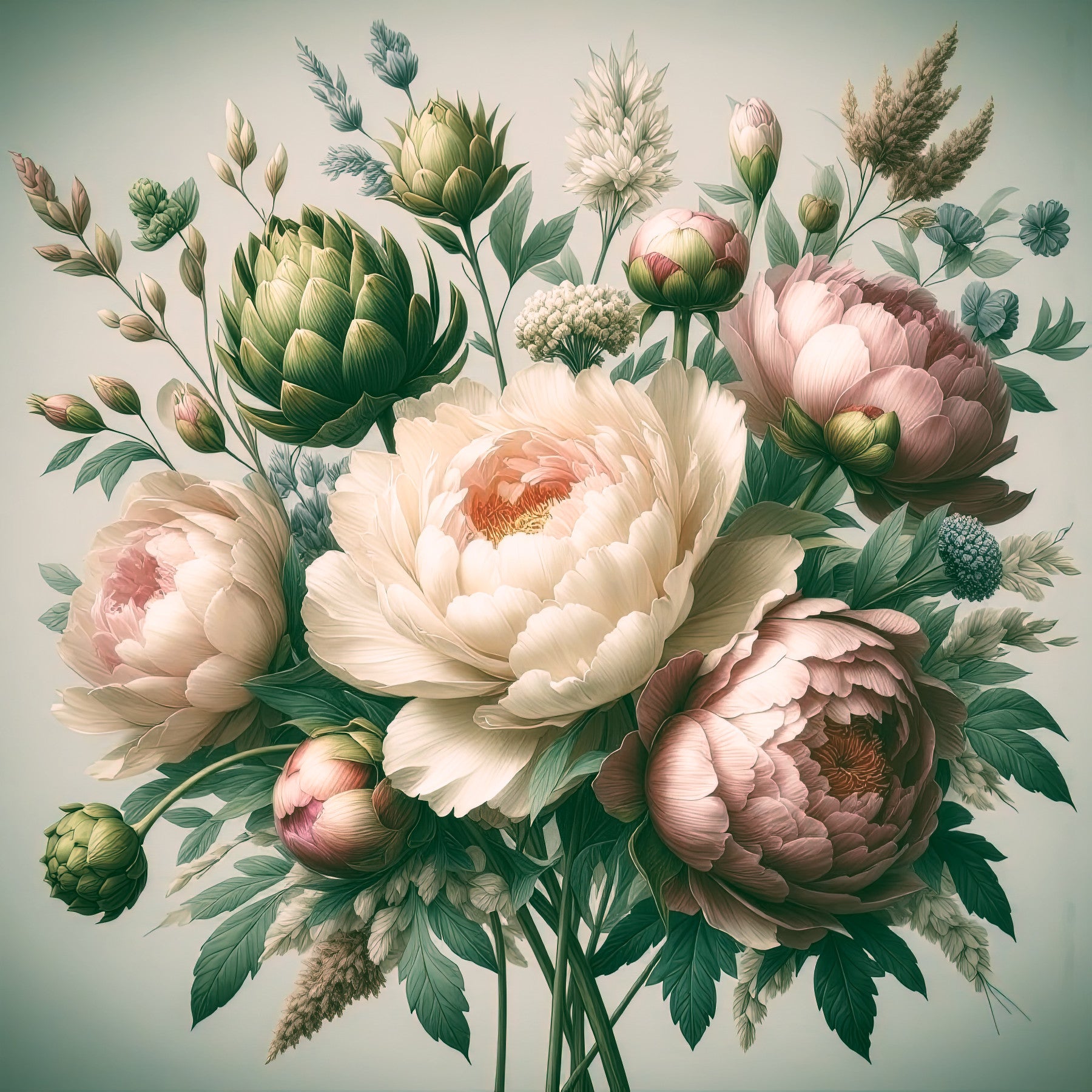 This wallpaper showcases a collection of peonies in full bloom. Gentle blush tones blend with muted greens. Artichokes bring an unexpected naturalistic touch. The design is reminiscent of vintage botanical illustrations. It suits bedrooms, living rooms, or dining rooms, and elevates interiors with a refined, classic charm. Consider this wallpaper for walls to give your room a refresh. It introduces a soft, inviting atmosphere with floral elegance.