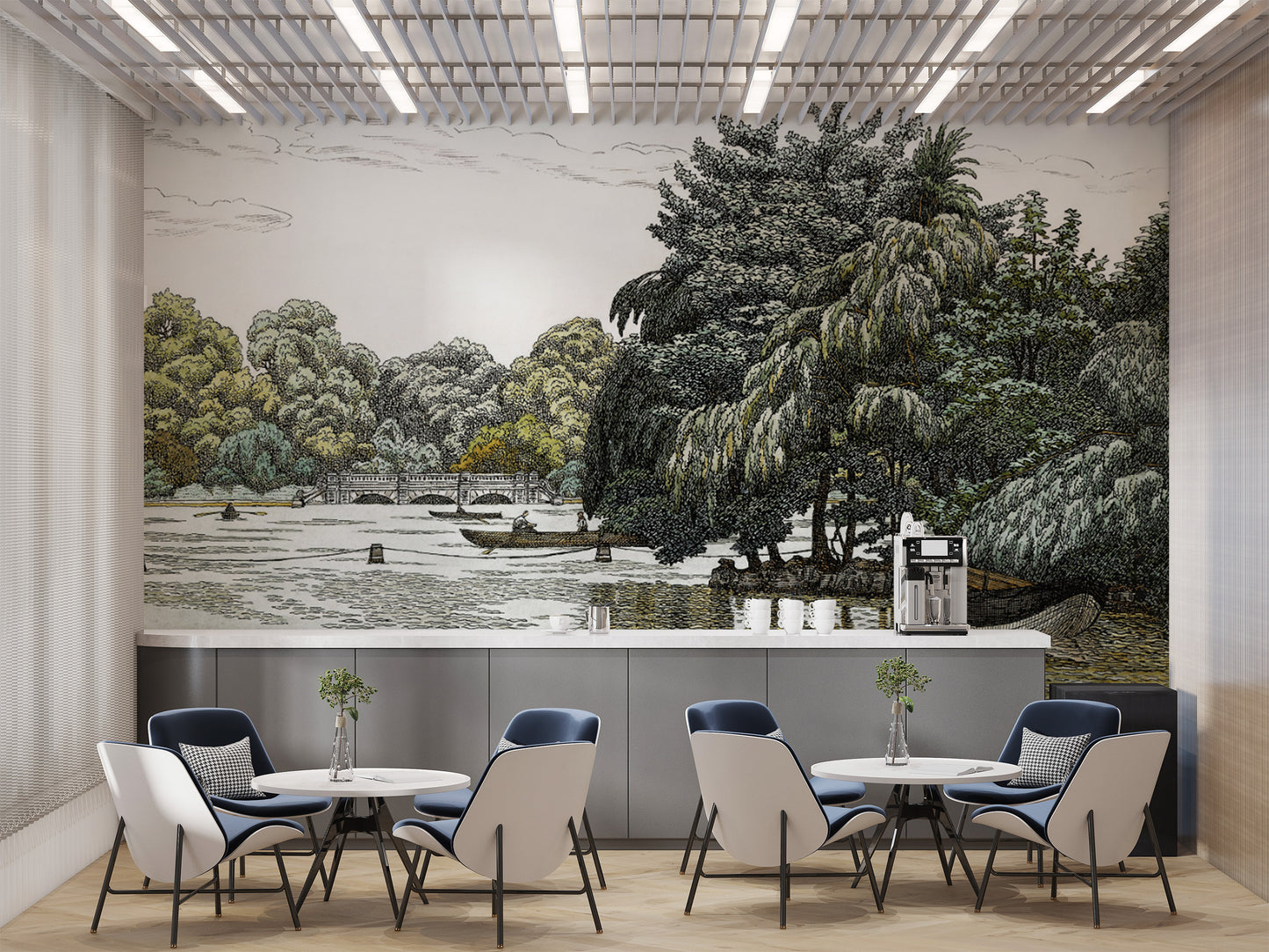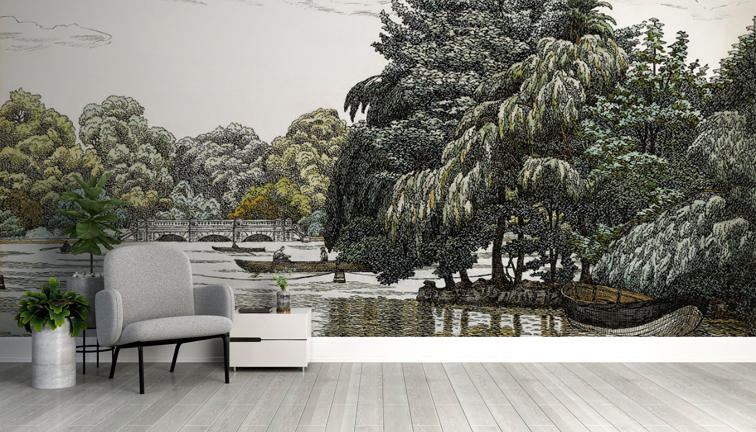 Scenic river boating mural with peaceful atmosphere