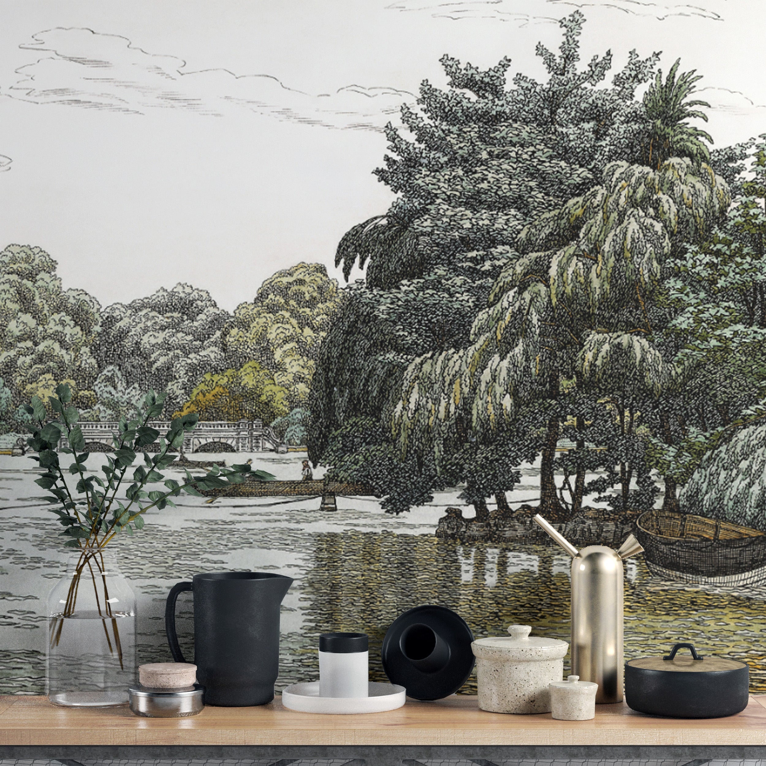Give your space an invigorating transformation with the vintage river landscape art mural, an everlasting work of art of a tranquil river landscape, a graceful bridge over the water, and leafy forest reflections. This traditional landscape mural adds a vestige of historical wildlife depiction to your interiors, which is suitable for people who like conventional ink drawings and hand-drawn wildlife sketches. Its calm waters landscape and vintage artistry create a romantic river ambiance, ideal for living rooms, studies, or hallways. Incorporate this fine art mural into your décor and add old-world charm with the scenic river boating serenity. Experience the beauty of nature in a vintage art print mural today!