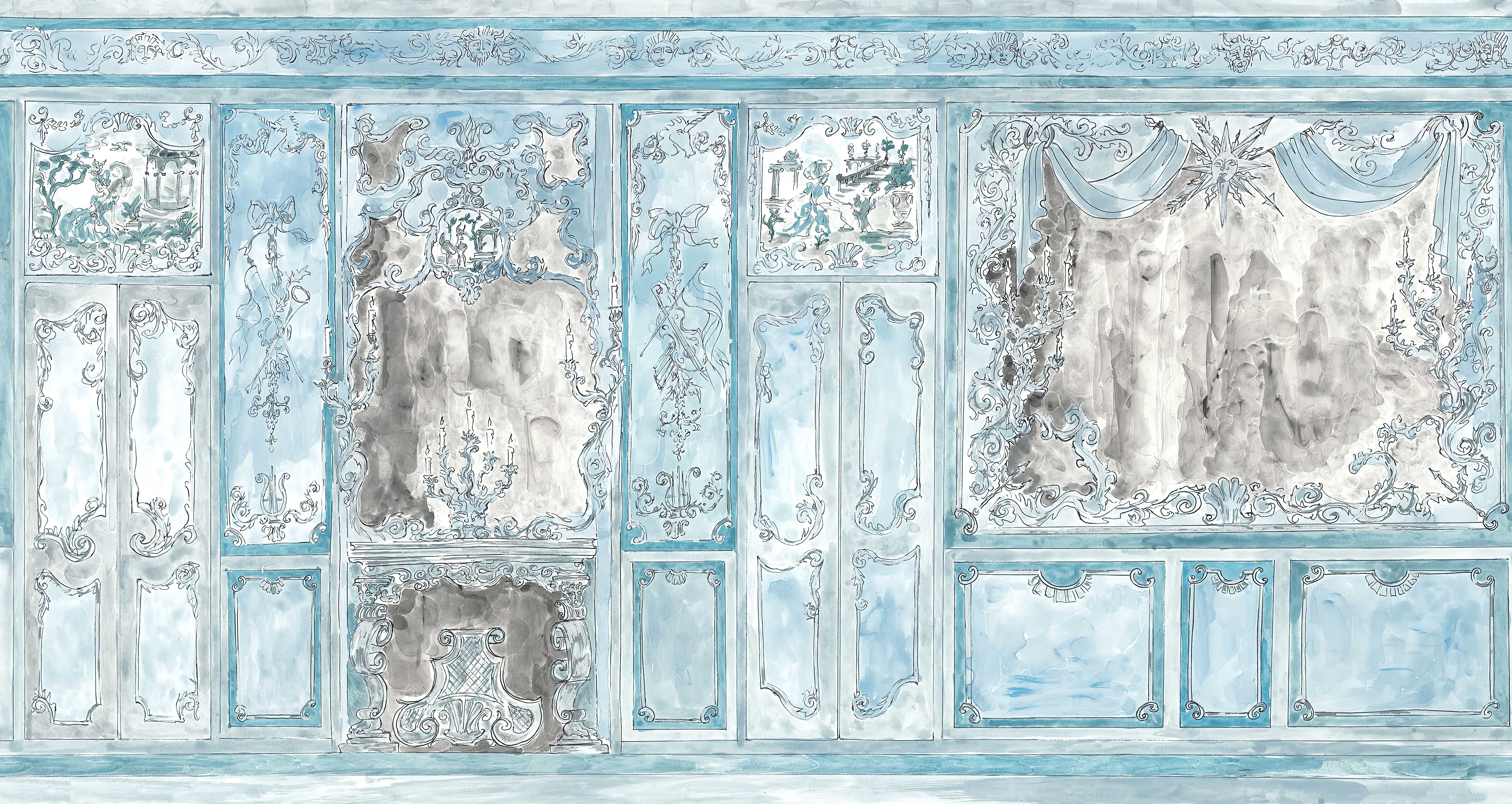 Vintage Rococo Blue Wall Mural with ornate detailing