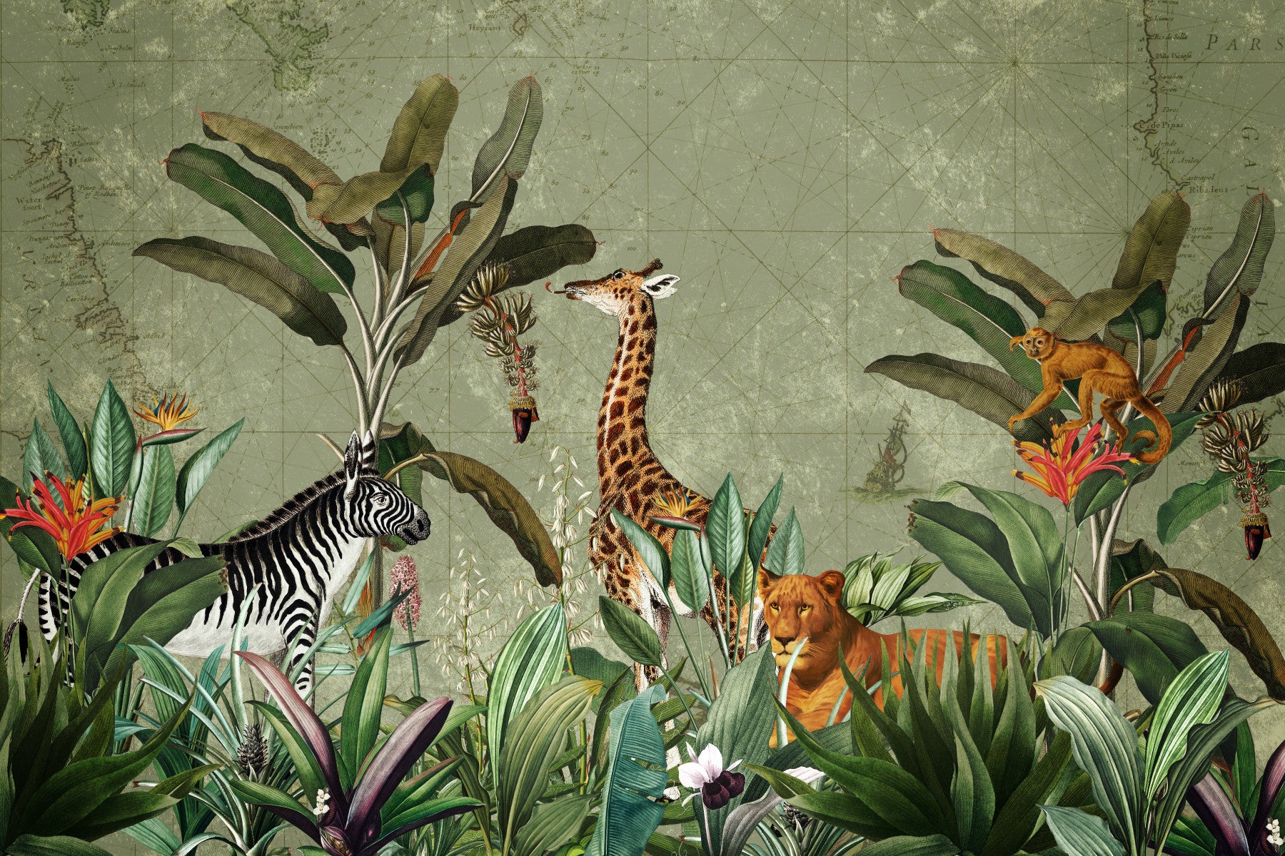 Embark on a visual safari with this stunning wallpaper. Intricate botanical illustrations of lush tropical foliage, banana trees, and vibrant flowers intertwine with meticulously rendered depictions of a giraffe, zebra, lioness, and monkey. The backdrop features a vintage-style world map, adding a layer of adventure and exploration. The overall mood is one of serene adventure and exotic exploration, a perfect blend of nature and cartography. The rich jewel tones and detailed illustrations make this wallpaper a statement piece for any room.