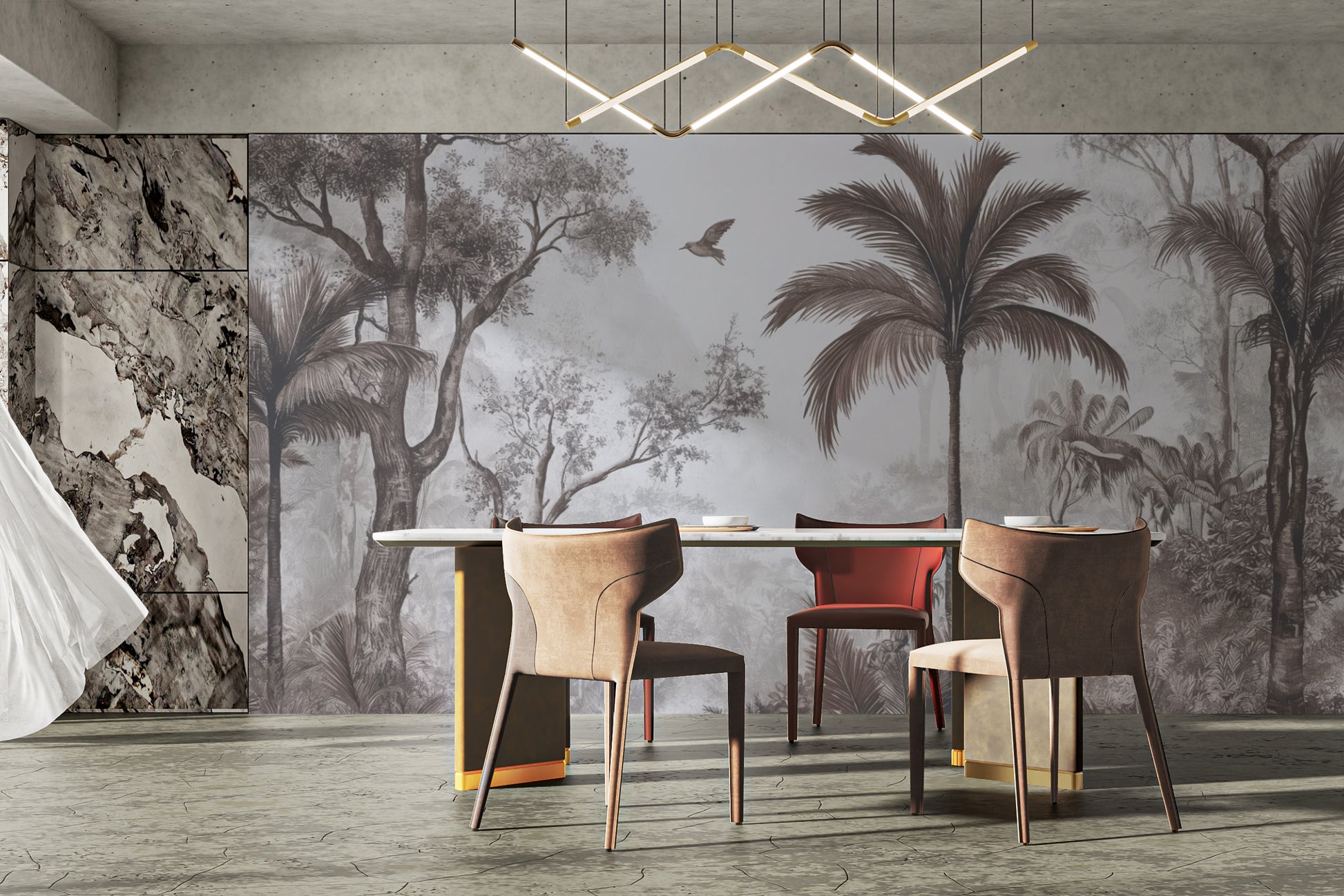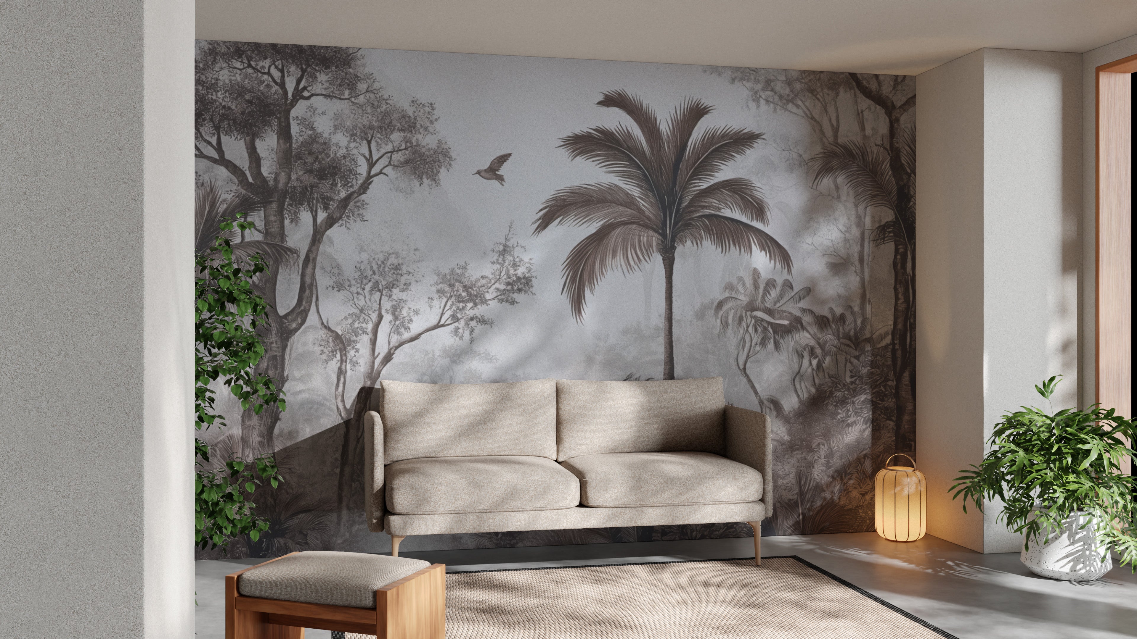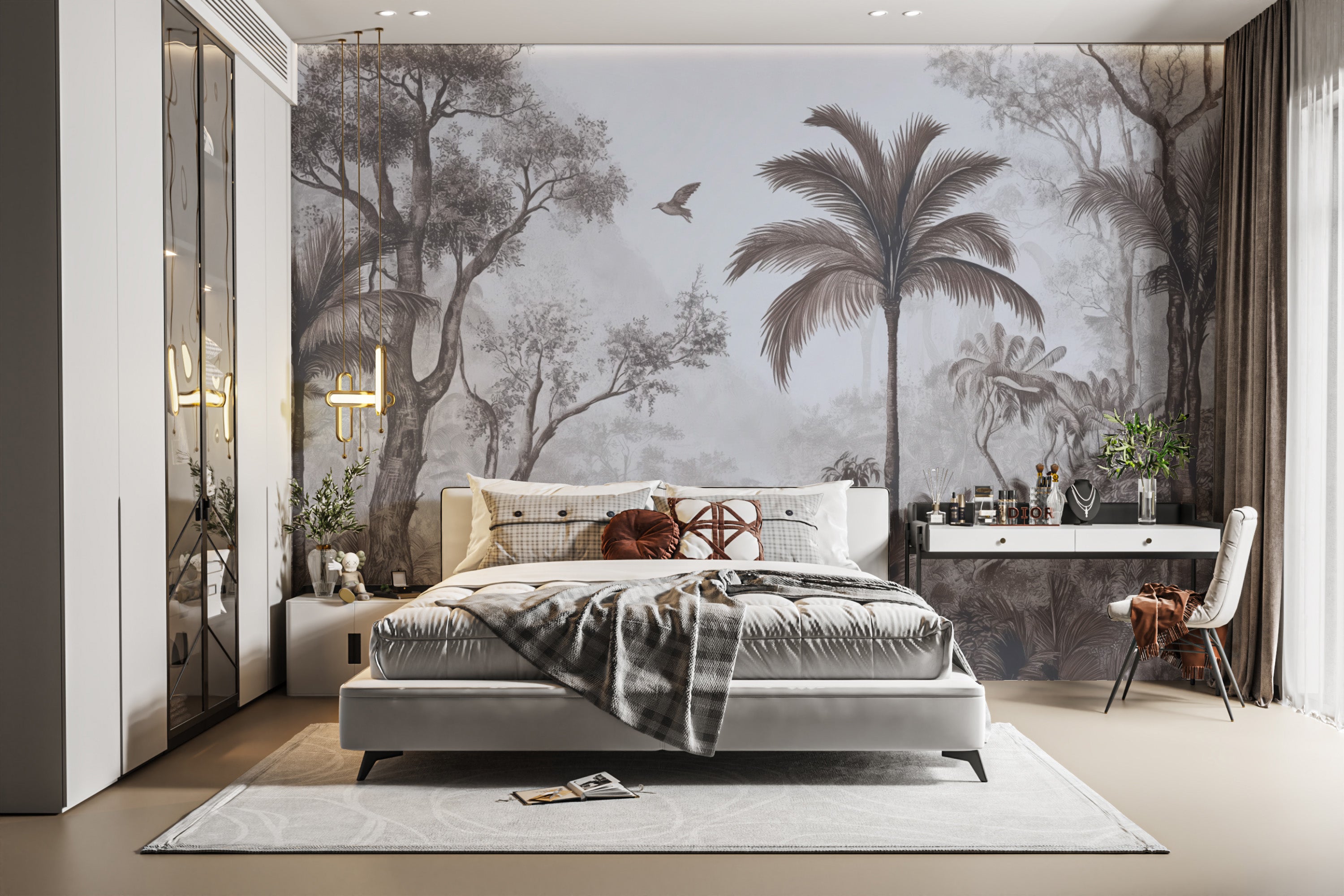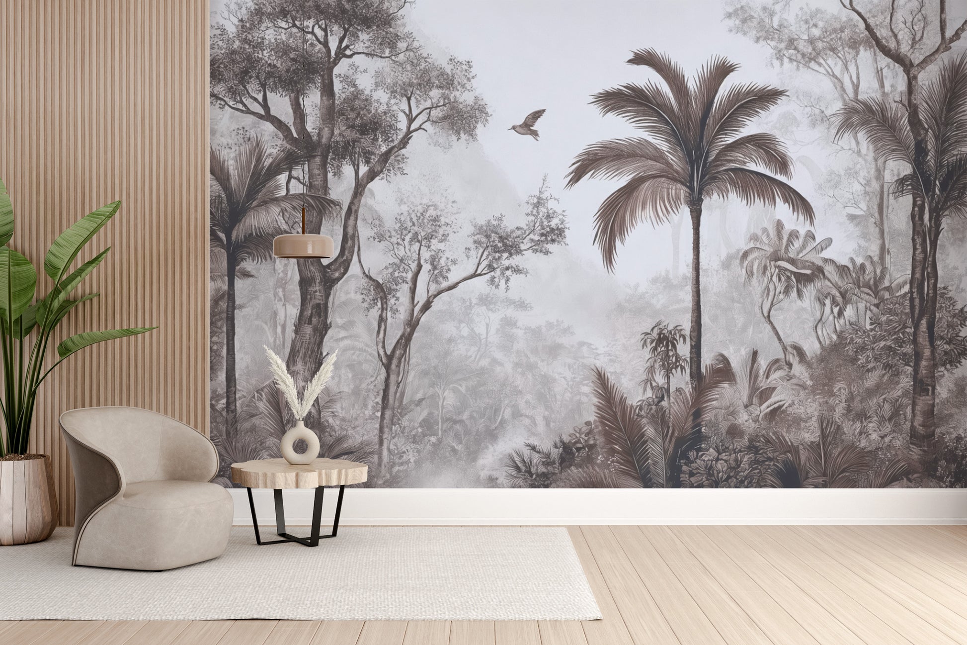Bring nature's beauty indoors with the vintage tropical jungle mural. This design creates a peaceful setting with lush palm trees, misty rainforest details, and a hand-drawn aesthetic. The monochrome botanical wallpaper blends effortlessly with various interiors, making it perfect for bedrooms, living rooms, or offices. The sepia jungle wall art offers a timeless appeal, adding depth and elegance to walls. Crafted with high-quality materials, this tropical paradise mural enhances any space with its exotic charm. Perfect for those who appreciate nature-inspired wall coverings, this tropical jungle wallpaper brings the serenity of the rainforest into everyday life.