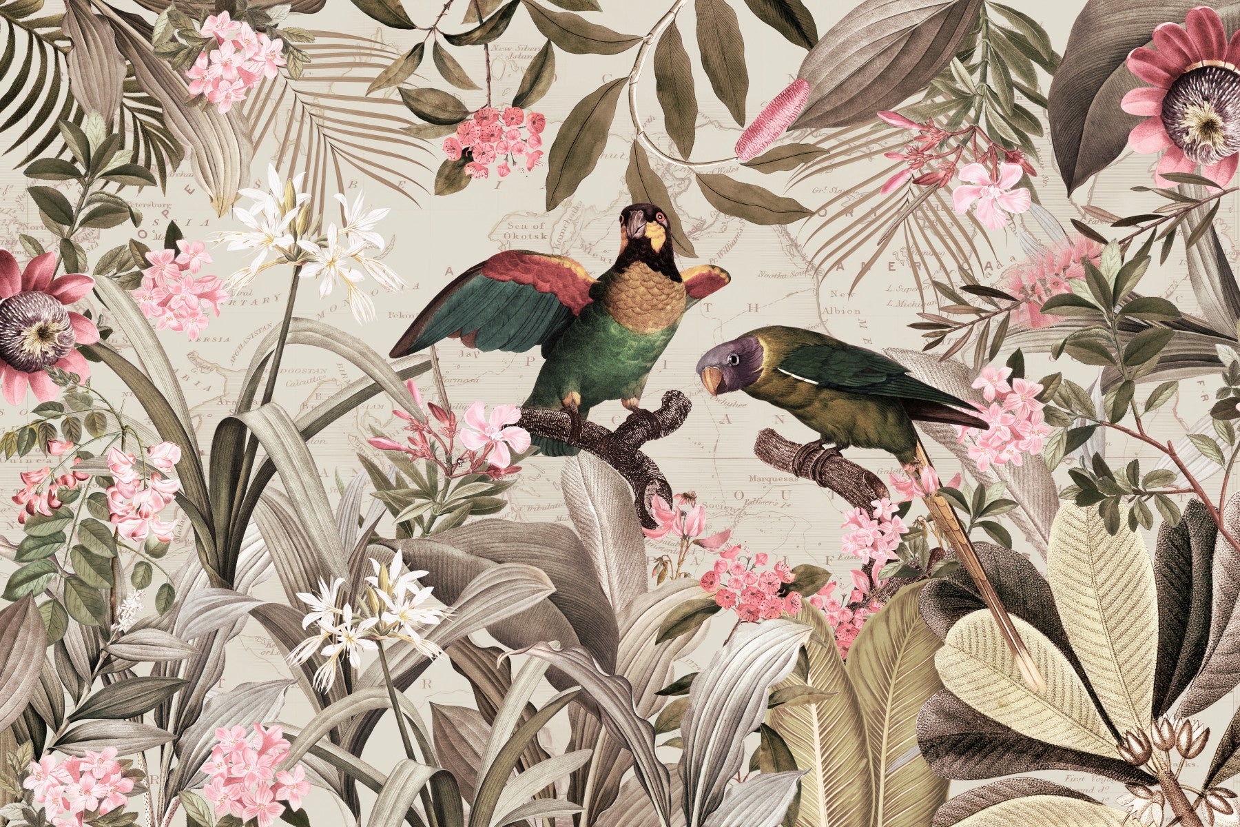 Embark on a whimsical journey with our 'Vintage Voyage' wallpaper. This captivating design blends the allure of vintage cartography with the vibrant beauty of tropical flora and fauna. Intricate botanical illustrations, including lush palm leaves, delicate pink blossoms, and exotic flowers, intertwine seamlessly with a faded antique world map. Two charming parrots perch amidst the foliage, adding a touch of playful elegance. The muted greens, pinks, and beige tones create a serene and sophisticated atmosphere, perfect for adding a touch of vintage charm and wanderlust to any room.