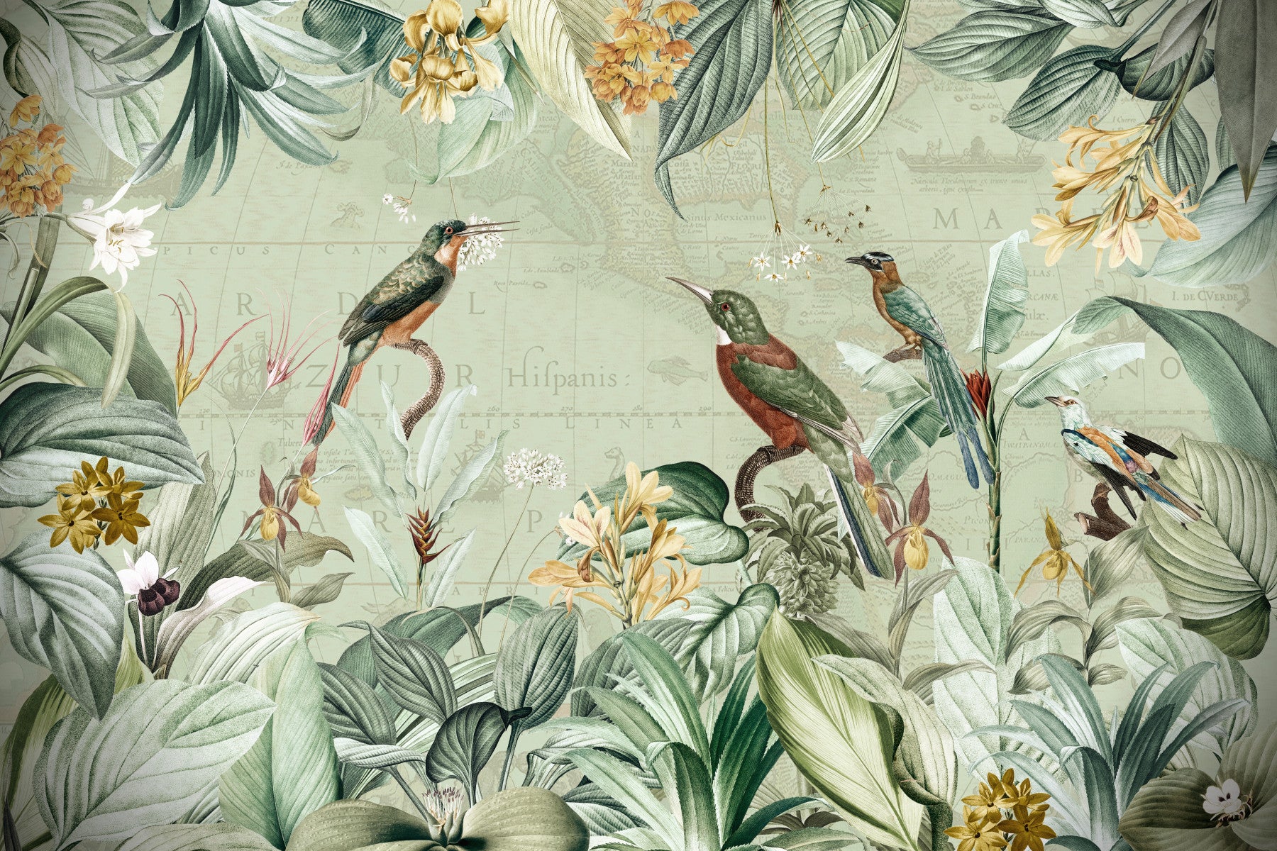 Embark on a visual journey with this exquisite wallpaper, a breathtaking blend of vintage cartography and lush tropical flora and fauna. Intricate botanical illustrations of exotic orchids, vibrant foliage, and a variety of striking birds are meticulously arranged against a faded world map backdrop. The muted greens, soft browns, and touches of gold create a serene and sophisticated atmosphere, perfect for adding a touch of old-world charm and exploration to any space. This wallpaper is a captivating statement piece that transports you to a bygone era of discovery and natural beauty.