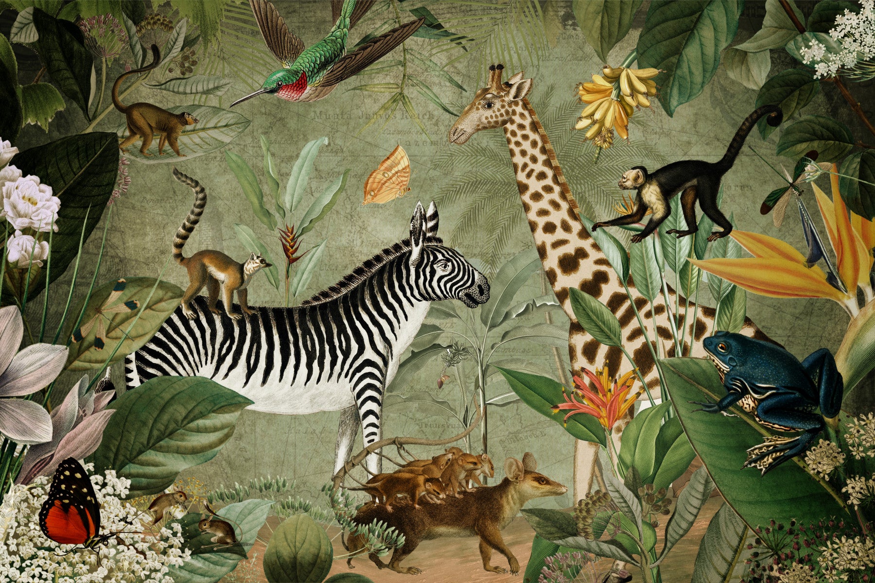 Immerse yourself in the lush serenity of 'Whispers of the Jungle,' a captivating wallpaper design. Intricate botanical illustrations intertwine with a vibrant array of exotic animals, creating a scene both whimsical and sophisticated. A muted green backdrop provides a calming contrast to the rich hues of the flora and fauna, evoking a sense of tranquil exploration. From a graceful giraffe to a playful zebra carrying a lemur, each element is rendered with meticulous detail, transforming any space into a hidden paradise. The antique map subtly woven into the background adds a layer of mystery and adventure, hinting at untold stories within the dense foliage. This wallpaper is perfect for those seeking a unique and enchanting escape within their own homes.
