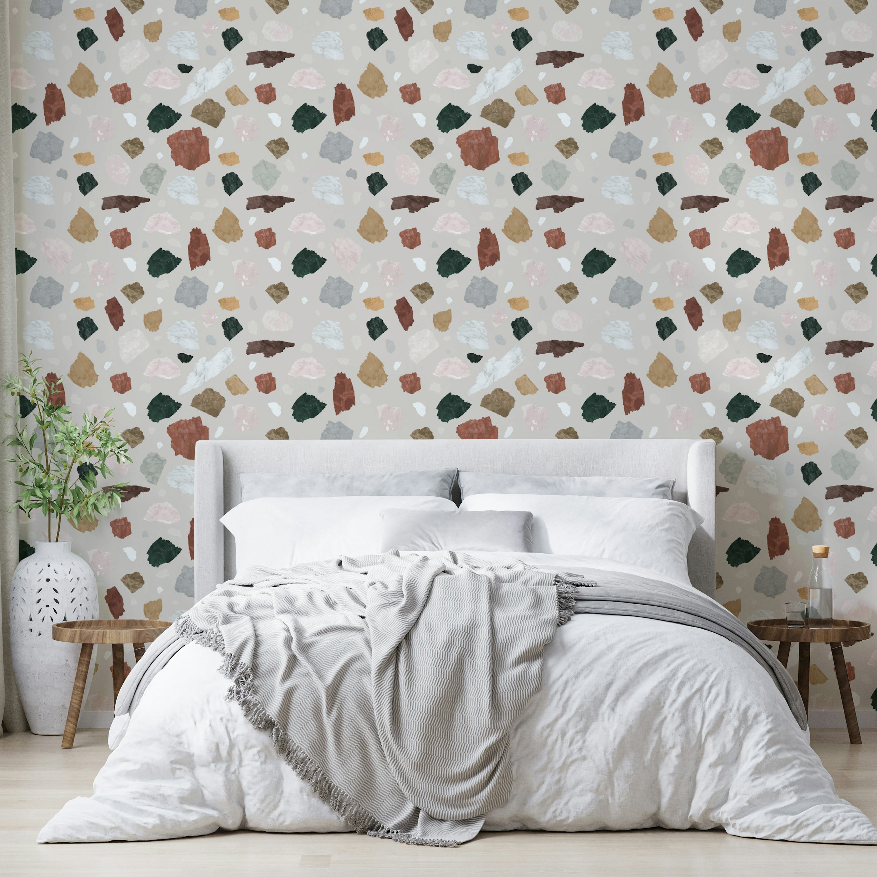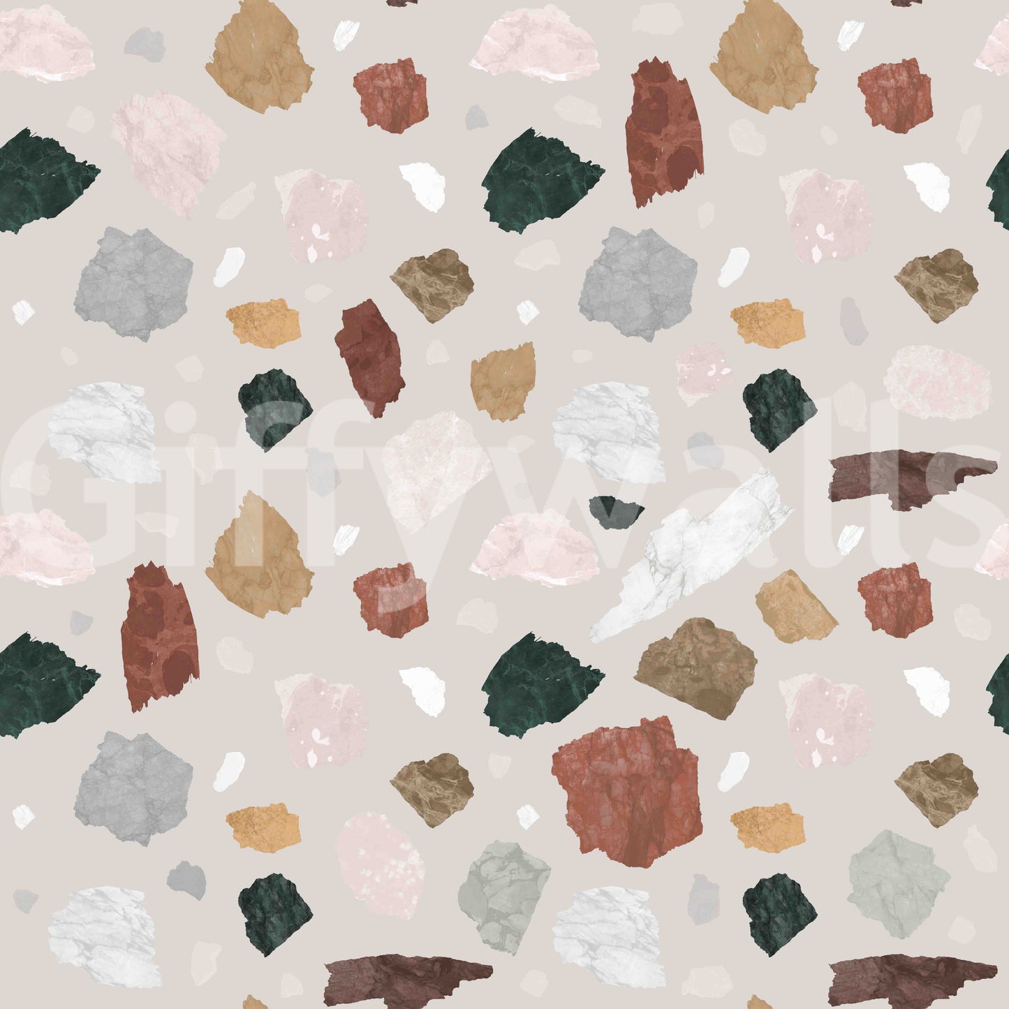 Inspired by the timeless elegance of terrazzo and the architectural principles of Vitruvius, this wallpaper presents a harmonious blend of form and texture. Earthy hues of terracotta, ochre, and muted greens are scattered across a soft, neutral backdrop, evoking the natural materials favored in classical design. The irregular shapes suggest fragments of ancient stone or marble, creating a subtle sense of depth and visual interest. 'Vitruvio' embodies understated sophistication, ideal for adding a touch of refined warmth to any space.
