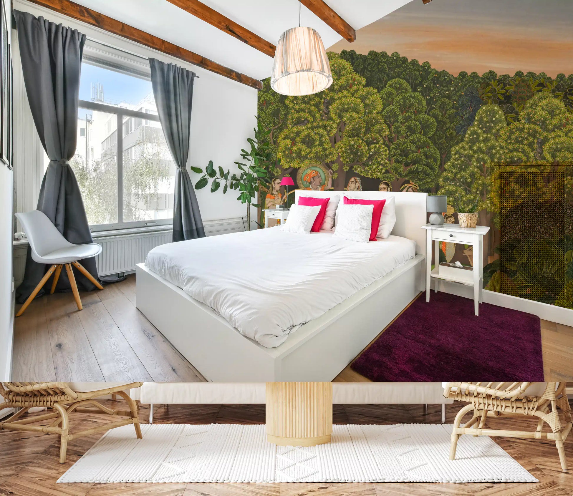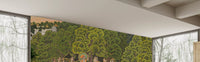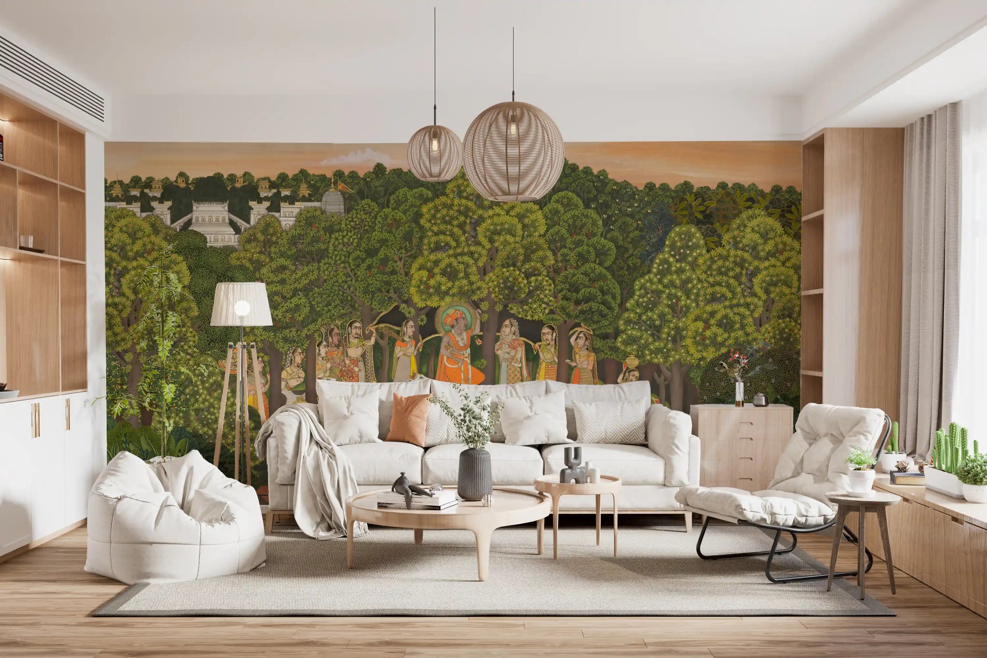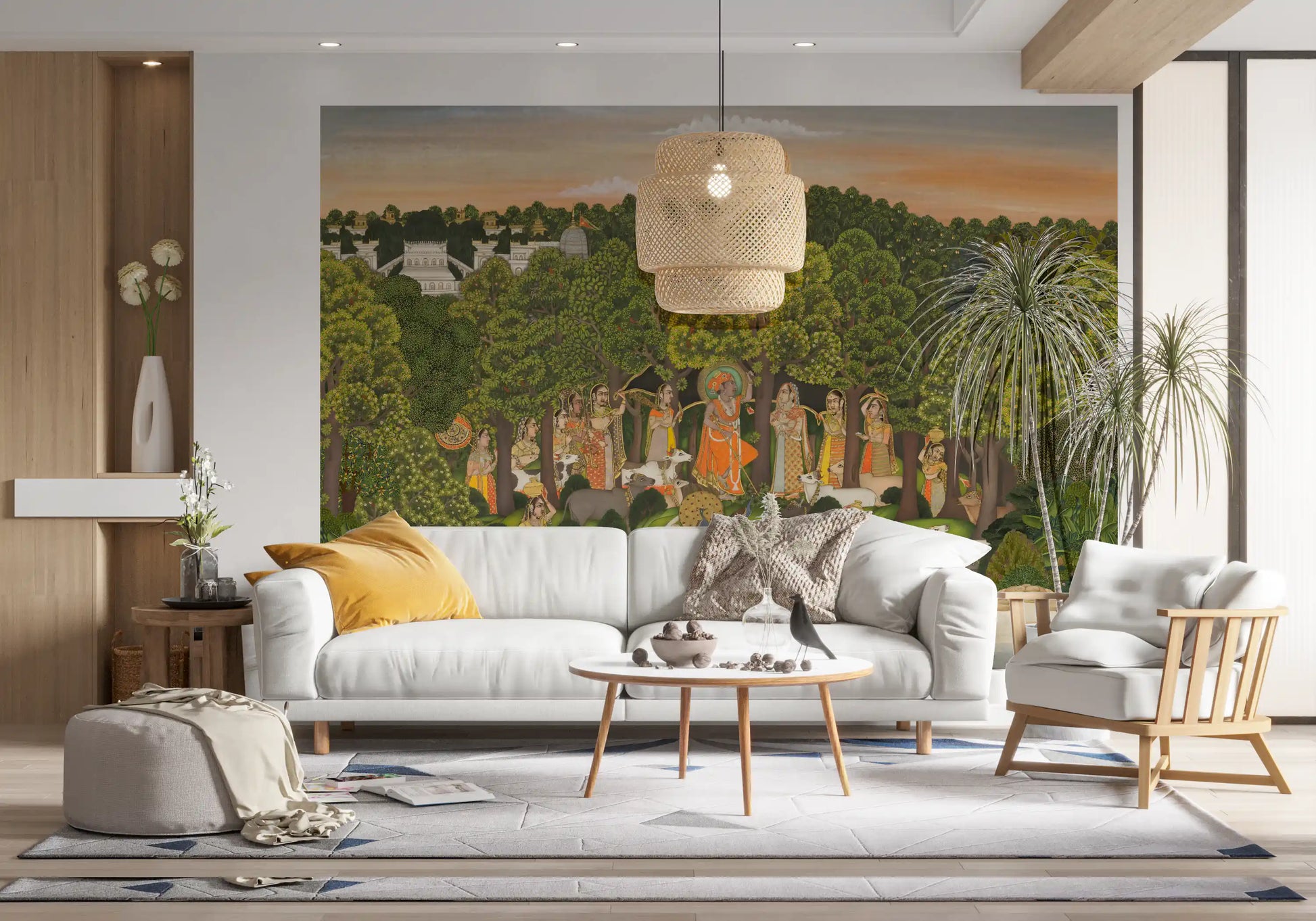 This exquisite wallpaper for walls transforms any room into a serene Indian landscape. It showcases a vibrant scene inspired by traditional miniature paintings, featuring a lush green forest where gopis gather around Lord Krishna amidst grazing cows and playful peacocks. The rich colour palette combines deep emeralds and leafy greens with warm oranges, golds, and subtle blues, creating an inviting visual tapestry. Fine details, from the intricate attire of the figures to the distant palace architecture, reflect a timeless artistic heritage. This design introduces cultural depth and historical charm, making it perfect for a distinguished living room, an elegant dining area, or a tranquil study. It infuses your space with calm and a unique, story-rich ambiance.