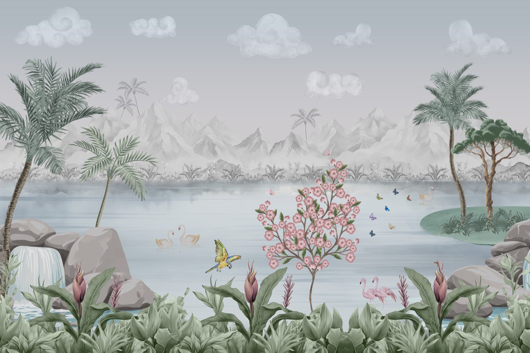 Create a dreamy escape within your home with this ethereal design. The scene showcases a placid lake, delicate pink blooms, and exotic birds amidst a mountain backdrop. Soft grays and greens are balanced by blush tones, providing a calming effect. Perfect as wallpaper for walls in a bedroom, living room, or entryway, this design brings a touch of paradise indoors. Enhance your interior décor with this elegant design.