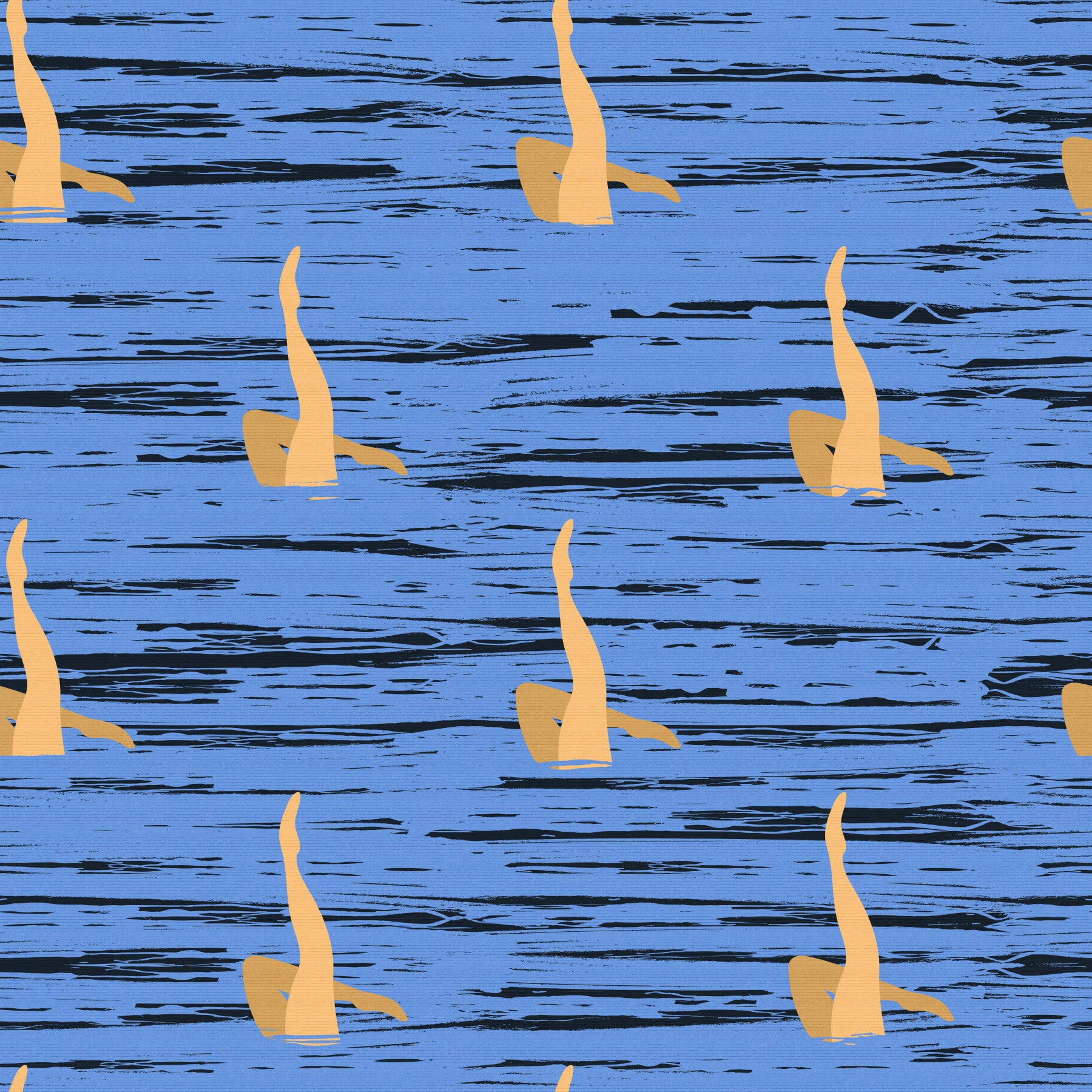Bring artistic movement to your walls with this unique pattern. Simplified figures perform water ballet against a blue background marked with dark, abstract strokes. The design feels modern and a bit retro. Ideal wallpaper for walls in spaces where you want a calm yet distinctive atmosphere. Consider it for a living room, study, or even an entryway to infuse a space with artistic flair. The design works well with clean, contemporary decor.