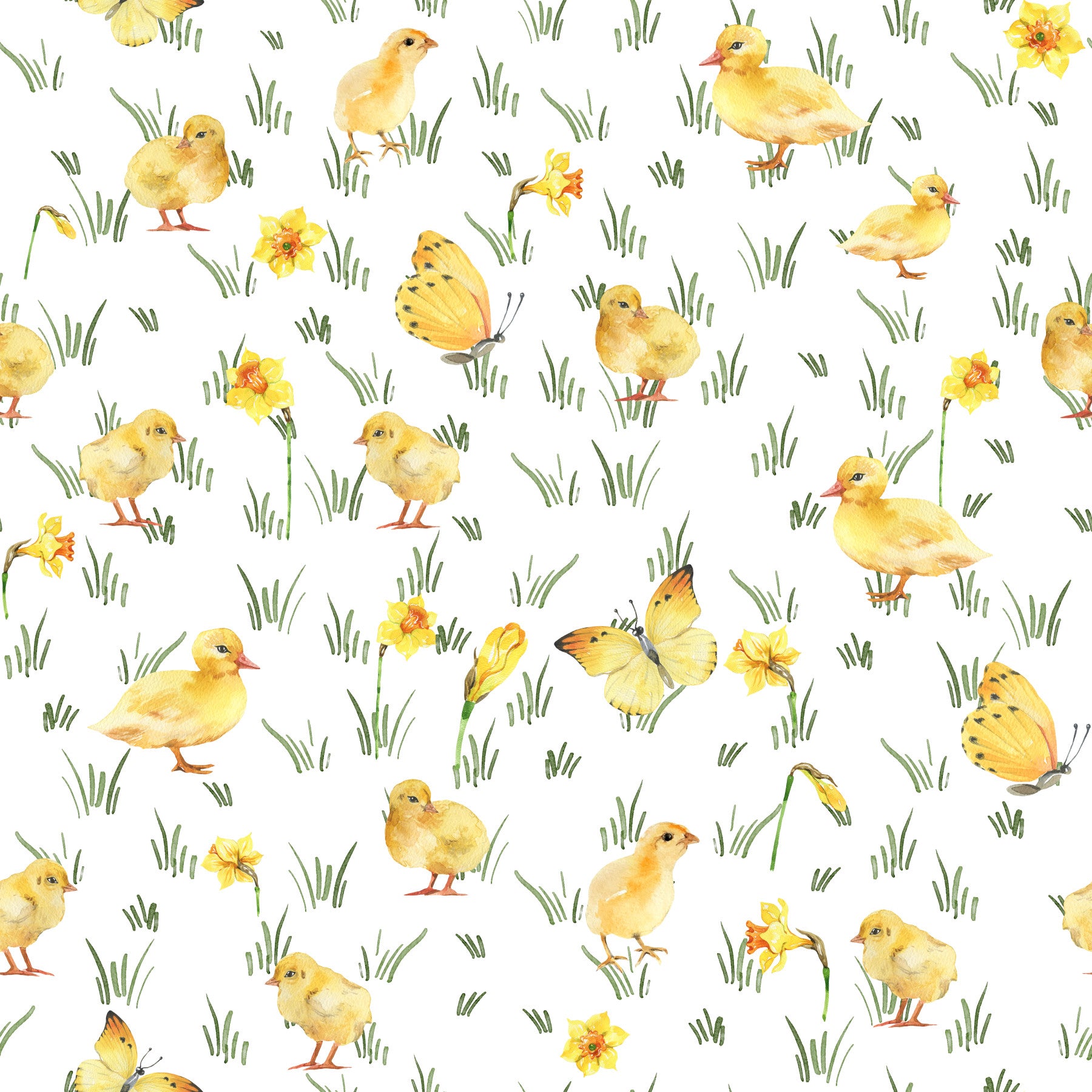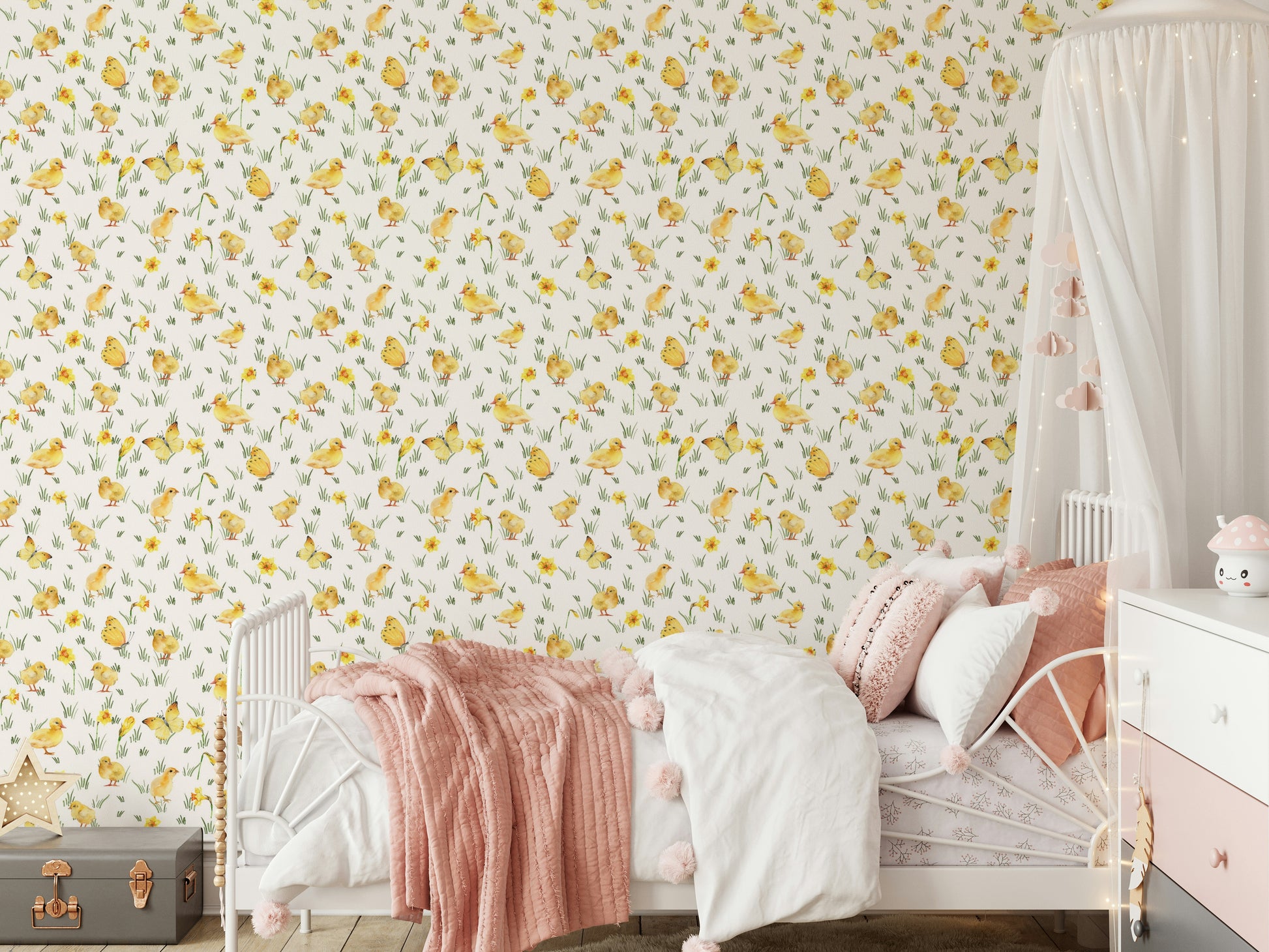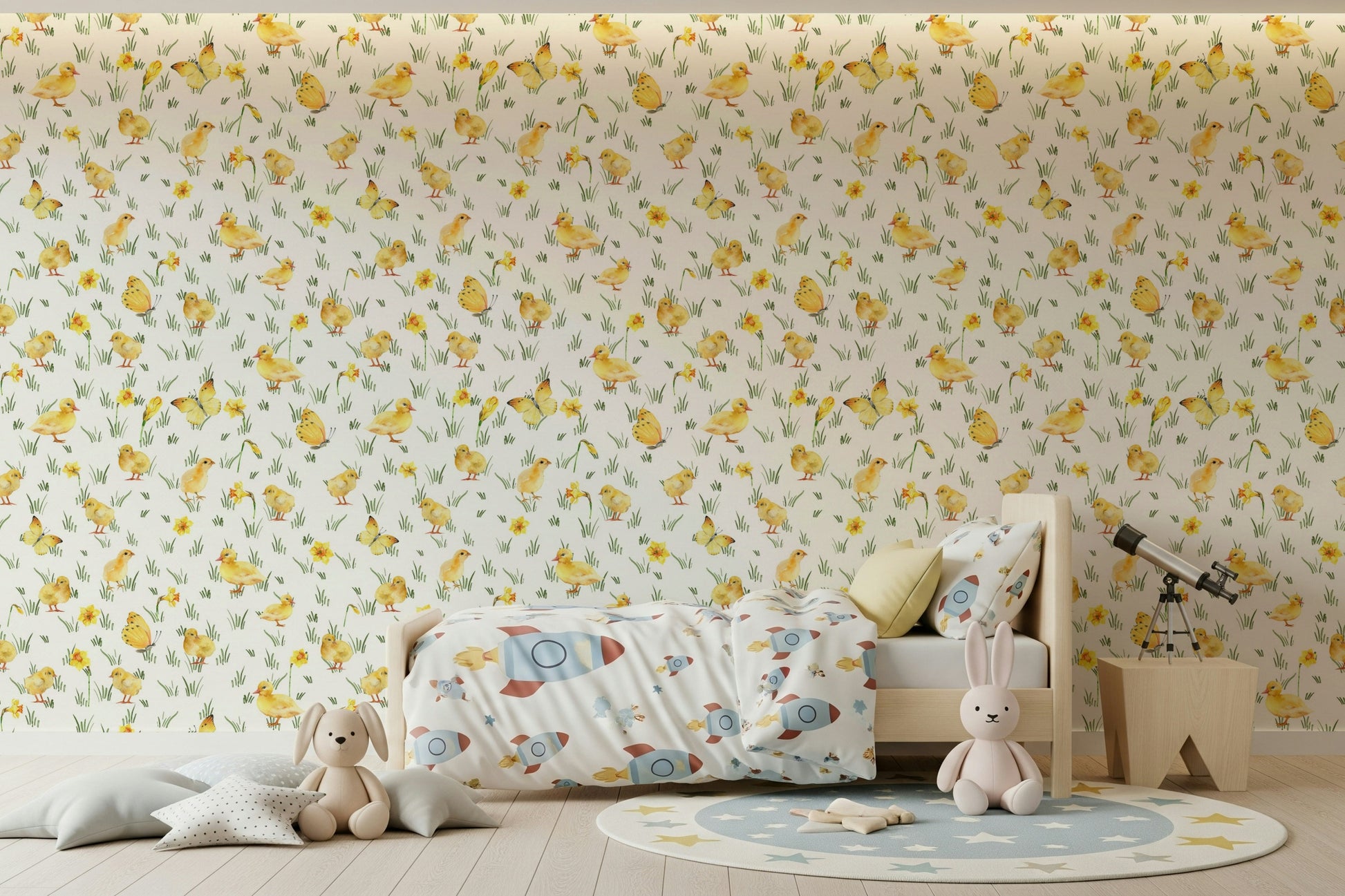Capture the essence of Easter and springtime with this charming wallpaper by Uta Naumann. Yellow chicks, ducklings, and butterflies playfully interact with watercolour daffodils. This design offers a gentle colour palette, making it ideally suited for a kid's room, nursery, or play area. The hand-painted style adds a touch of whimsy and sophistication. This wallpaper for walls creates a joyful, lighthearted mood, easily complementing Scandinavian, minimalist, and cottagecore interiors. Bring the beauty of spring indoors with this engaging and heartwarming wallpaper.