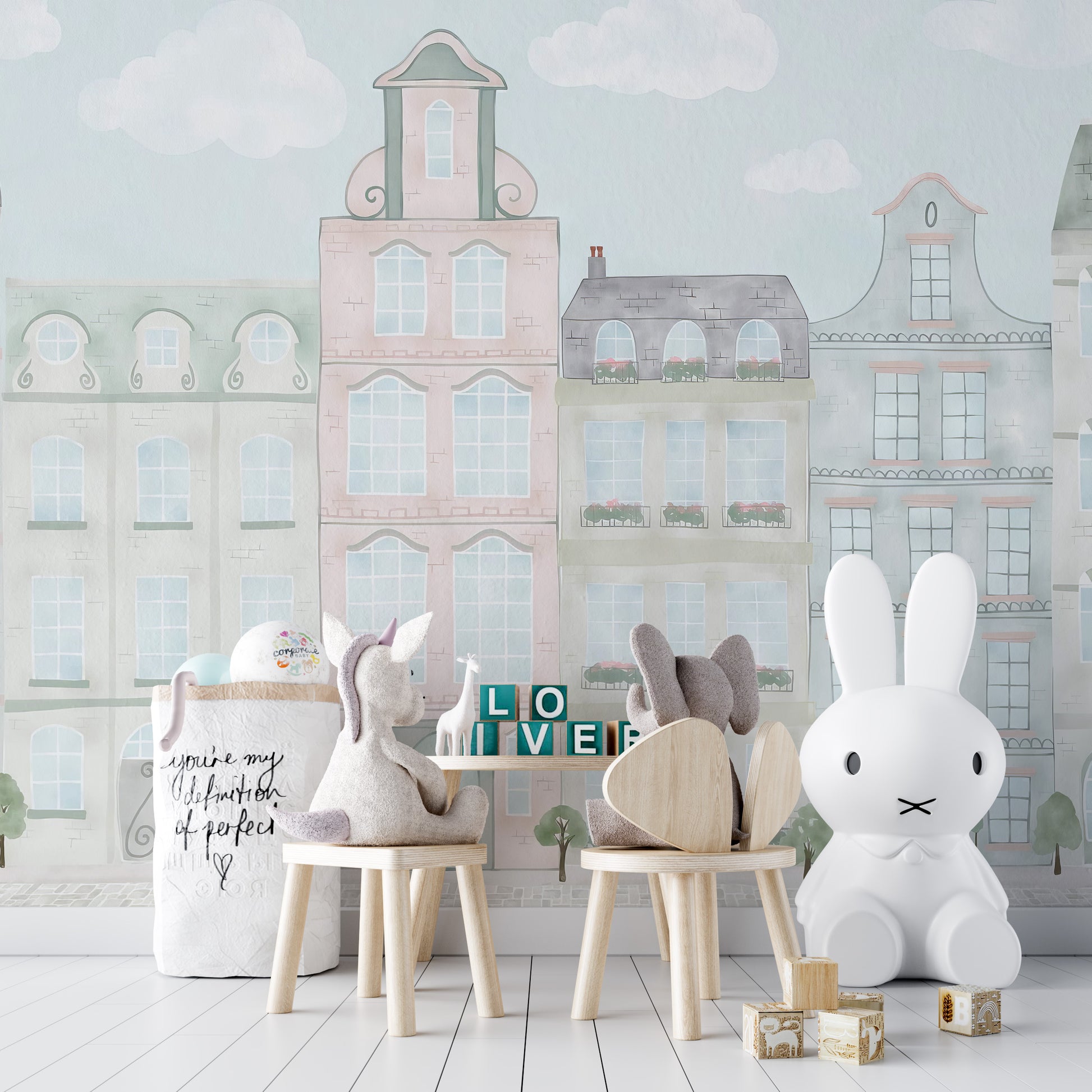 Soft cityscape wallpaper for baby rooms