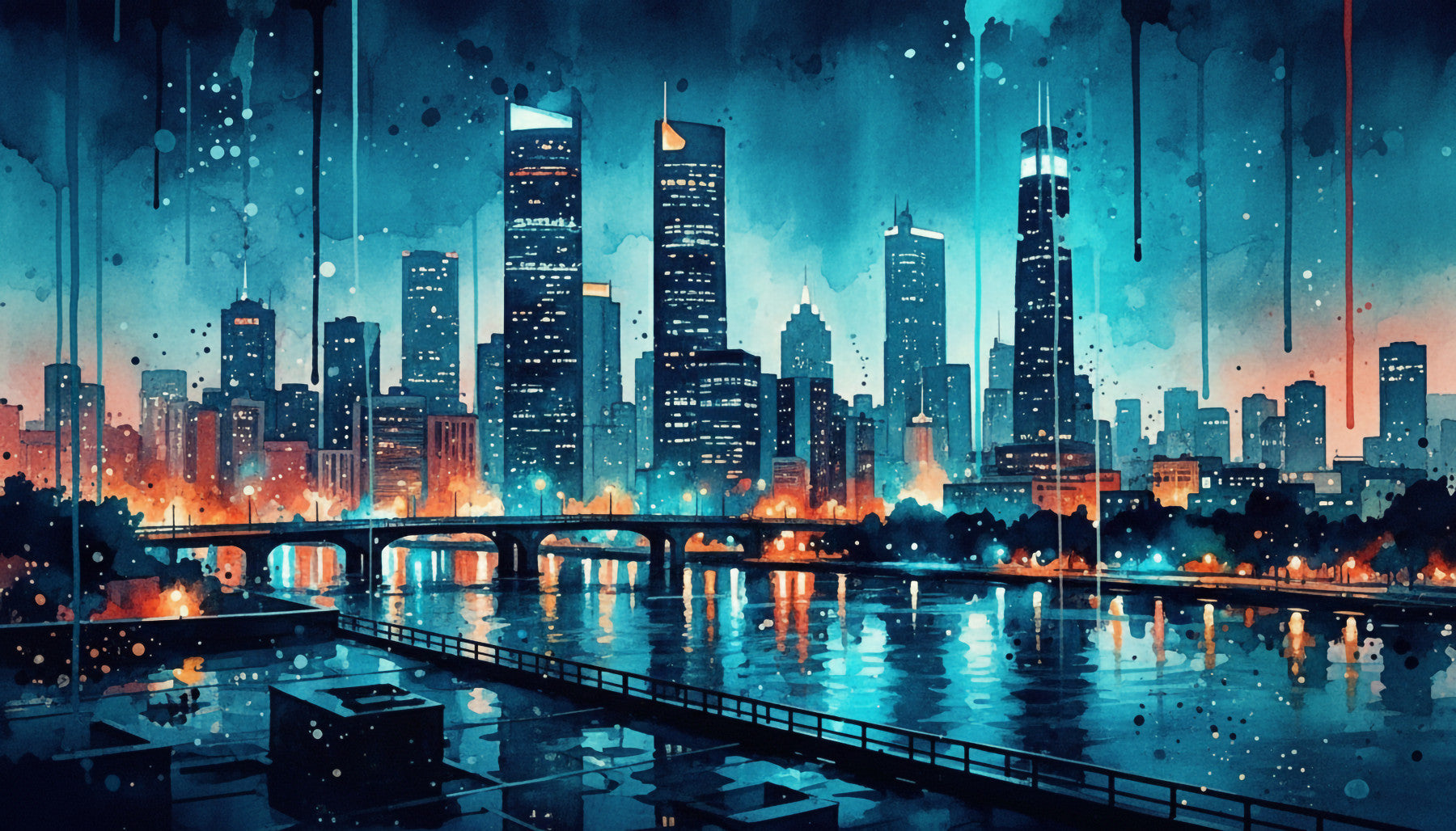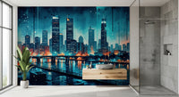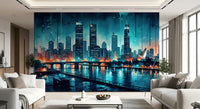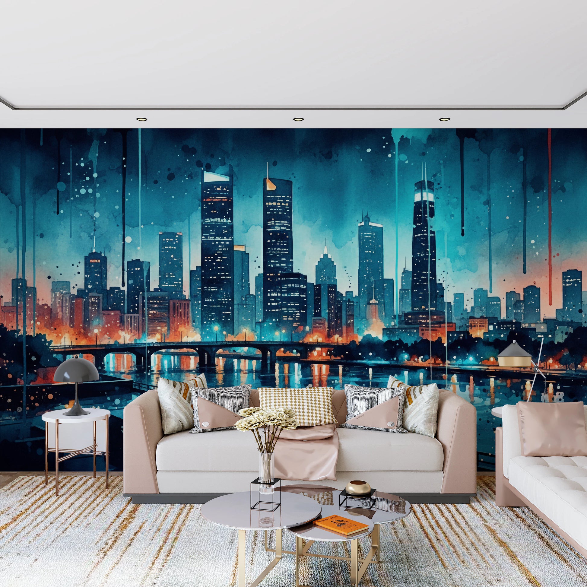 Transform your living space with this captivating cityscape rendered in delicate watercolour. The design features a stunning skyline with skyscrapers reflected in a shimmering river, all awash in hues of blue, orange, and teal. This wallpaper for walls brings urban sophistication and artistic flair to any room. Ideal for a modern living room, a stylish home office, or a chic dining room, this design creates a focal point that is both dramatic and calming. The brushstroke effect adds depth and texture, making your walls a true work of art. It enhances depth in smaller spaces and adds elegance to larger rooms.