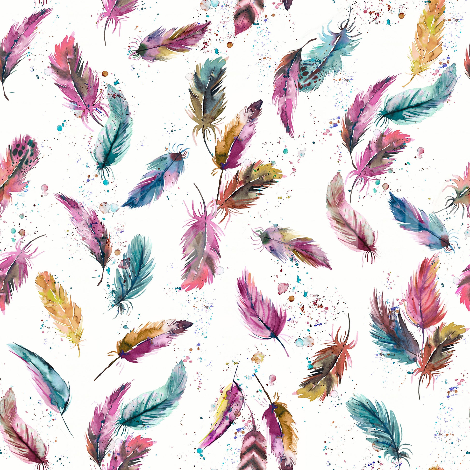 Embrace a vibrant and whimsical world with this "Watercolor Feathers Multicolor" wallpaper. A captivating array of delicately painted feathers in a spectrum of jewel tones – pinks, purples, teals, and golds – dances across a crisp white background. The watercolor effect lends a soft, ethereal quality, while scattered paint splatters add a touch of playful energy and movement. This design is perfect for adding a touch of bohemian elegance and artistic flair to any digital device, creating a mood of serene beauty and captivating freedom.
