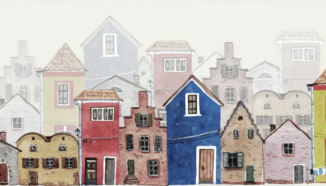 Hand-painted watercolor houses wallpaper for cozy interiors