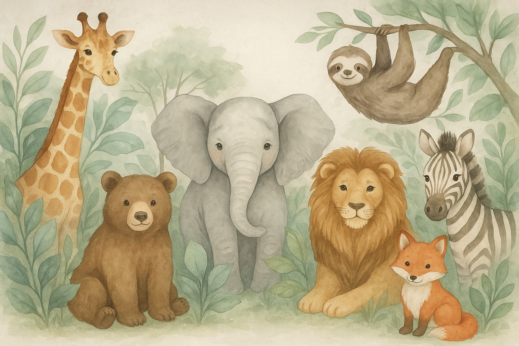 Step into a whimsical world with this charming watercolor wallpaper featuring a delightful ensemble of jungle animals. A gentle giraffe, a playful bear, a serene elephant, a majestic lion, a clever fox, a curious zebra, and a relaxed sloth come together in a composition that evokes a sense of friendship and tranquility. Rendered in soft, muted tones and a painterly style, this wallpaper brings the magic of the wild into any space, especially suitable for a nursery or kids' room.