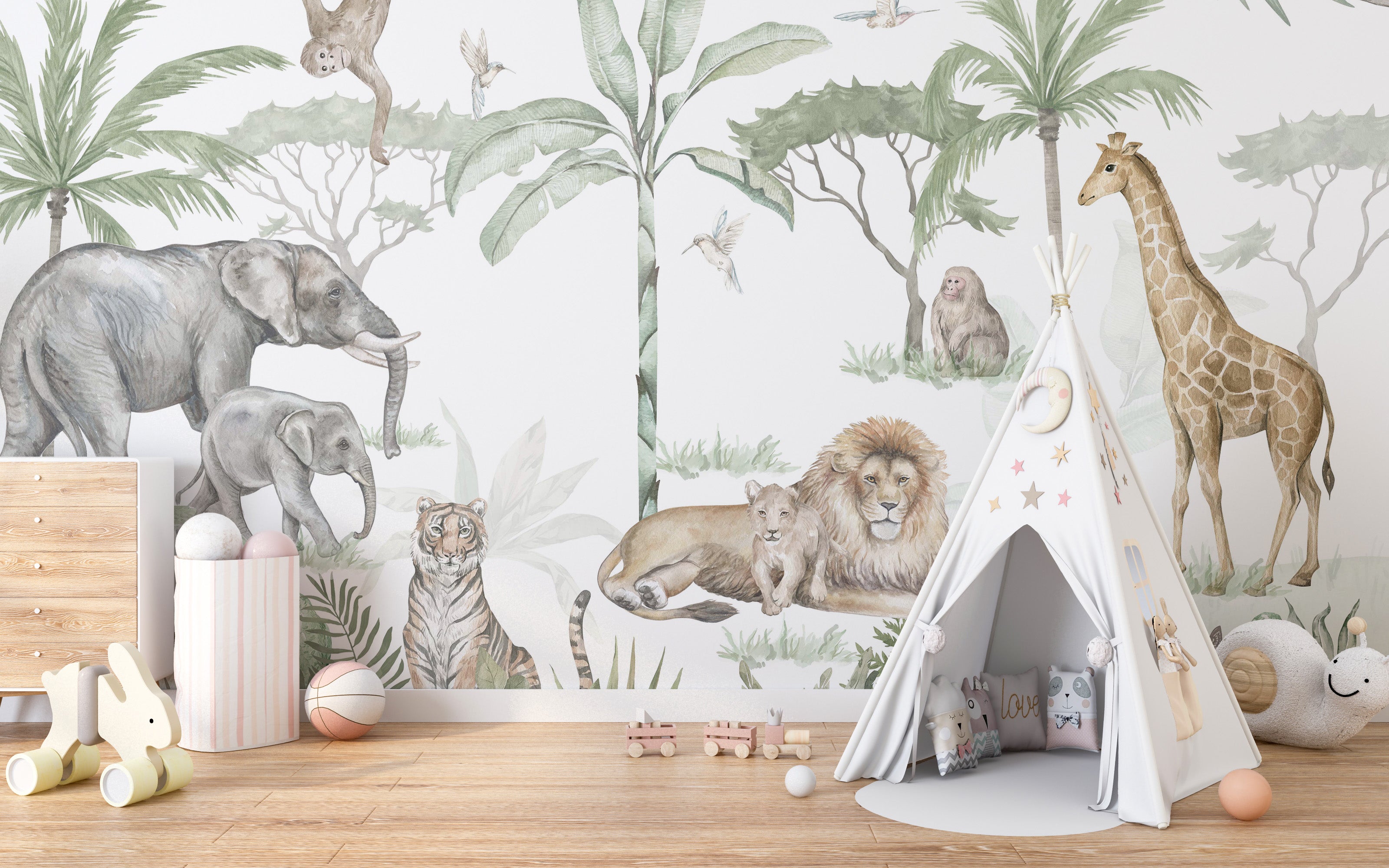 Watercolor Jungle Safari Wallpaper turns your place into a perfect and relaxing wildlife refuge. With its hand-painted safari animals like elephants, giraffes, lions, and monkeys, this jungle wallpaper gives a fun feel to children's nurseries or rooms. Its soft watercolor jungle mural design and lush foliage create a tranquil ambiance-a perfect canvas for any nature-themed decor. Easy to apply and peel and stick jungle wallpaper offers the additional advantage of convenient installation. The safari nursery wallpaper adds some excitement and sophistication to the wild within your home. For the birth of the enchanted tropical animal wallpaper-a must-have for nature lovers!