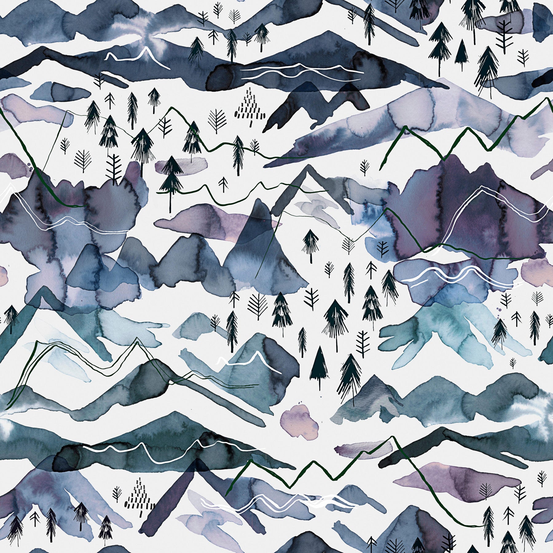 Hand-painted mountain wallpaper in cool blue and dusty mauve.