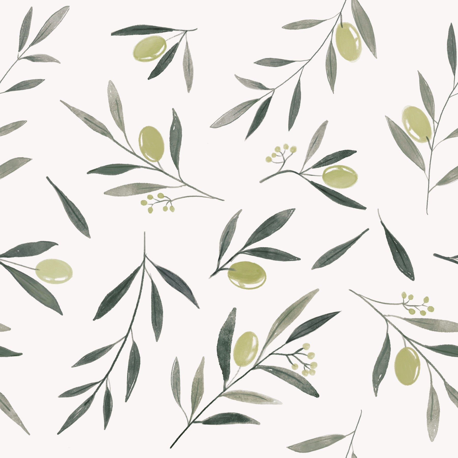 Botanical wallpaper featuring olive leaves and fruit in soft watercolor tones.