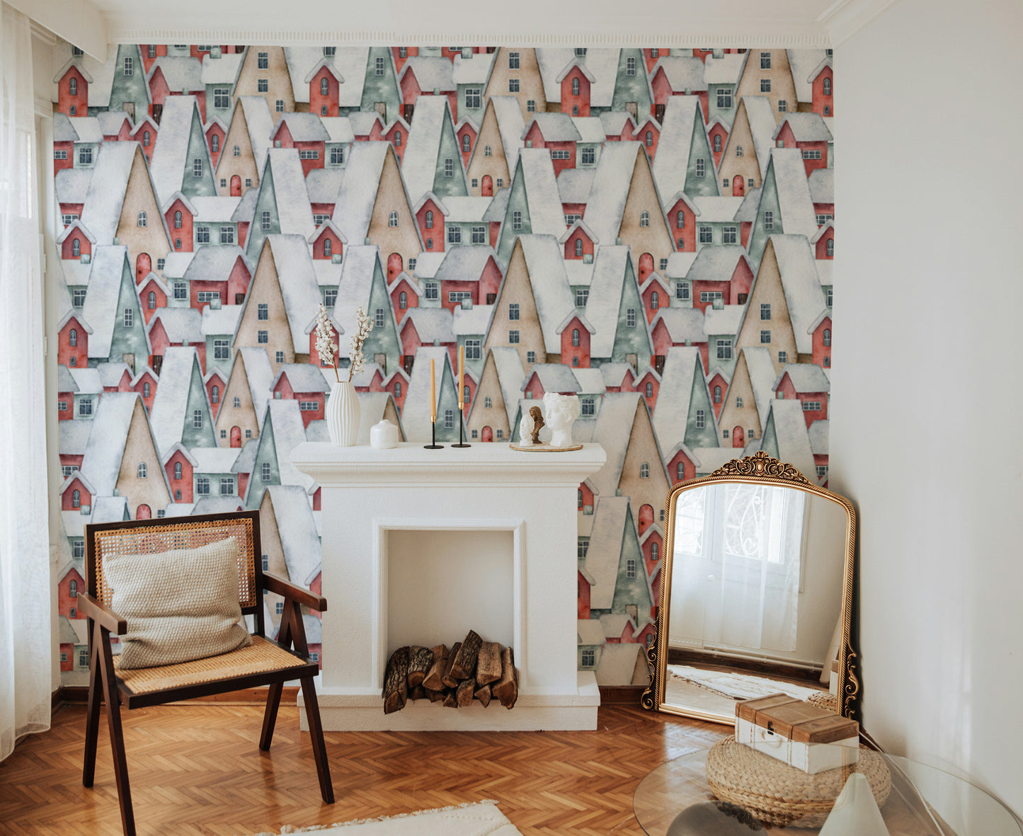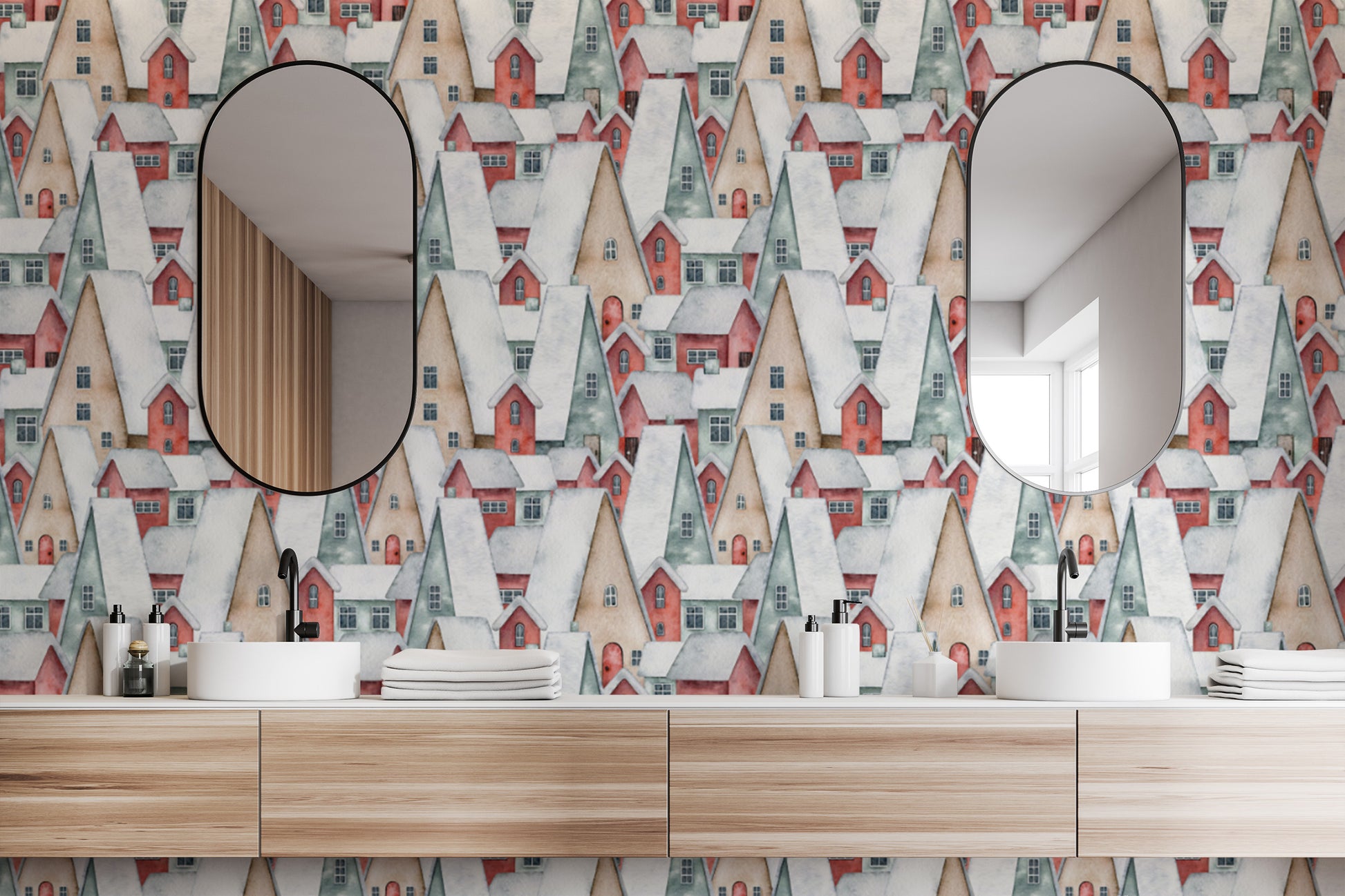 Create a cozy winter retreat with this watercolor snowy village wallpaper. Featuring a seamless pattern of charming houses with snow-covered rooftops, the design captures the warmth of a festive holiday town. Soft pastel hues blend beautifully, bringing a peaceful winter wonderland aesthetic to any space. The intricate Christmas town pattern offers a timeless seasonal charm, perfect for bedrooms, living rooms, or nurseries. Inspired by scandinavian winter houses, this wallpaper enhances interiors with a serene, storybook feel. The holiday town wallpaper is ideal for those who love classic winter themes. Let the magic of a snowy village surround you.