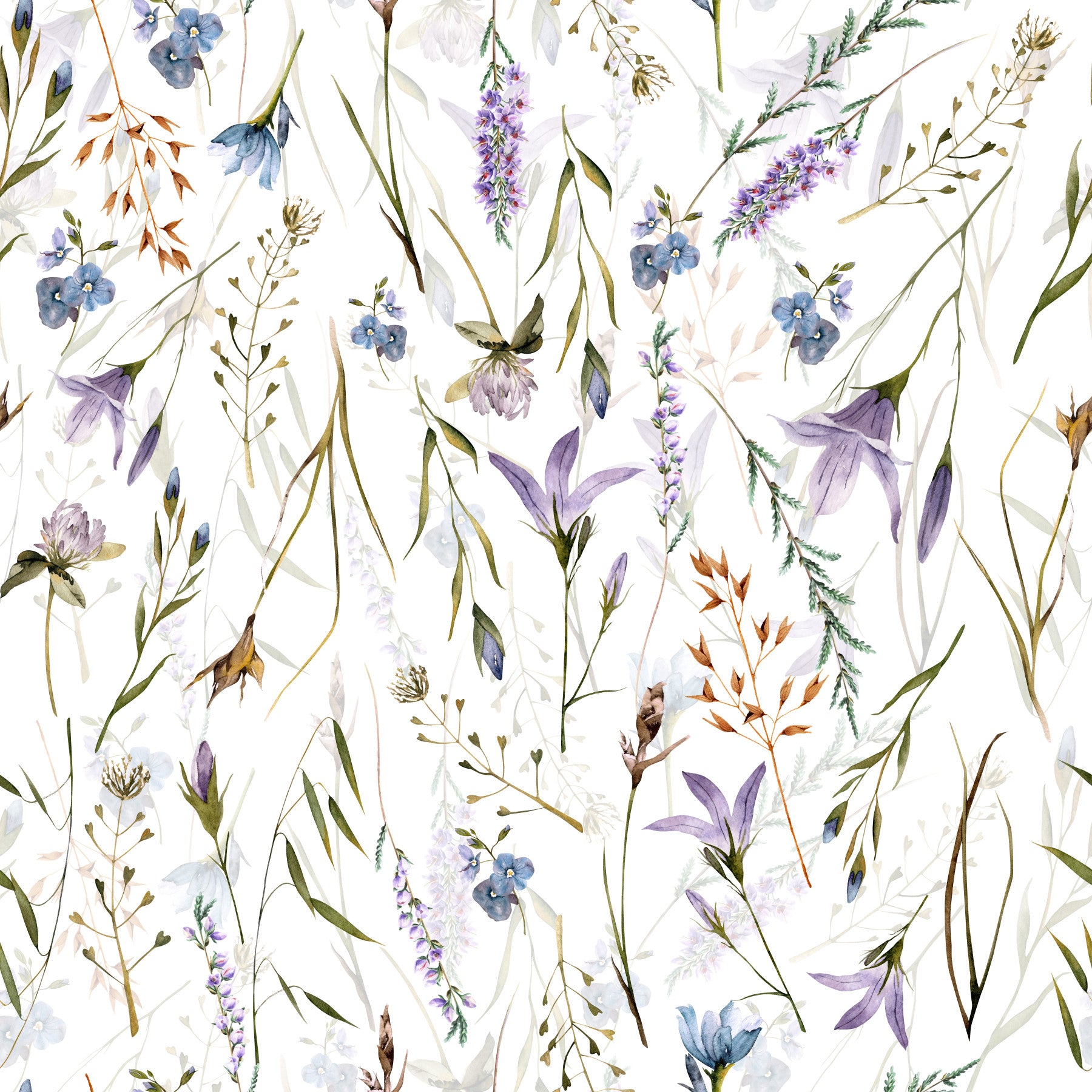Bring the serene beauty of a wildflower meadow indoors with this delicate watercolour design by Uta Naumann. Light blues and soft purples blend harmoniously with the greens of the stems and leaves, all set against a bright white backdrop. This floral design works wonders as wallpaper for walls, adding a touch of nature's tranquility to living rooms, bedrooms, or even hallways. It complements Scandinavian, farmhouse, and cottagecore interiors perfectly, creating a restful, inviting space. The repeat pattern offers a continuous flow of floral beauty.