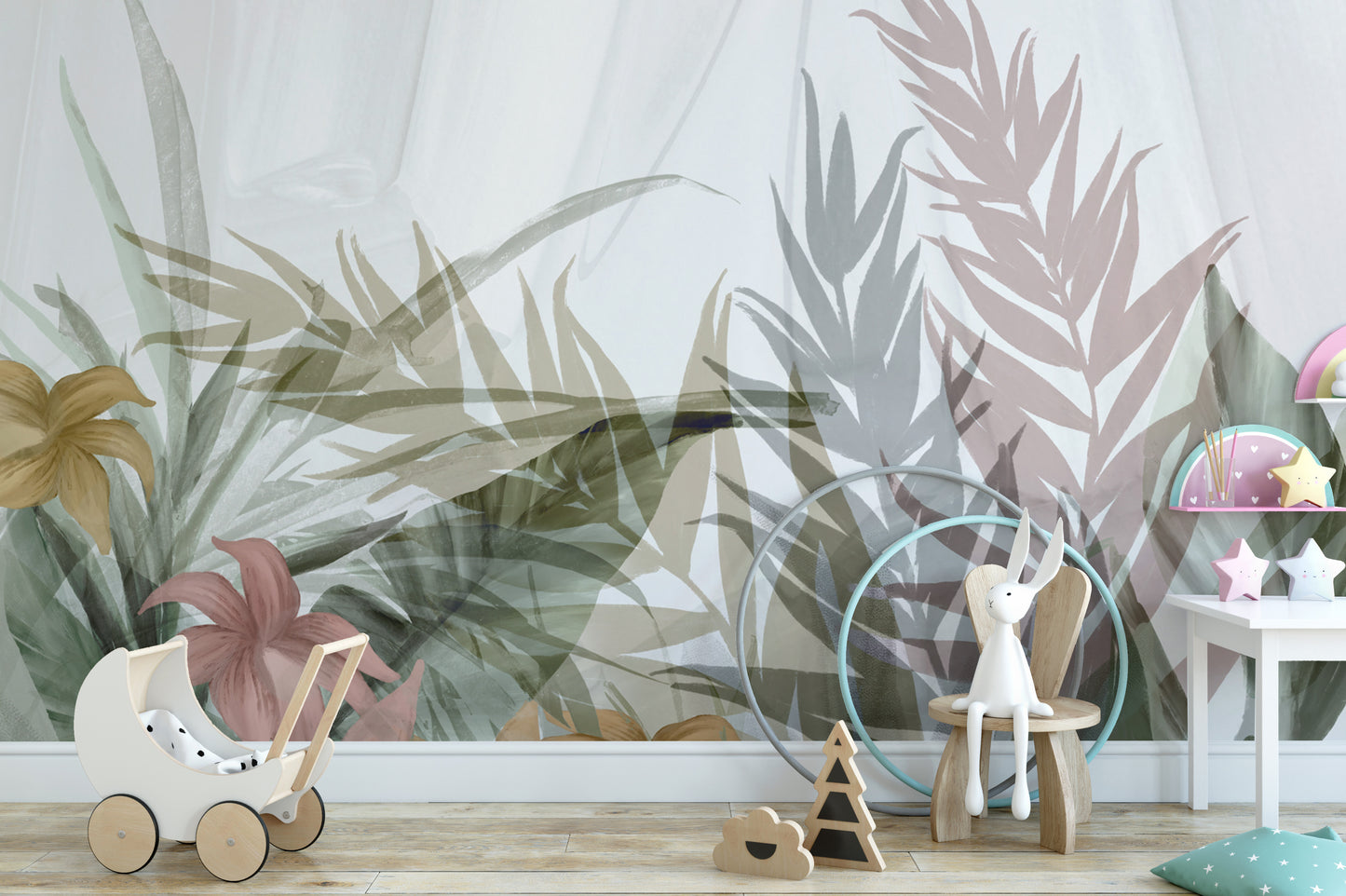 Refresh your interiors with watercolor tropical leaf wallpaper. This botanical mural brings a natural vibe to any room, featuring soft, hand-painted tropical leaves and flowers in earthy tones. The muted greens, pinks, and beiges create a calming, modern look, perfect for living rooms, bedrooms, or offices. The watercolor leaf wallpaper blends effortlessly with bohemian and minimalist styles, while the muted floral wall covering adds a subtle touch of elegance. Ideal for nature lovers, this nature-inspired wallpaper for walls brings the beauty of the outdoors inside, offering your space a fresh, organic look.