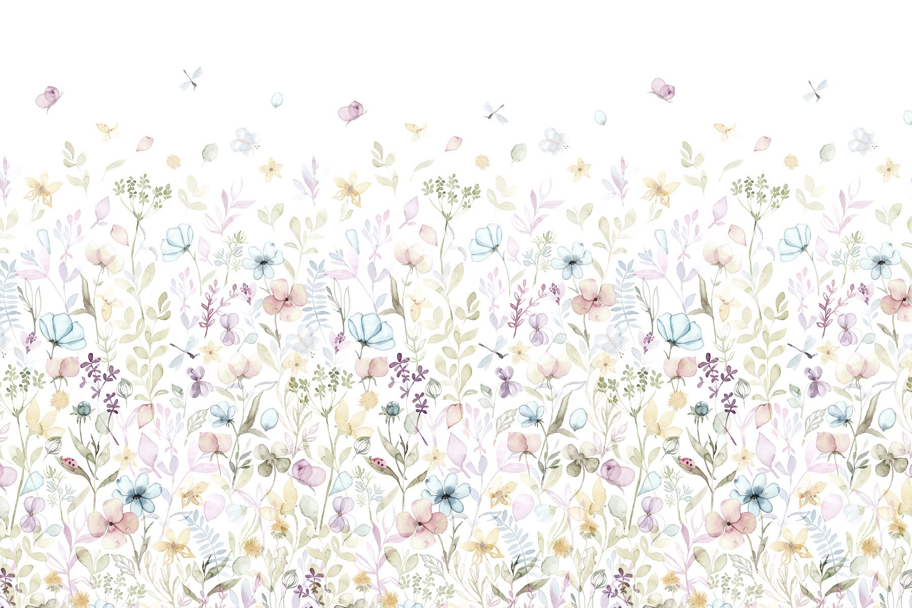 A light and airy wallpaper with hand-painted pastel flowers arranged in a gentle meadow pattern.