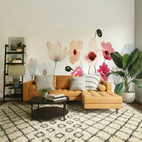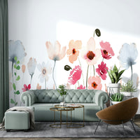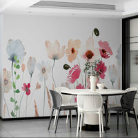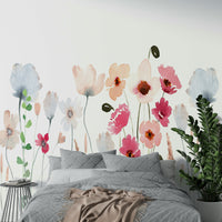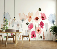 This wallpaper showcases a delicate watercolor painting of a wildflower wallpaper. Soft blush pinks, gentle blues, and muted earth tones create a serene and calming atmosphere. The hand-painted style adds a touch of whimsical artistry, perfect for bedrooms, living rooms, or any space needing a touch of peaceful elegance. The simplistic yet detailed flowers and grasses evoke a sense of tranquility and natural beauty, making it a versatile choice for various interior design styles.