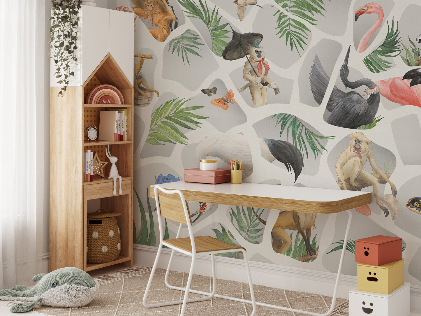 Step into the jungle with this unique watercolour wallpaper featuring a gray monkey and a flock of vividly colored birds. Perfect for a playful playroom or a bedroom with a whimsical touch, this wallpaper will transport your space to a lush, tropical setting. The intricate details of each stroke of the watercolour paint will instantly captivate any visitor's attention, and you'll love how the grey background peeks through to create a subtle yet impactful visual effect. Whether you use it to create an accent wall or cover an entire room, this mural wallpaper is the perfect way to infuse your space with creativity.