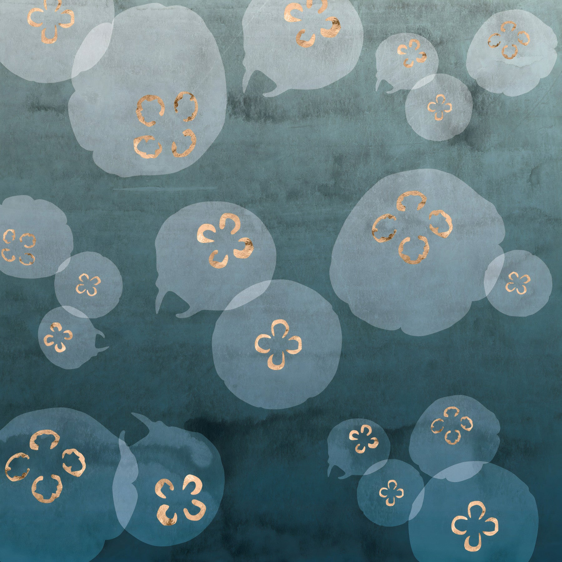 Jellyfish in watercolor tones with gold accents on petrol background.