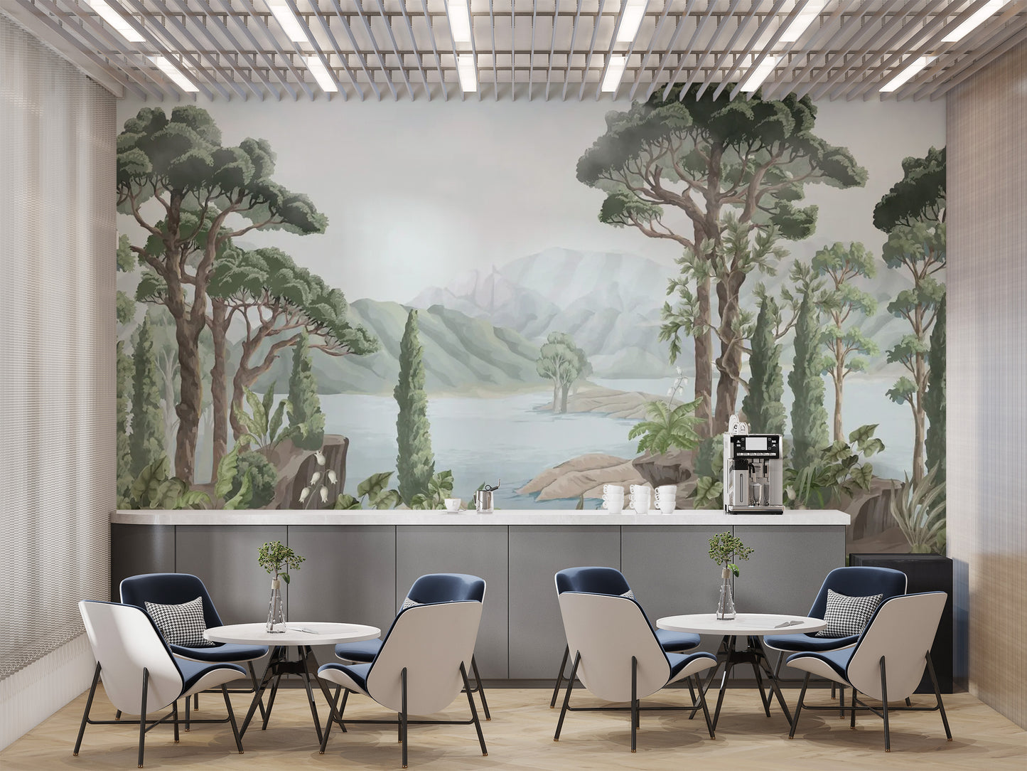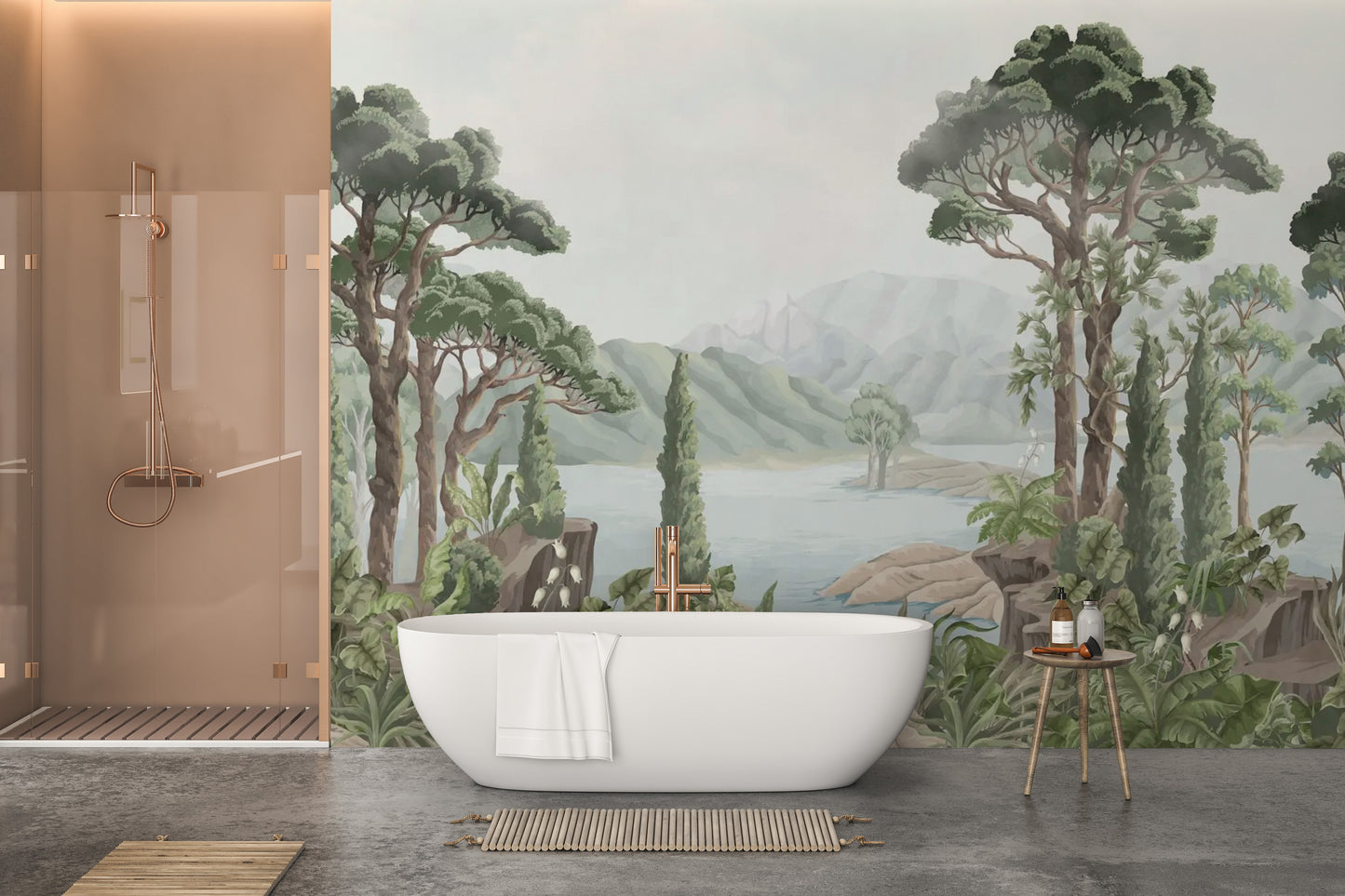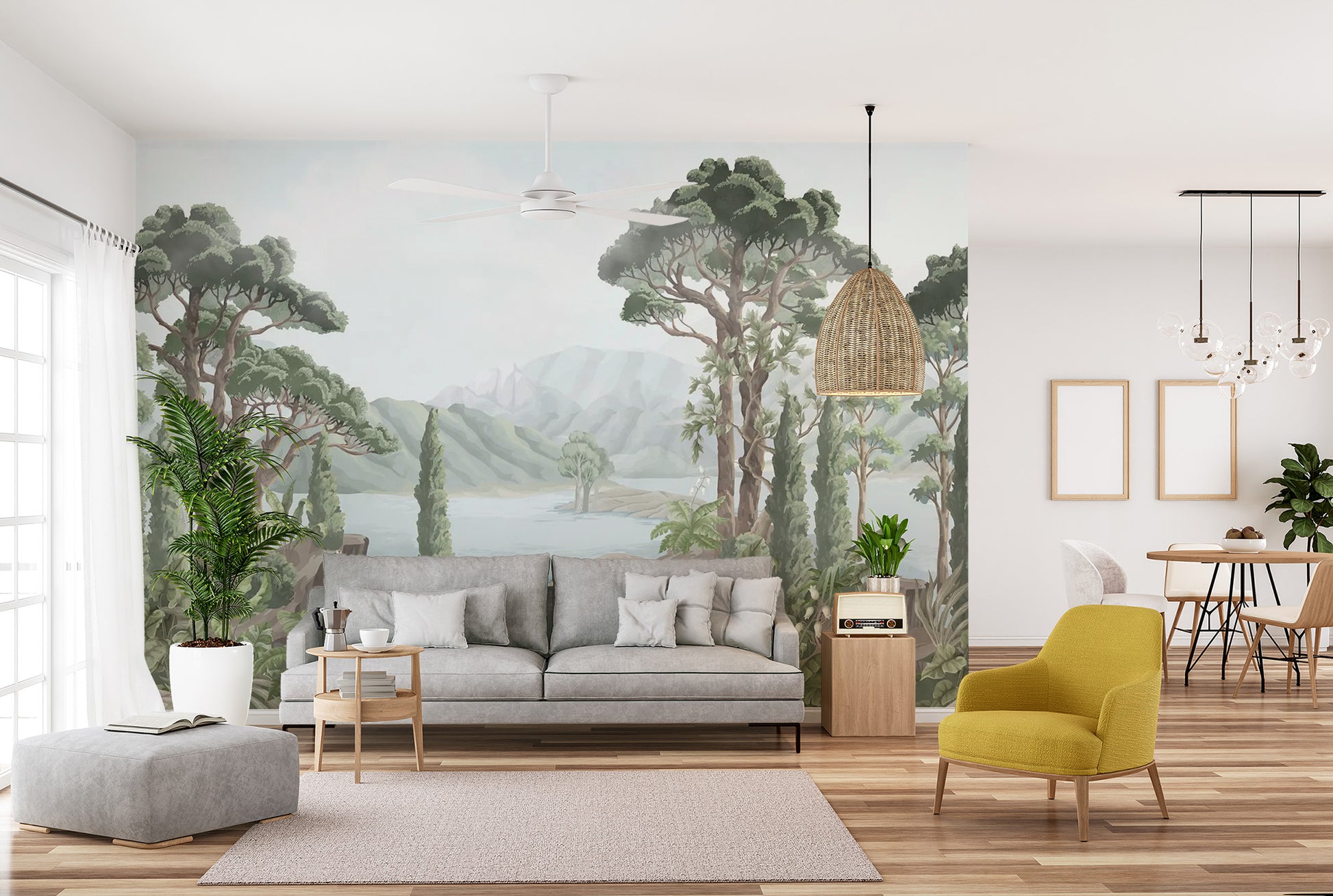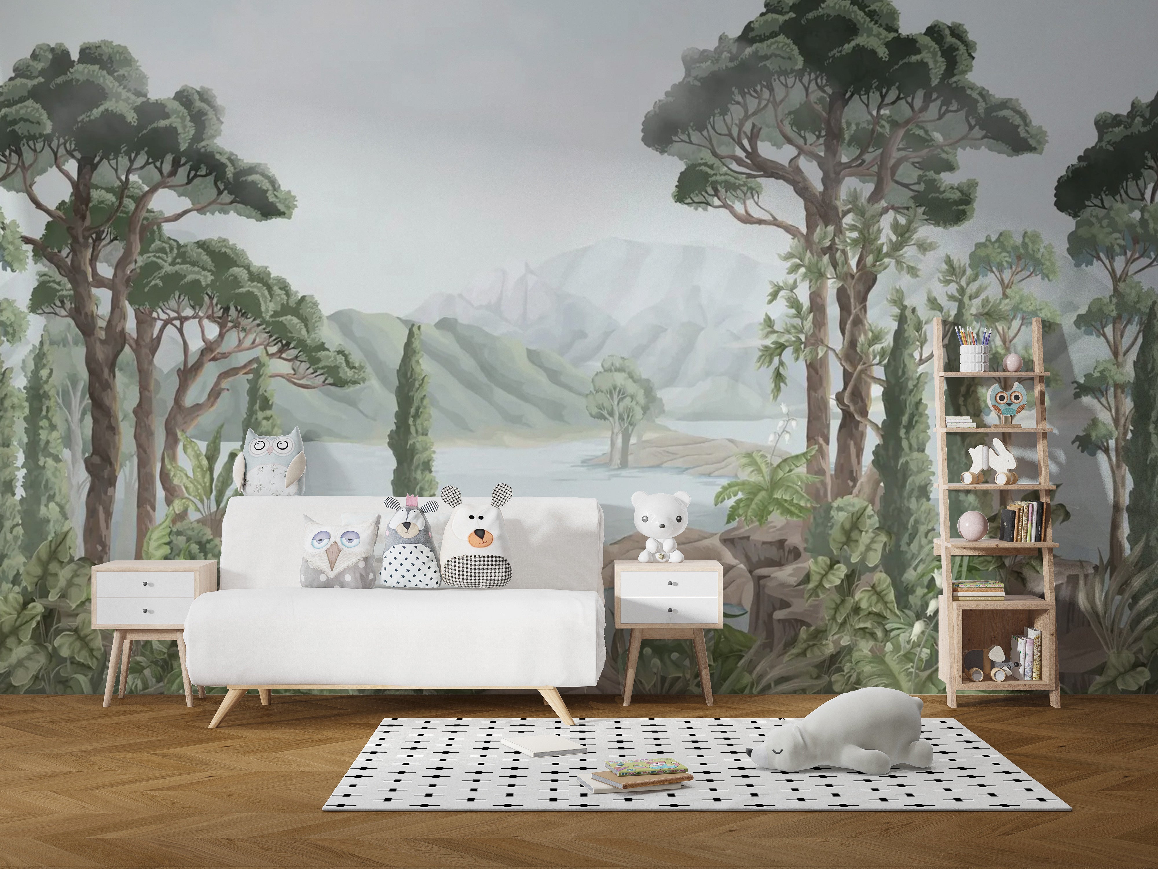 Bring a sense of adventure to your child's room with our watercolor jungle landscape wallpaper. This mural features lush greenery, towering trees, and a serene river, creating a captivating scene that will ignite your child's imagination. The detailed artwork showcases a vibrant jungle teeming with life, perfect for inspiring stories and playtime adventures. Made from high-quality materials, our wallpaper ensures durability and vibrant colors that last for years, providing a lasting impact in your child's space.Order today to bring this enchanting jungle scene into your home. The watercolour effect adds a unique artistic touch, setting it apart from traditional wallpapers.