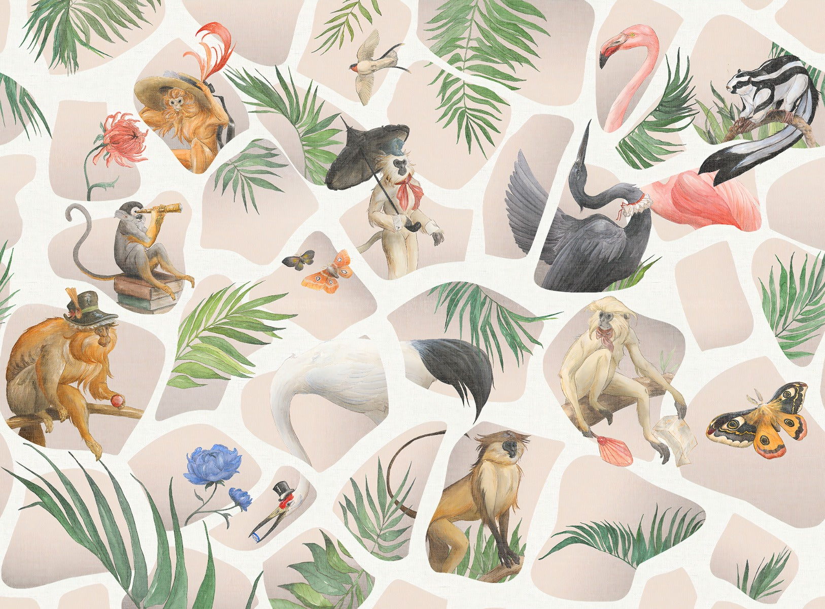 Soft pink wallpaper mural with monkeys and birds in watercolor.