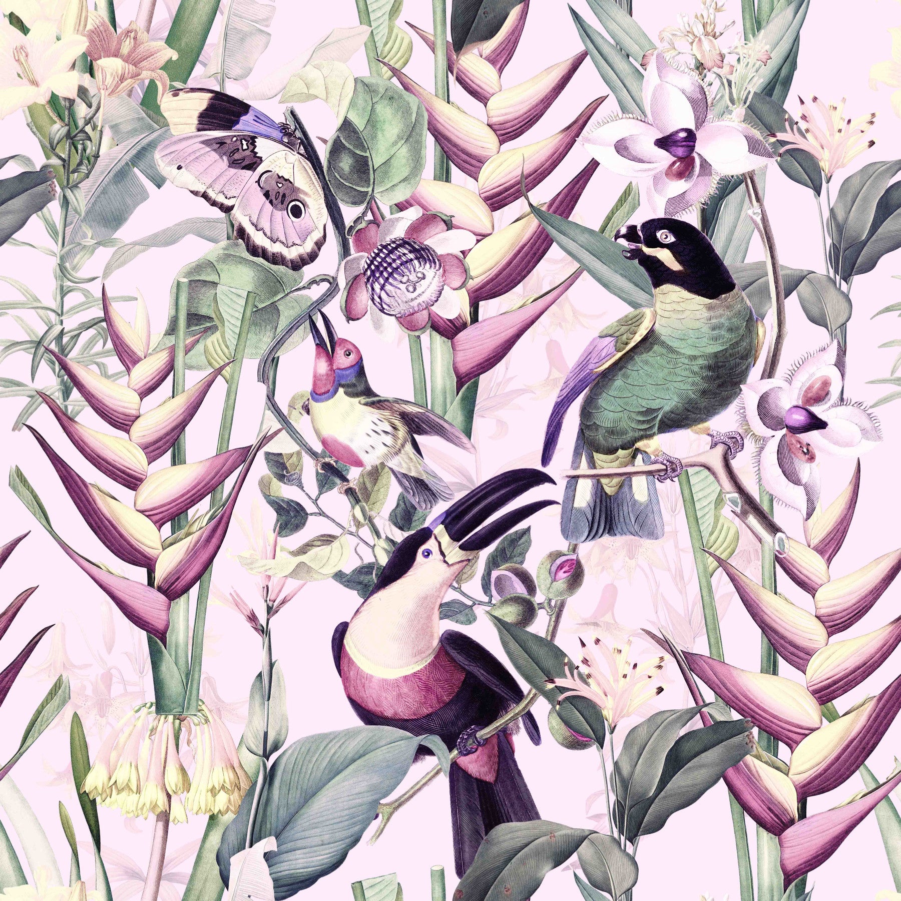 Step into a vibrant, yet subtly serene jungle teeming with life. "Welcome Jungle" presents a meticulously detailed floral and fauna artwork, featuring exotic birds like toucans and colorful songbirds perched amidst lush heliconia and orchids. A delicate butterfly adds a touch of whimsical elegance to the scene. The soft pastel background enhances the intricate details of the botanical illustrations, creating a wallpaper that is both captivating and calming. This design is perfect for adding a touch of exotic sophistication to any space.