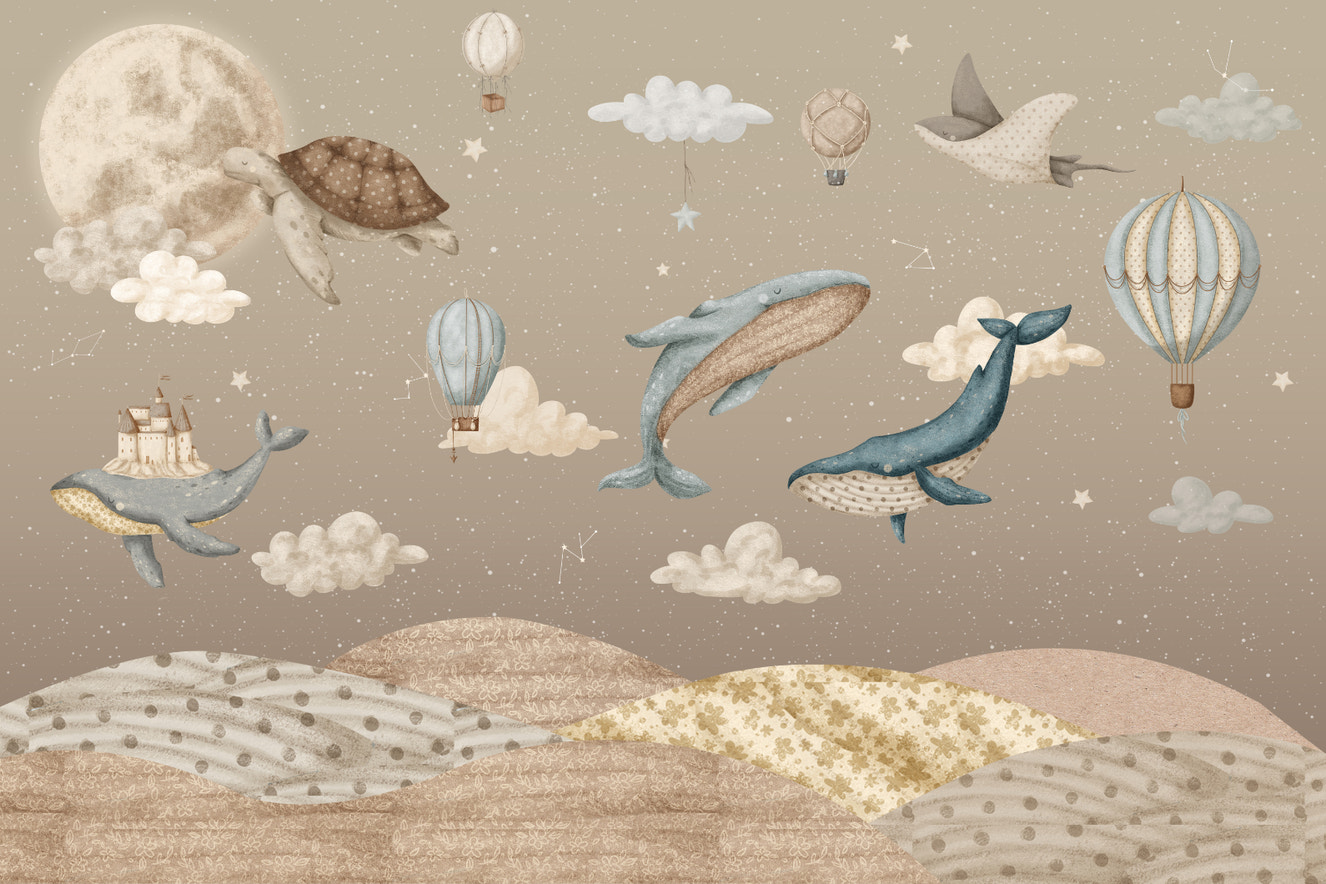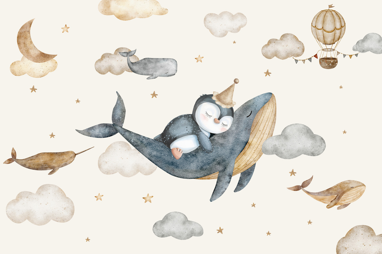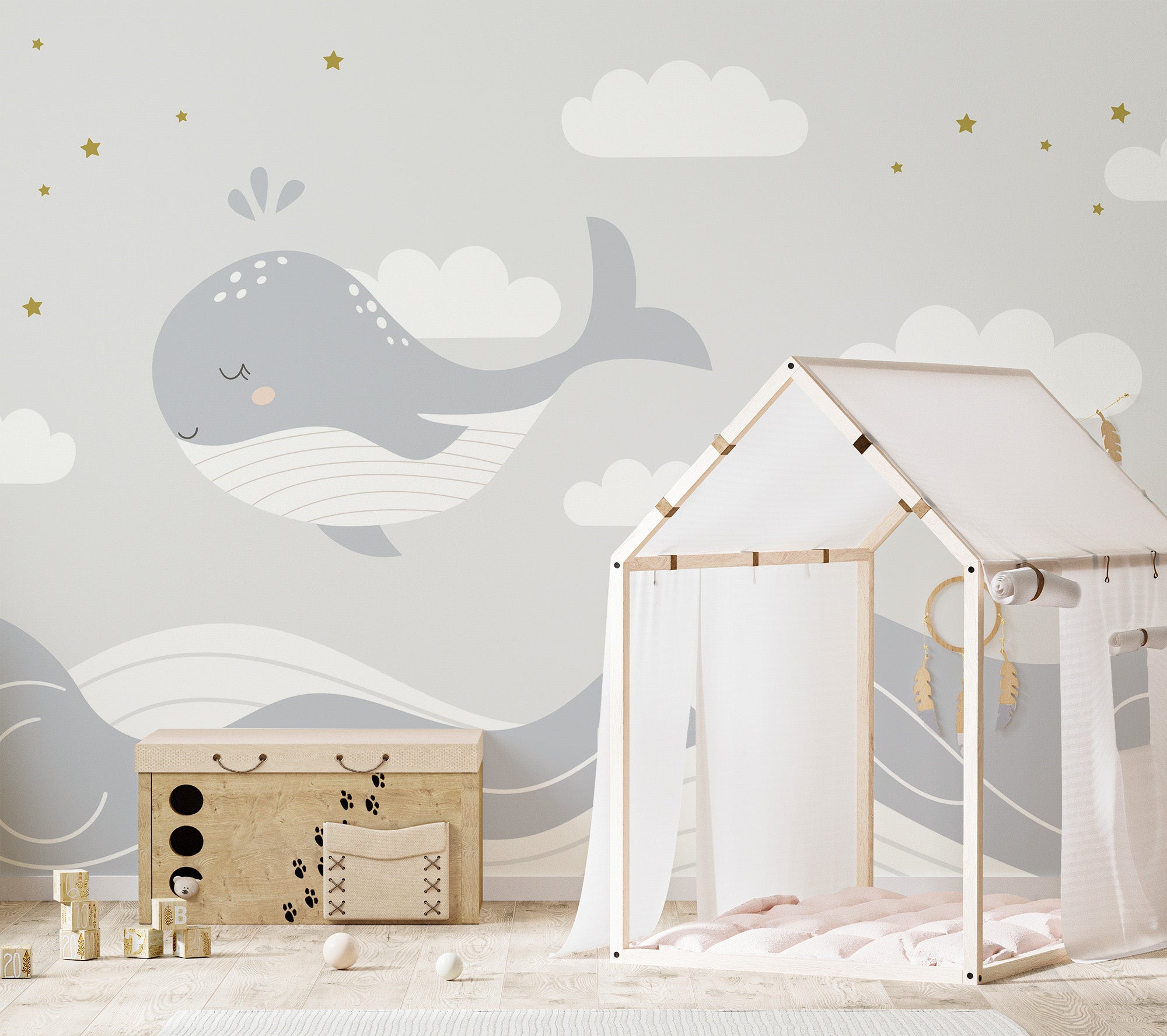 Imagine a world where your child can wake up every day to the gentle giants of the sea. The Whale Dreams wall mural for kids isn't just a mere decoration, it's a window to an underwater journey filled with enchantment and wonder. Every inch of this kids wallpaper pulsates with the life of the ocean, inviting young explorers to dream big and dive deep into their imagination. From the playful dance of dolphins to the serene glide of whales, this mural brings the ocean's magic right into your child's bedroom. Perfect for encouraging curiosity and a love for nature, it makes every bedtime story an undersea adventure.