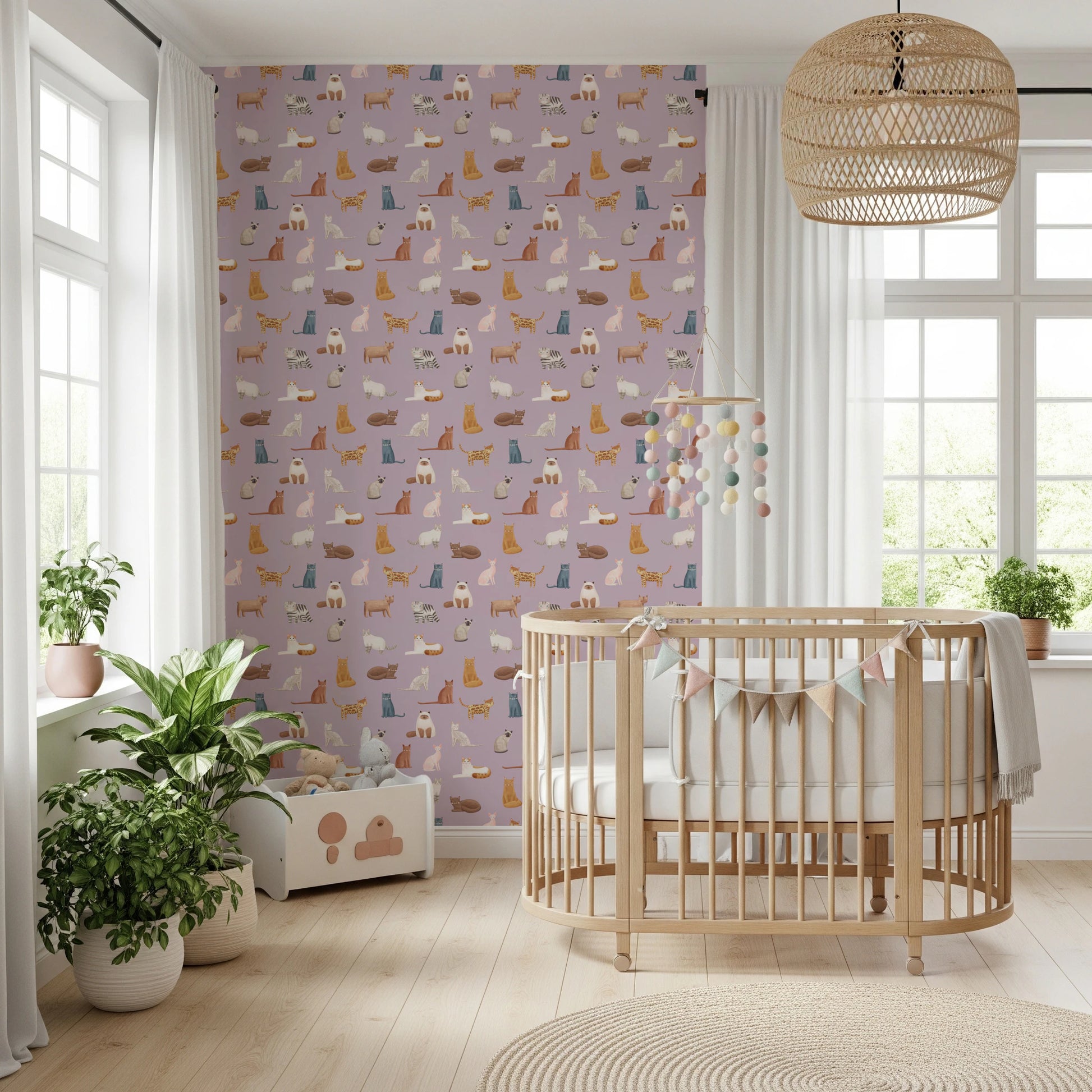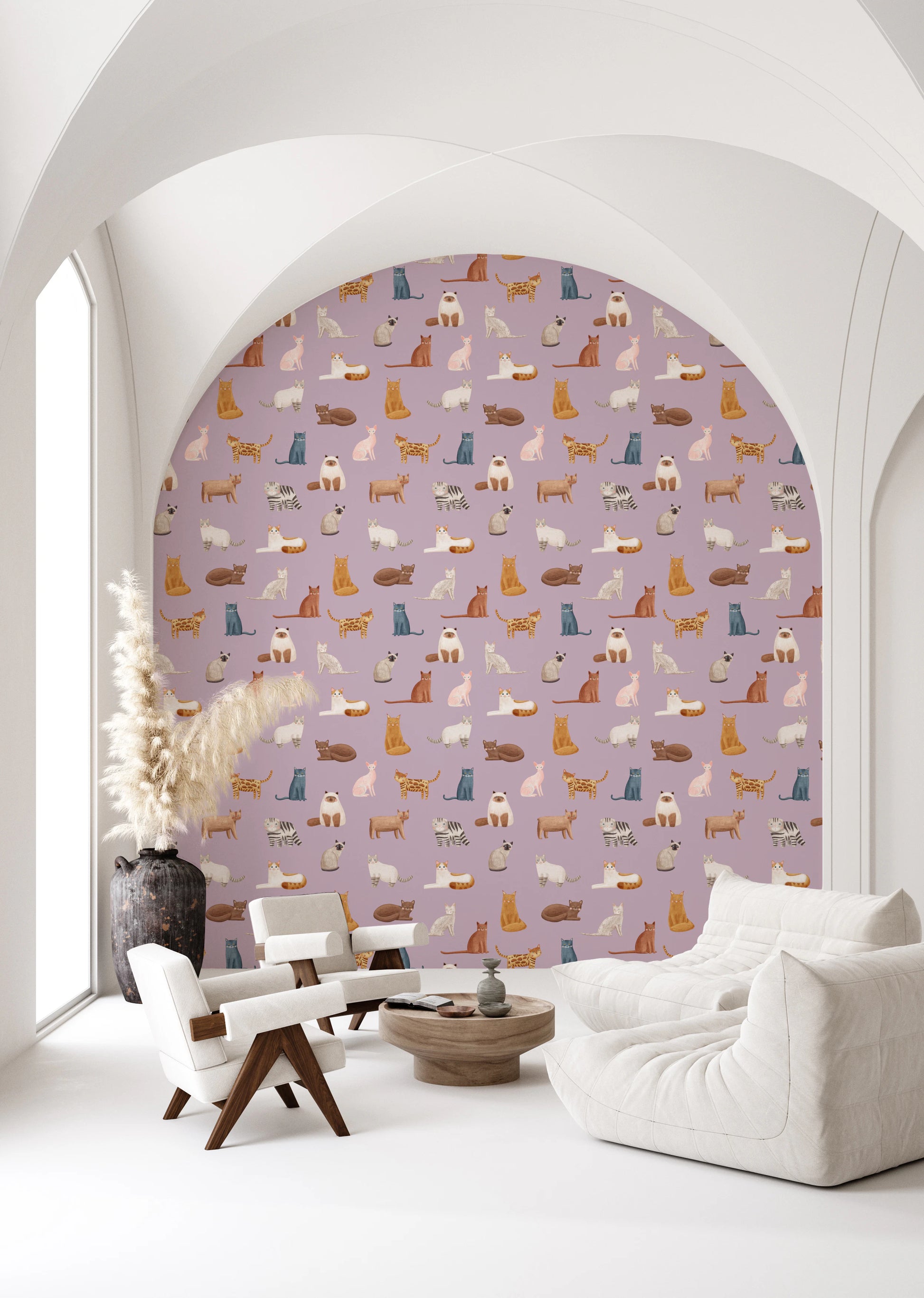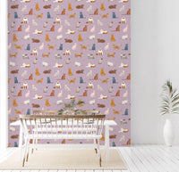 Transform any room with the endearing charm of this cat-themed wallpaper for walls. Hand-drawn cat illustrations create an engaging repeat pattern. The soft lavender background complements the warm browns, gentle greys, and muted blues of the diverse feline characters. This wallpaper is a wonderful addition to a nursery, playroom, or bedroom where you want to foster a playful yet serene mood. It introduces a sense of lighthearted joy and artistic flair, making any space feel welcoming and imaginative. See how this design becomes a subtle statement piece, enriching the character of your home.