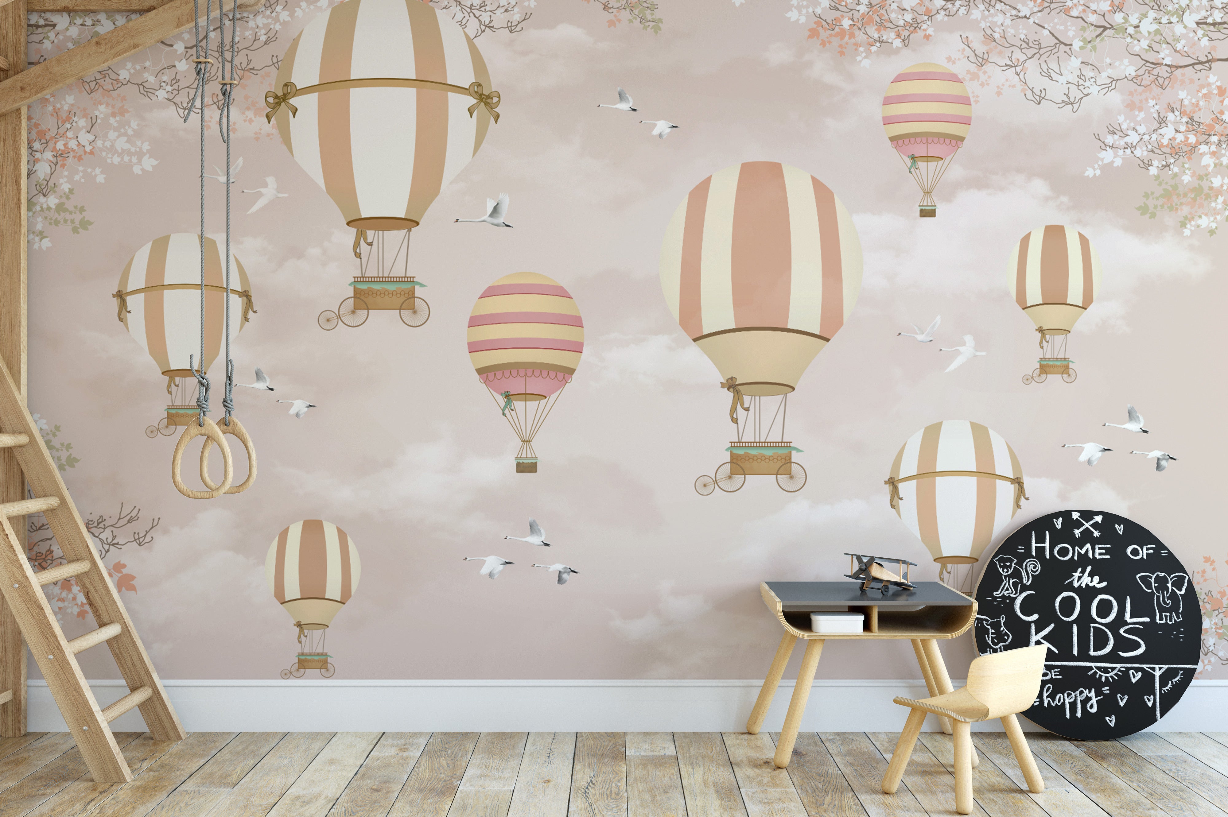 Add charm to any room with the whimsical hot air balloon wallpaper. This playful design features pastel-colored hot air balloons floating among soft clouds and graceful birds. Perfect for nurseries, playrooms, and kids' bedrooms, this hot air balloon wallpaper brings a light, airy feel to your walls. The vintage tones of beige, cream, and peach blend beautifully with various interior styles. Whether designing a nursery or updating a child's room, this whimsical kids' room wallpaper creates a fun and inviting atmosphere. Let the nursery hot air balloon mural inspire endless imagination and joy.
