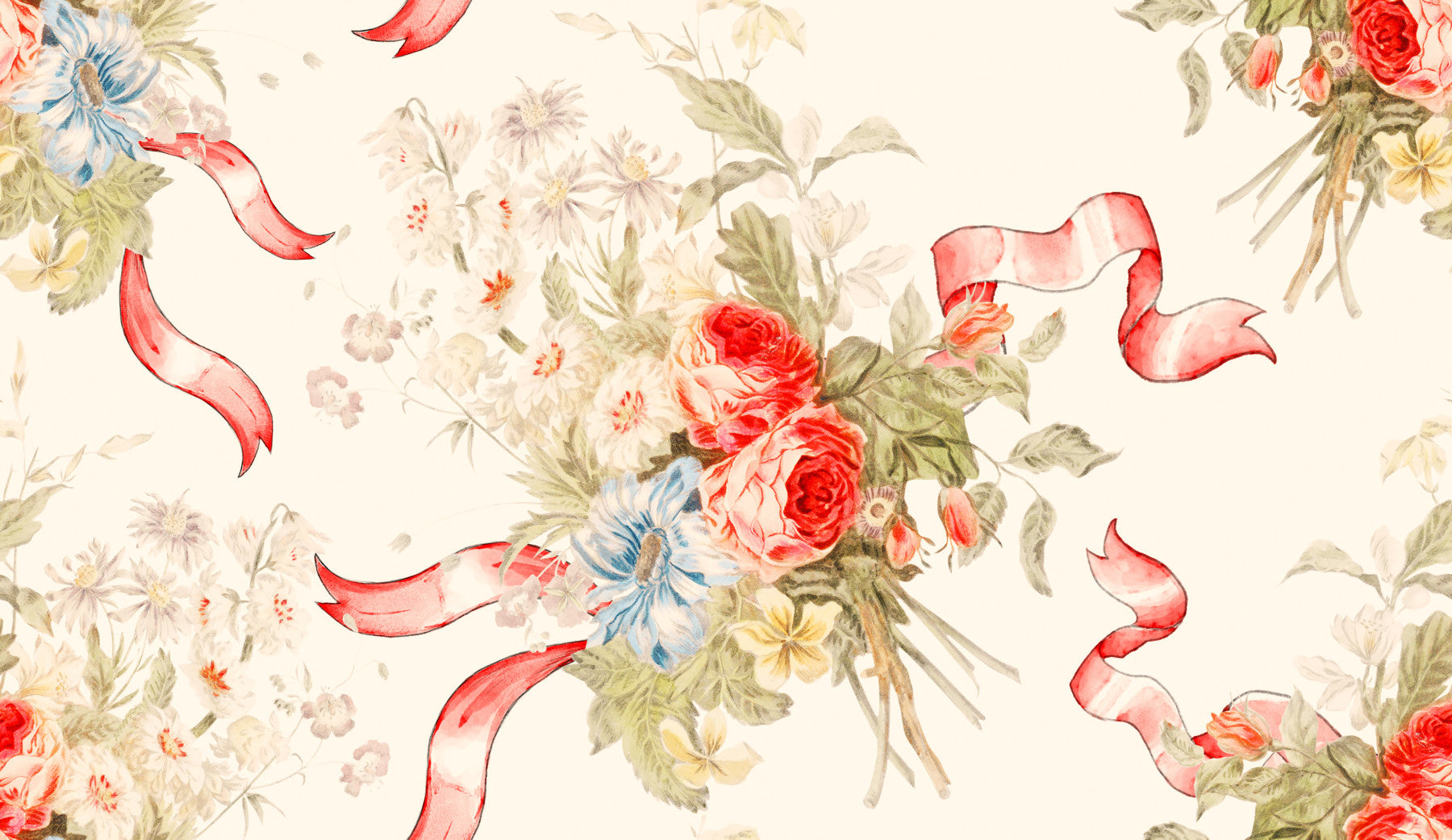 Escape to a whimsical rose garden with this enchanting wallpaper. Delicate watercolor roses and wildflowers are artfully arranged in a charming bouquet, tied with flowing red ribbons that add a touch of playfulness. The soft color palette evokes a sense of gentle romance and tranquility. Perfect for a bedroom, nursery, or any space that needs a touch of dreamy charm, this wallpaper effortlessly blends classic floral elegance with a lighthearted, whimsical feel. The delicate details and soft hues create a calming and inviting atmosphere, transporting you to a peaceful sanctuary.