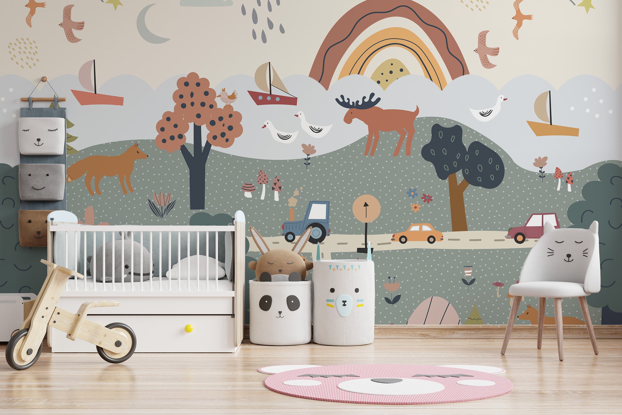 Makeover your child's space with the whimsical Scandinavian forest wallpaper, a brilliant combination of nature and playful artistry. Featuring cute animals, trees, rainbows, and faraway fantasies in warm and earthy hues on this kid's room wallpaper, it sets a nice and imaginative mood behind the scenes. Constructed in a Scandinavian mural style, it gives a modern yet whimsical finish to a nursery, playroom, or bedroom. Apply the playful landscape mural easily, with the mural option of peel-and-stick kids' wallpaper, making decorating a walk in the park! Give your little one's world a new lease on life with this nature-inspired nursery wallpaper, made for warmth, imagination, and endless exploration! Just what dreamy decor was ordered!