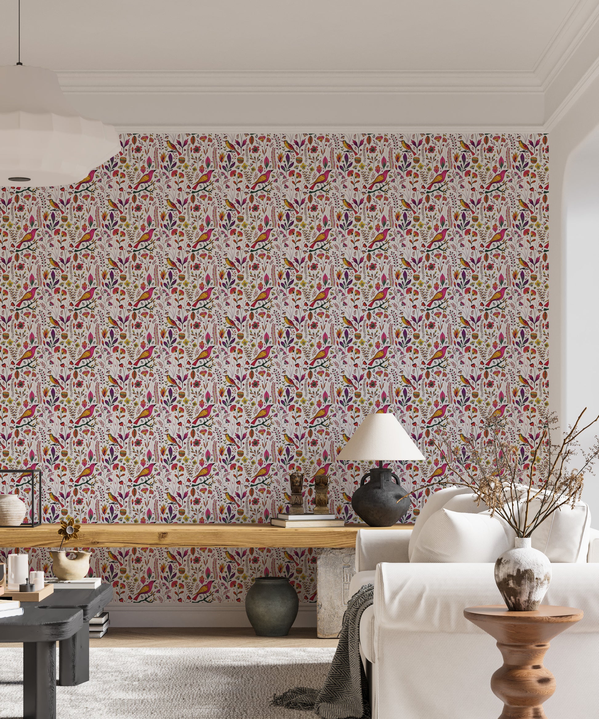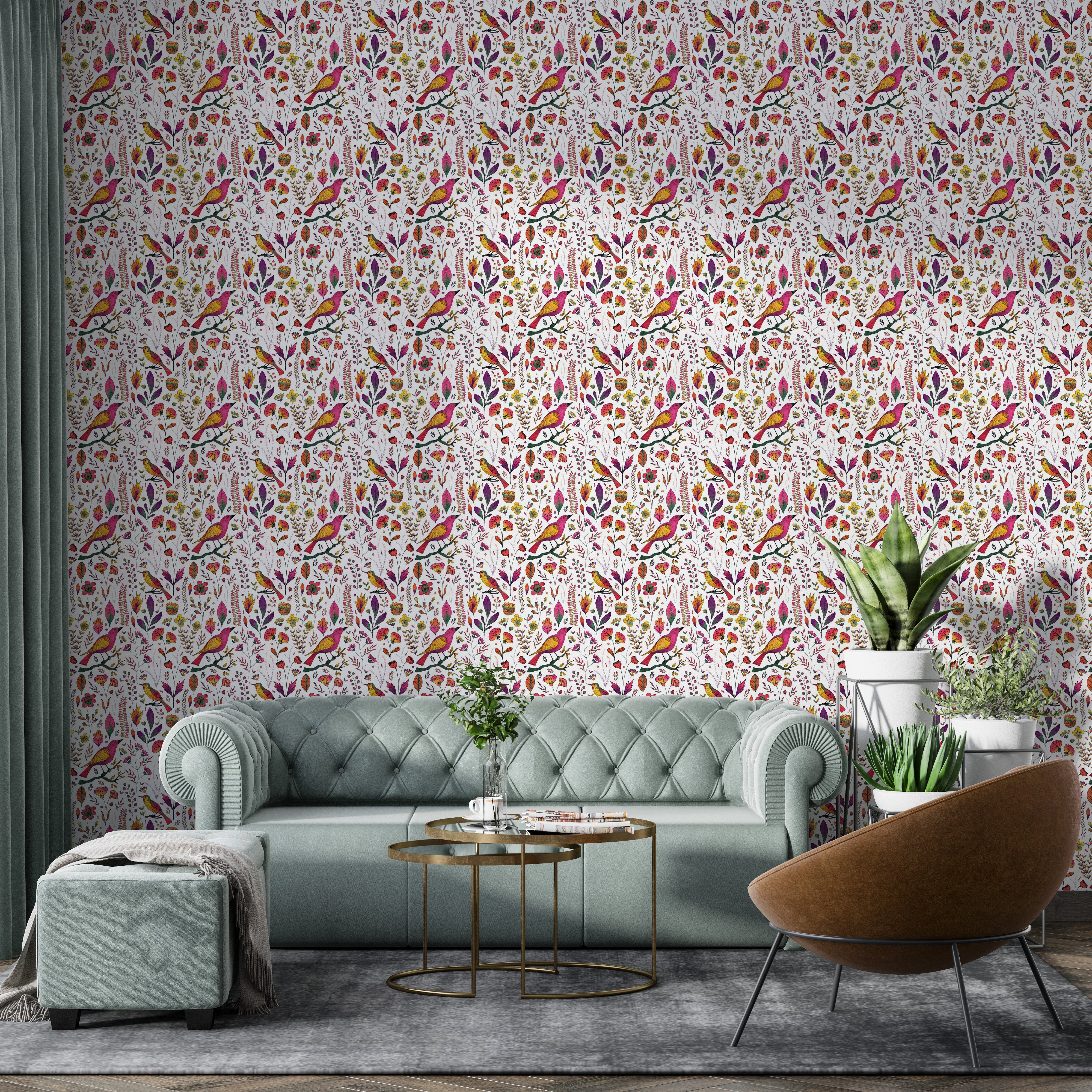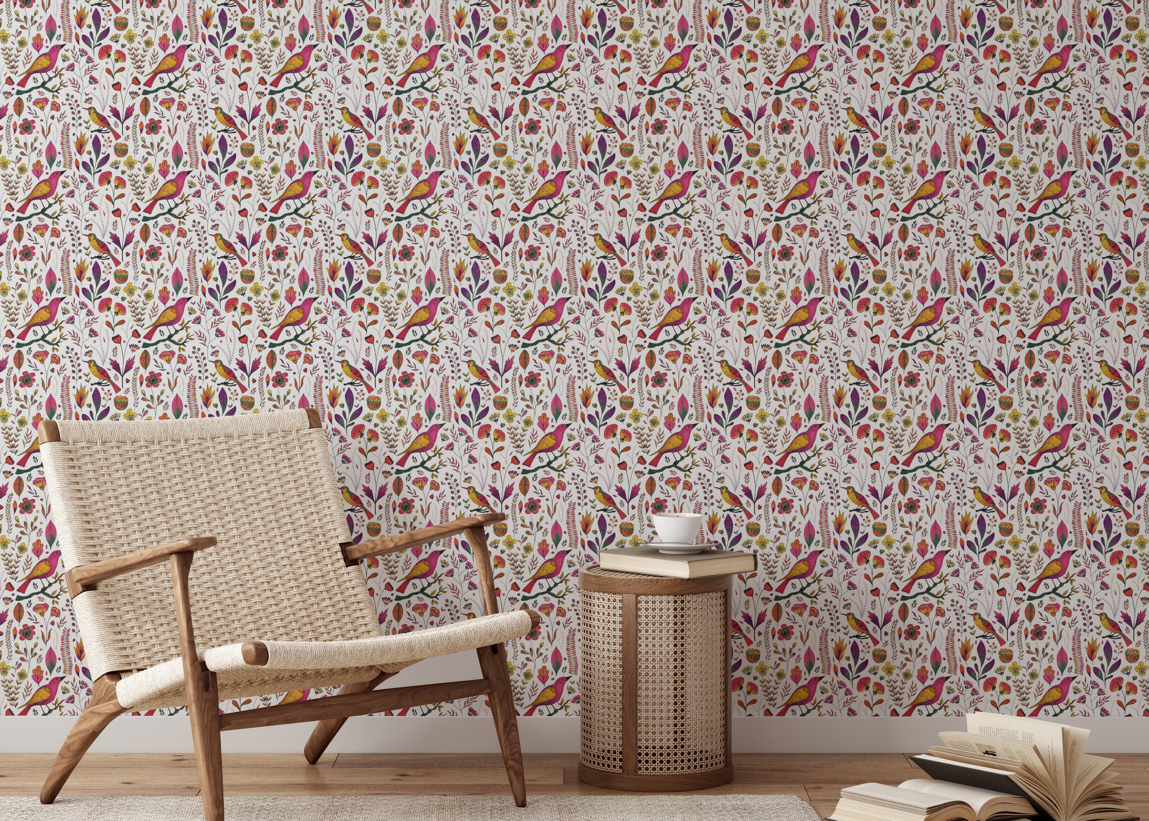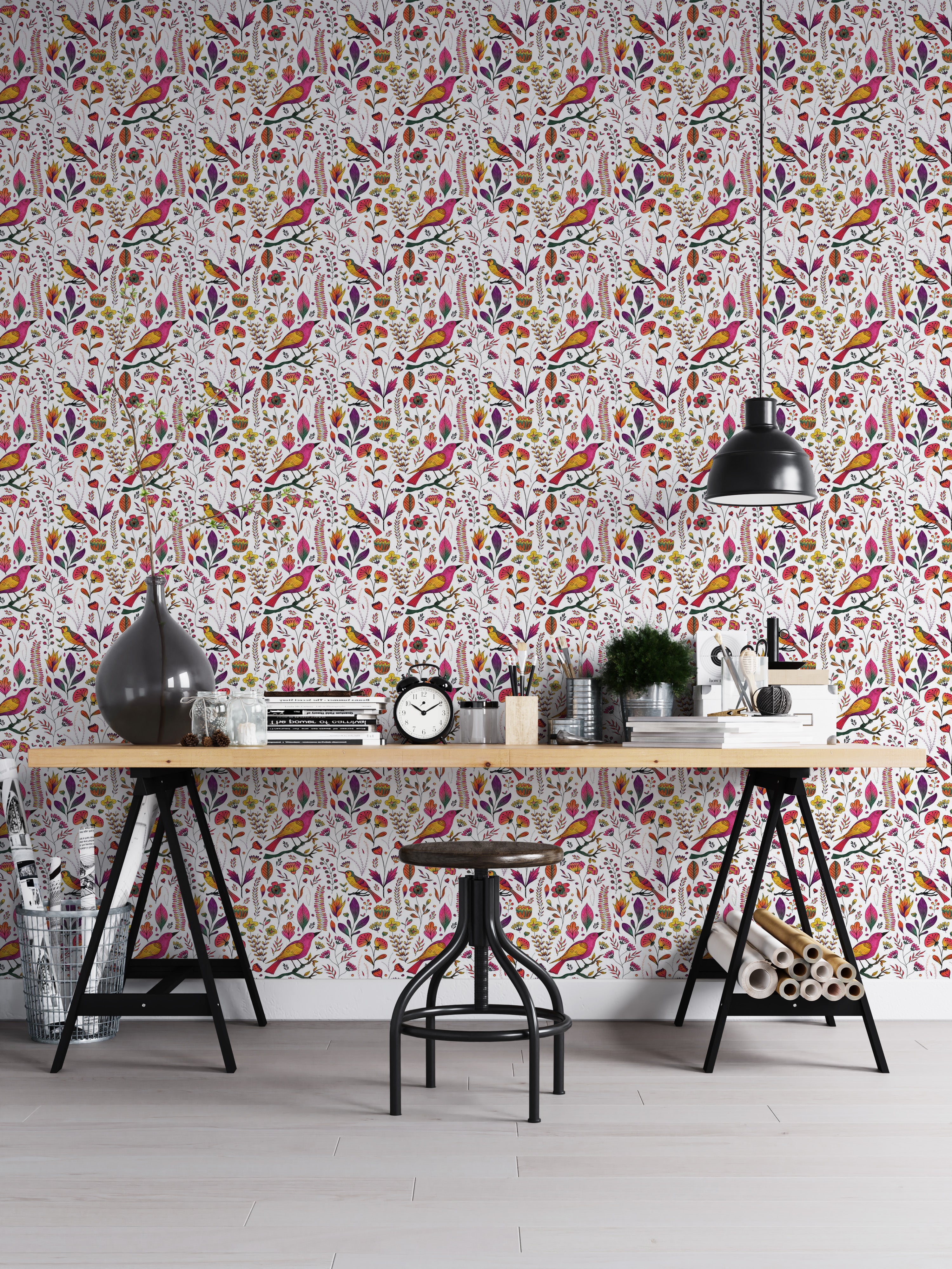 Let your walls tell a whimsical tale with our Whimsical Songbird Garden White Wallpaper. A lively chorus of pink and golden birds flutters through a dreamy garden of hand-drawn florals and delicate leaves, all set against a crisp white backdrop. This charming birds wallpaper brings a playful yet elegant touch to bedrooms, reading nooks, and creative spaces. Perfect for those who adore nature-inspired interiors, it captures the beauty of a blooming garden in full song. Easy to apply and even easier to love, this wallpaper turns any room into a poetic escape where birds sing and flowers forever bloom.