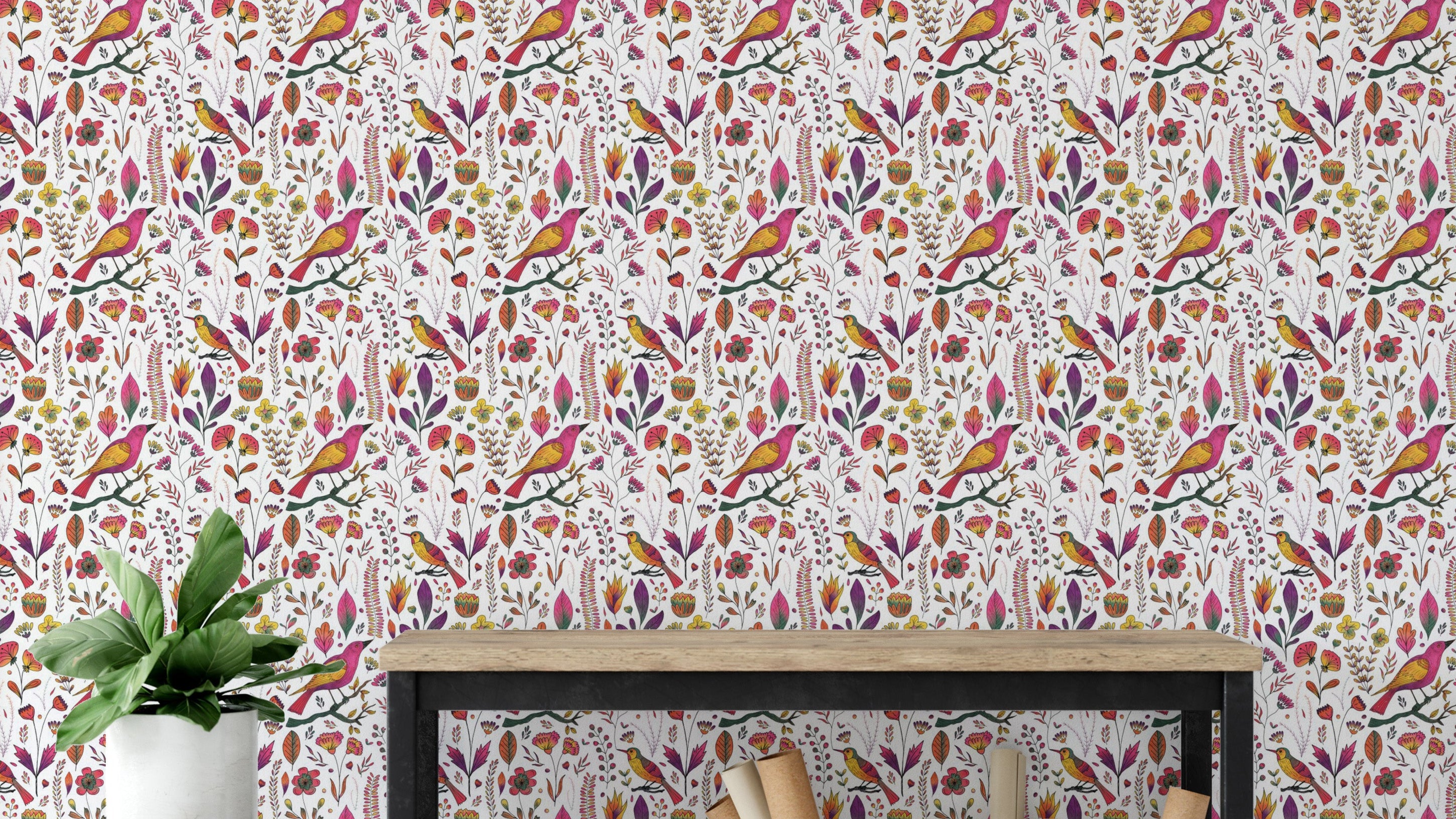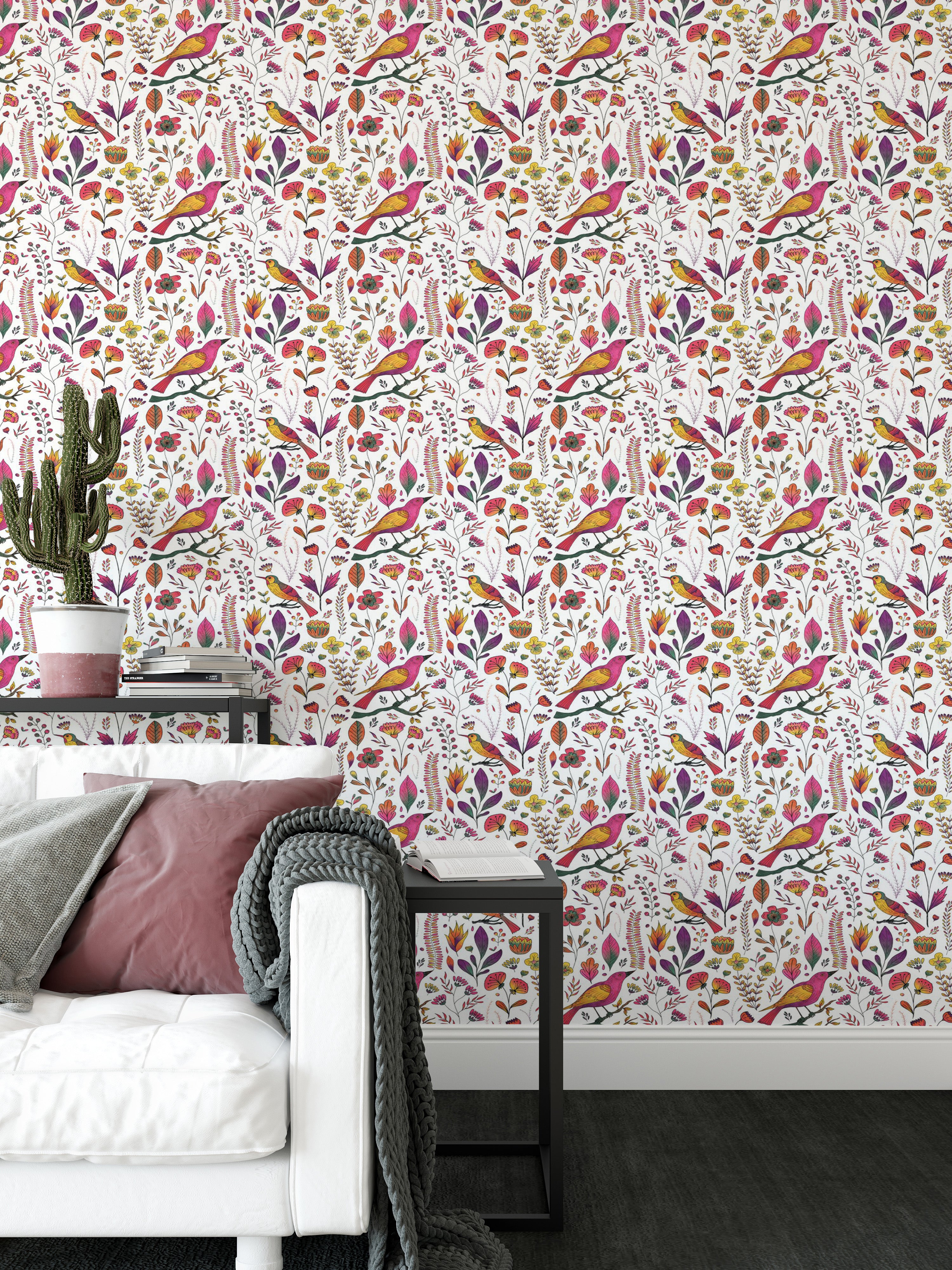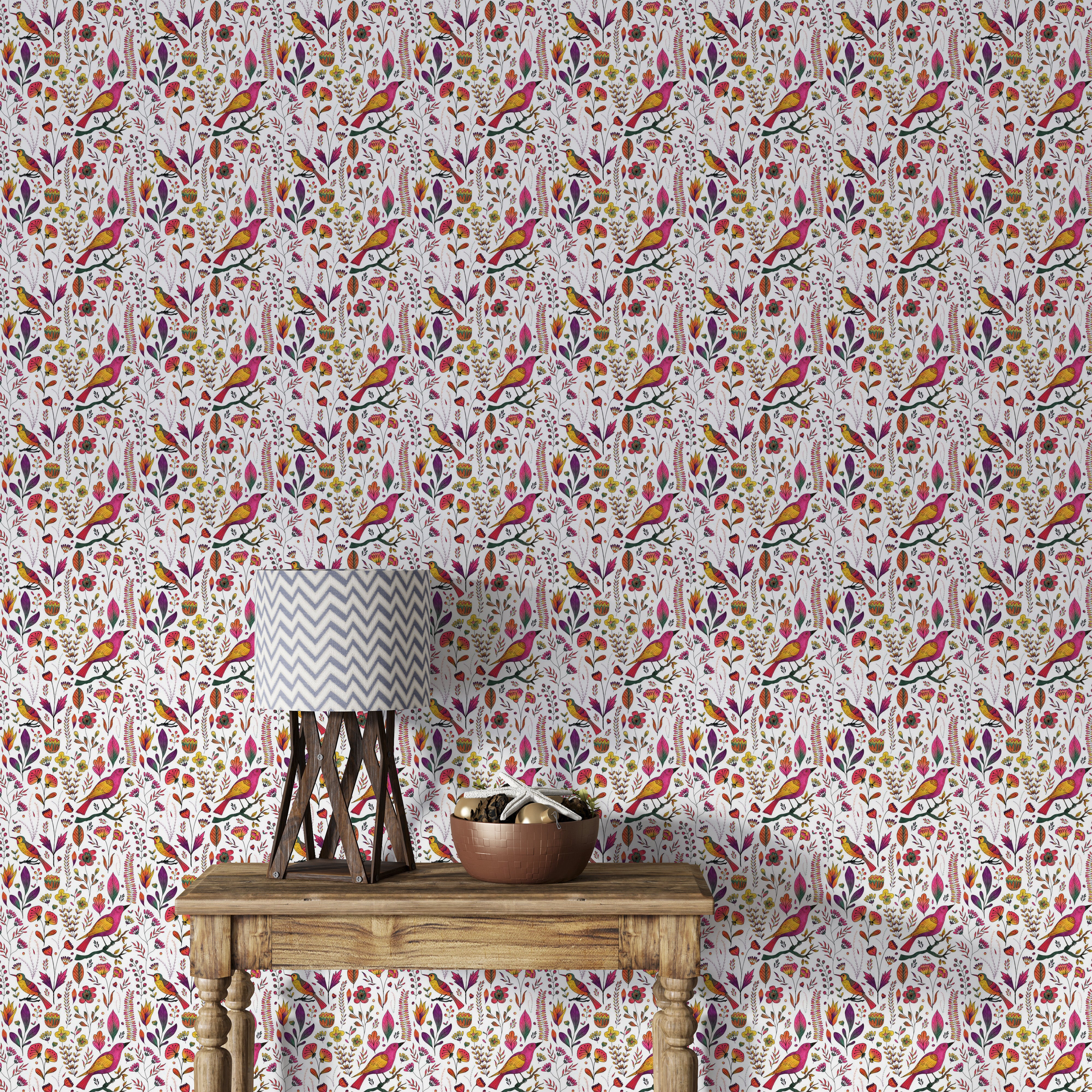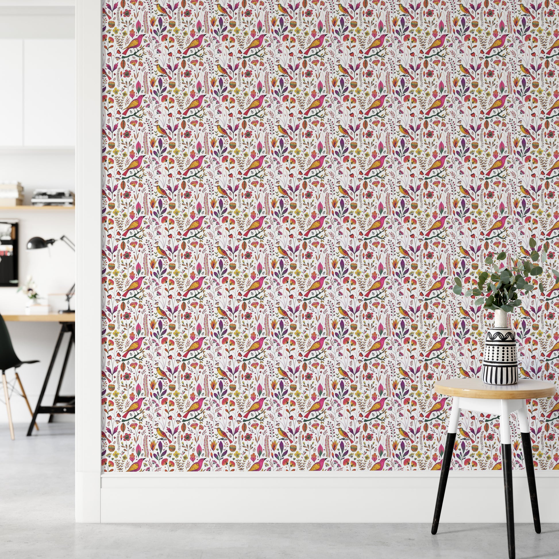 Let your walls tell a whimsical tale with our Whimsical Songbird Garden White Wallpaper. A lively chorus of pink and golden birds flutters through a dreamy garden of hand-drawn florals and delicate leaves, all set against a crisp white backdrop. This charming birds wallpaper brings a playful yet elegant touch to bedrooms, reading nooks, and creative spaces. Perfect for those who adore nature-inspired interiors, it captures the beauty of a blooming garden in full song. Easy to apply and even easier to love, this wallpaper turns any room into a poetic escape where birds sing and flowers forever bloom.