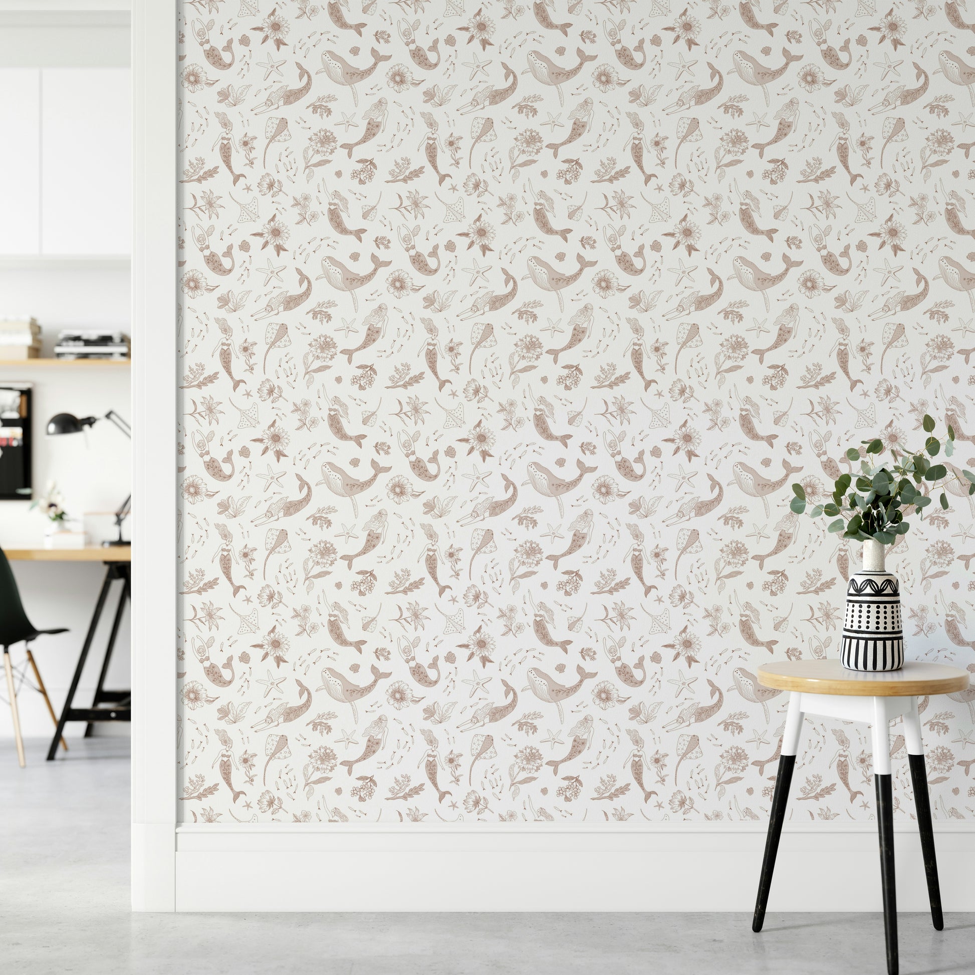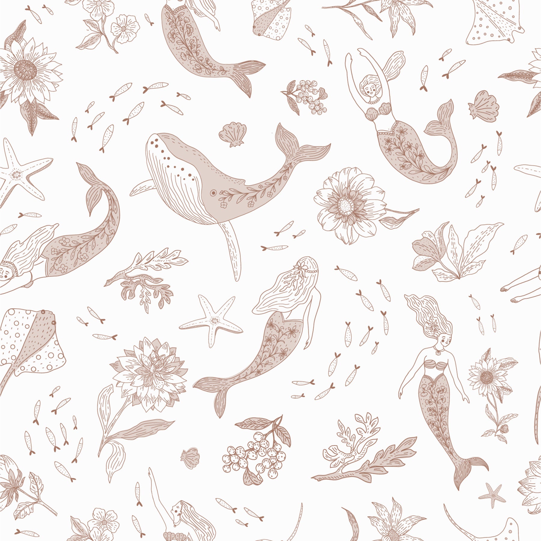 Escape to a world of enchanting marine life with this whimsical wallpaper. Delicate line drawings of graceful mermaids, playful fish, and elegant sea creatures create a captivating underwater scene. The soft, muted color palette in blush pink and beige evokes a sense of calm and serenity. Perfect for nurseries, bedrooms, or any space seeking a touch of magic and tranquility, the seamless pattern ensures a cohesive and dreamy aesthetic. The hand-drawn style adds a touch of unique charm and artistry.
