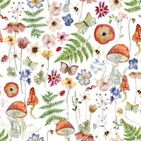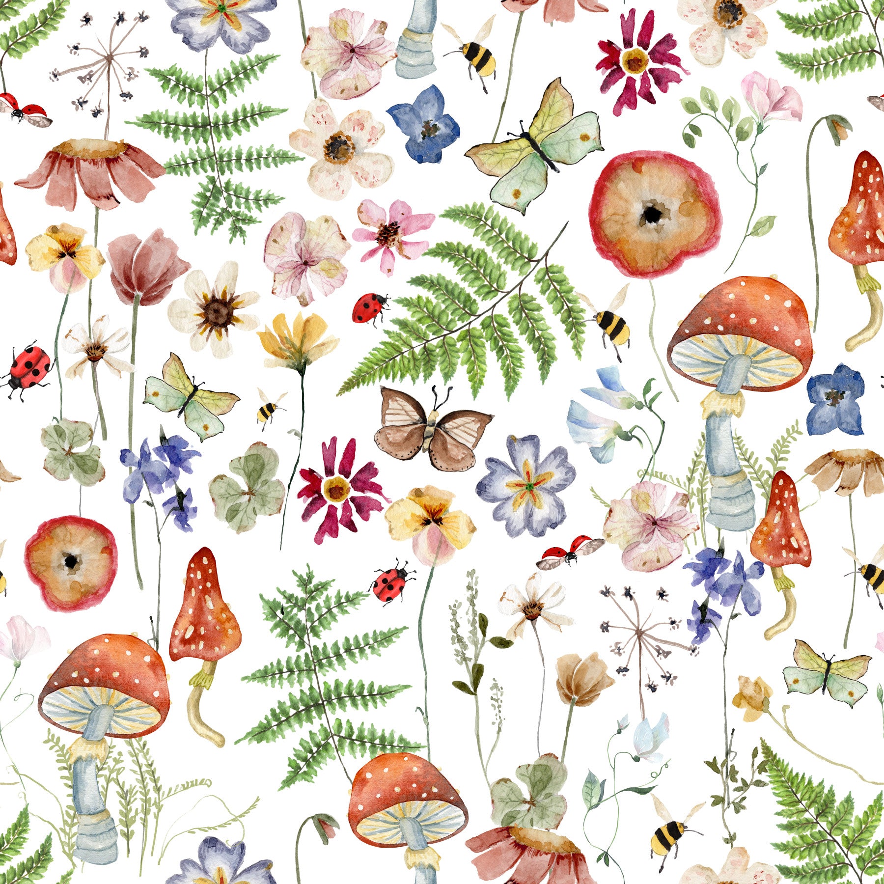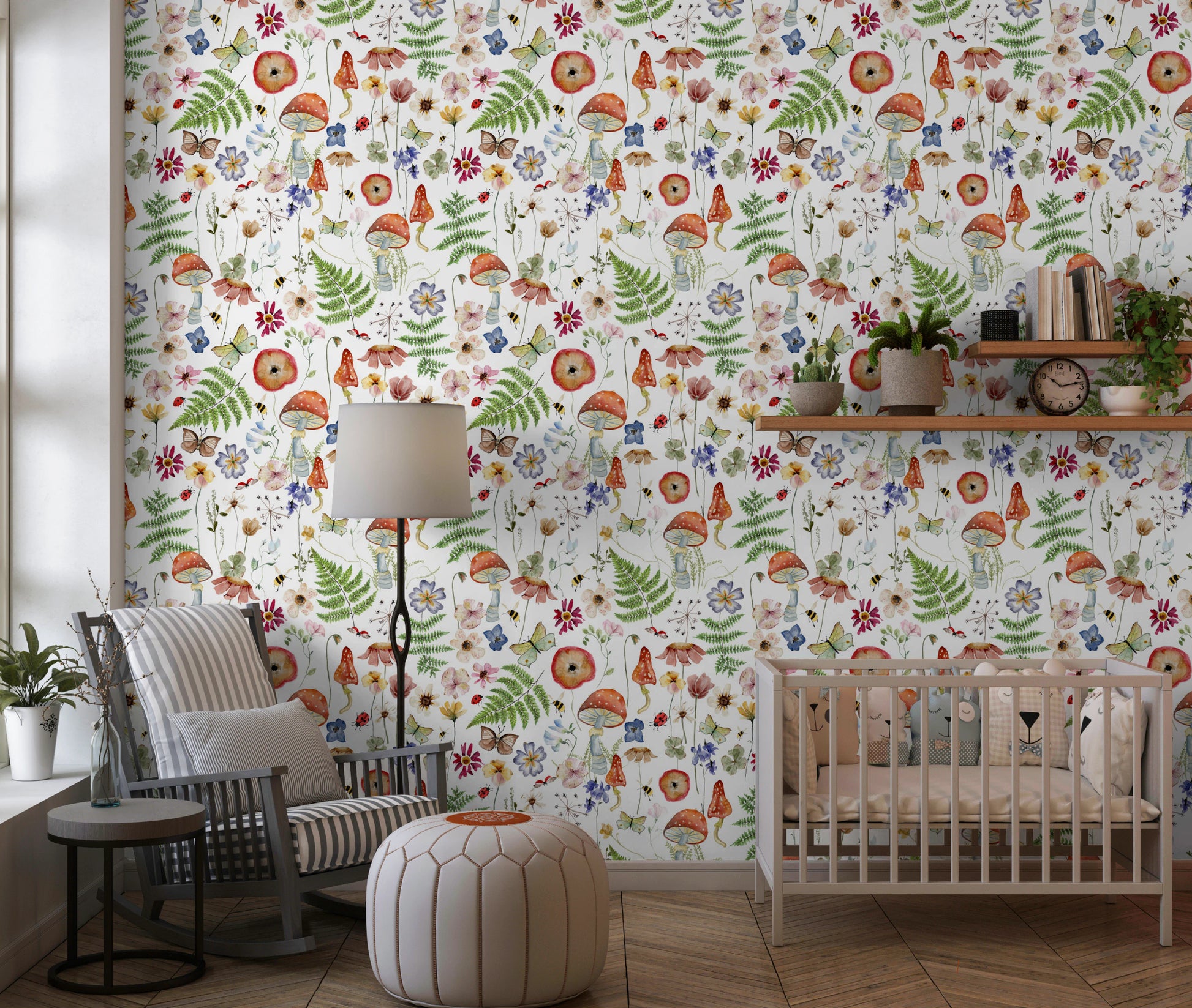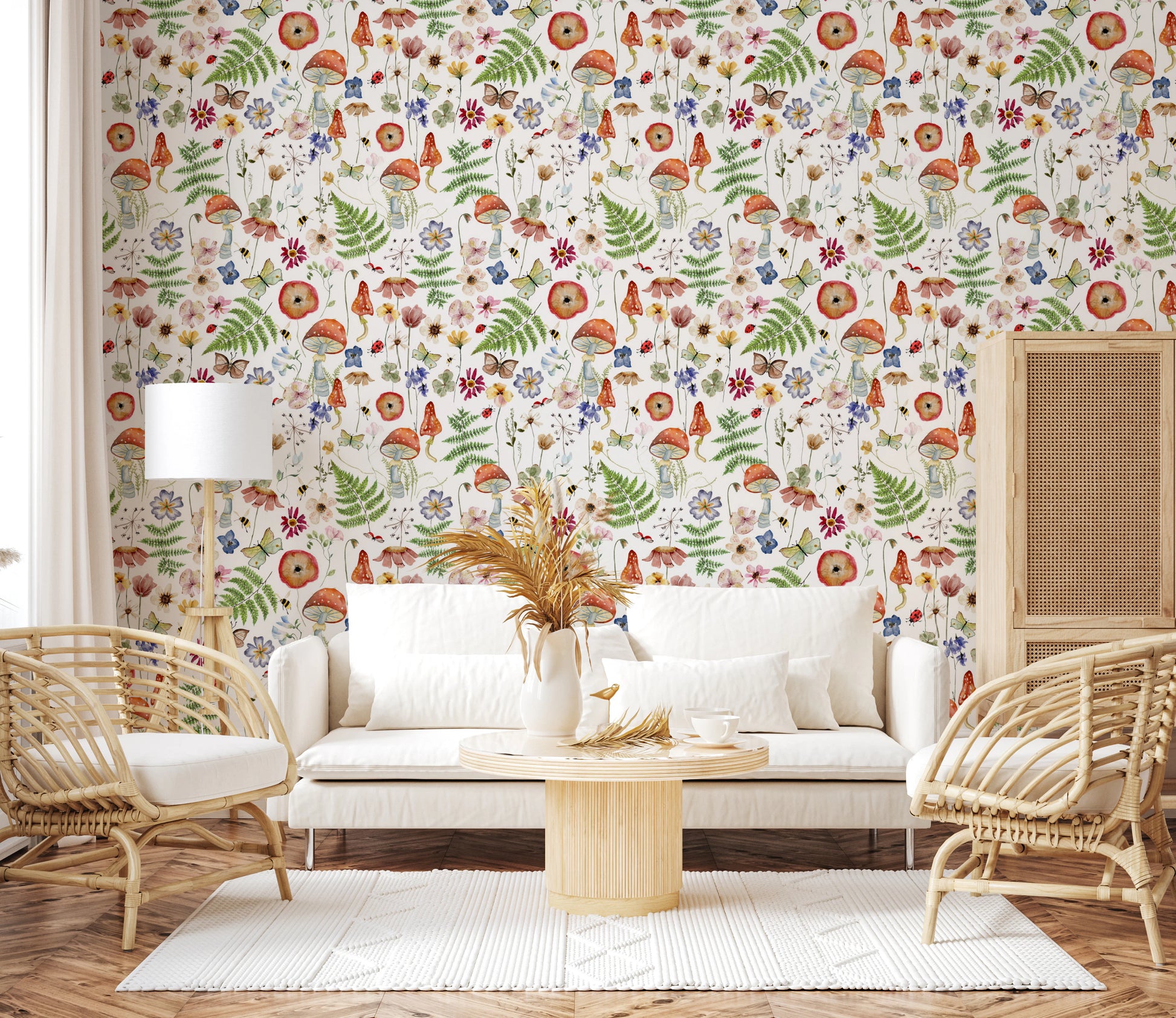 Transform your walls with this enchanting watercolour meadow design. Featuring delicate wildflowers, mushrooms, and fluttering butterflies and bees, this wallpaper for walls brings a touch of nature indoors. The soft colour palette includes blush pinks, muted blues, and earthy browns. This design is ideal for bedrooms, nurseries, and living rooms, offering a peaceful and inviting atmosphere. Watercolour details and a seamless pattern enhance interior spaces with a hand-painted aesthetic, creating a unique and charming wall décor.