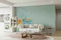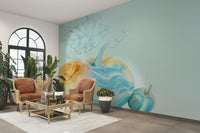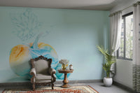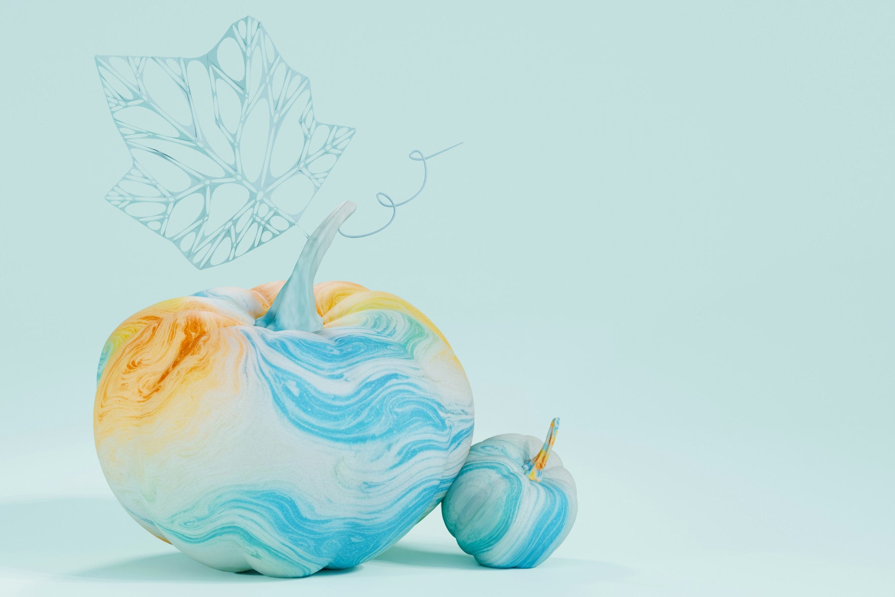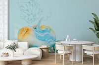 This wallpaper features two charming pumpkins, rendered in a delightful watercolor style. Their surfaces are adorned with a mesmerizing swirl of pastel blues, oranges, and yellows, creating a dreamy and calming effect. A delicate, light blue leaf adds an ethereal touch, completing the serene composition. This design is perfect for those seeking a subtle, yet visually engaging backdrop for any room, lending a touch of whimsical sophistication.