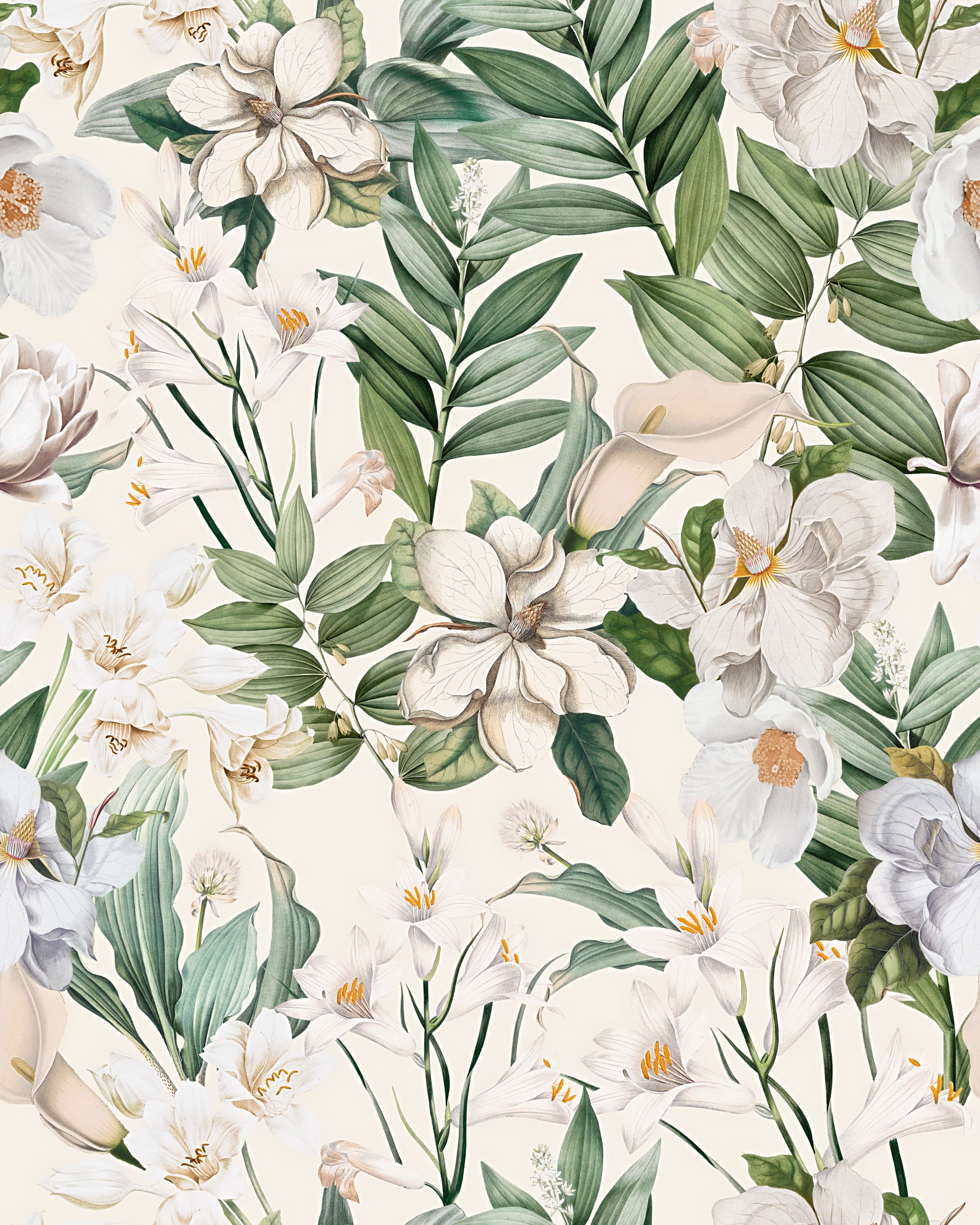 Embrace a touch of whimsical charm with this botanical wallpaper. The design features an enchanting array of white flowers and delicate green leaves, creating a light and airy atmosphere. The soft color palette and detailed illustrations lend a touch of vintage elegance, perfect for nurseries, bedrooms, or any space where a dreamy and peaceful ambiance is desired. The seamless repeat ensures a cohesive and captivating look across your walls.