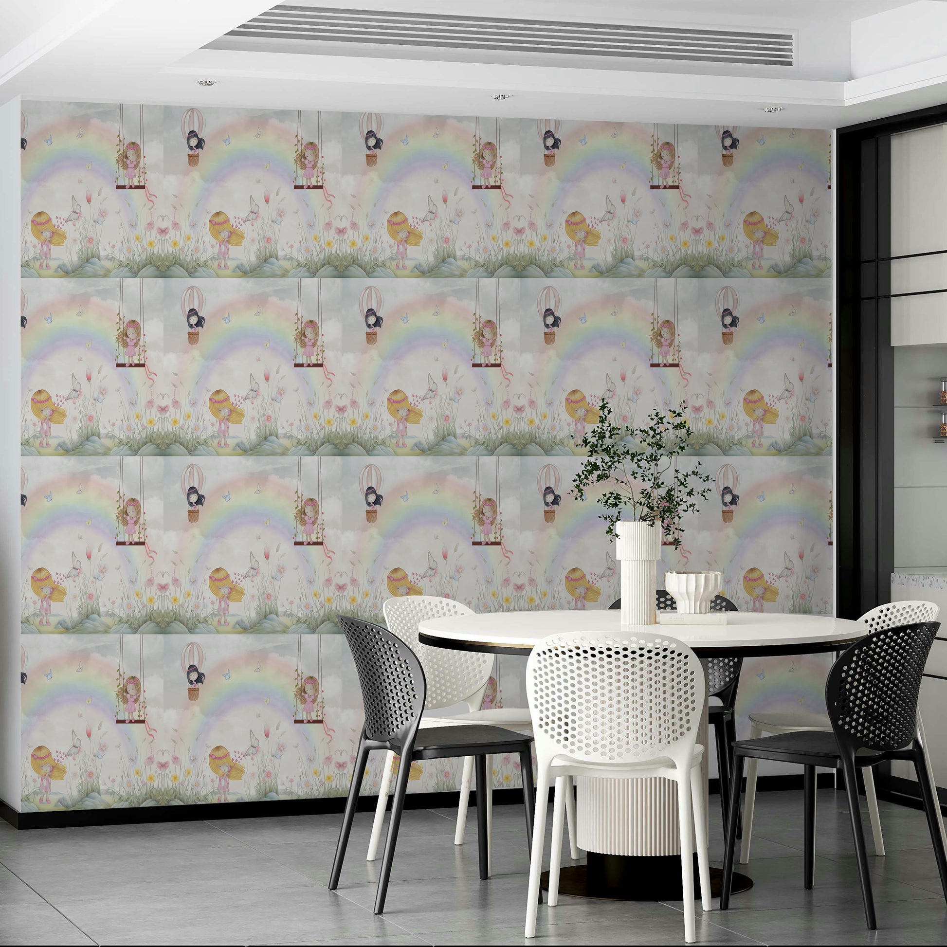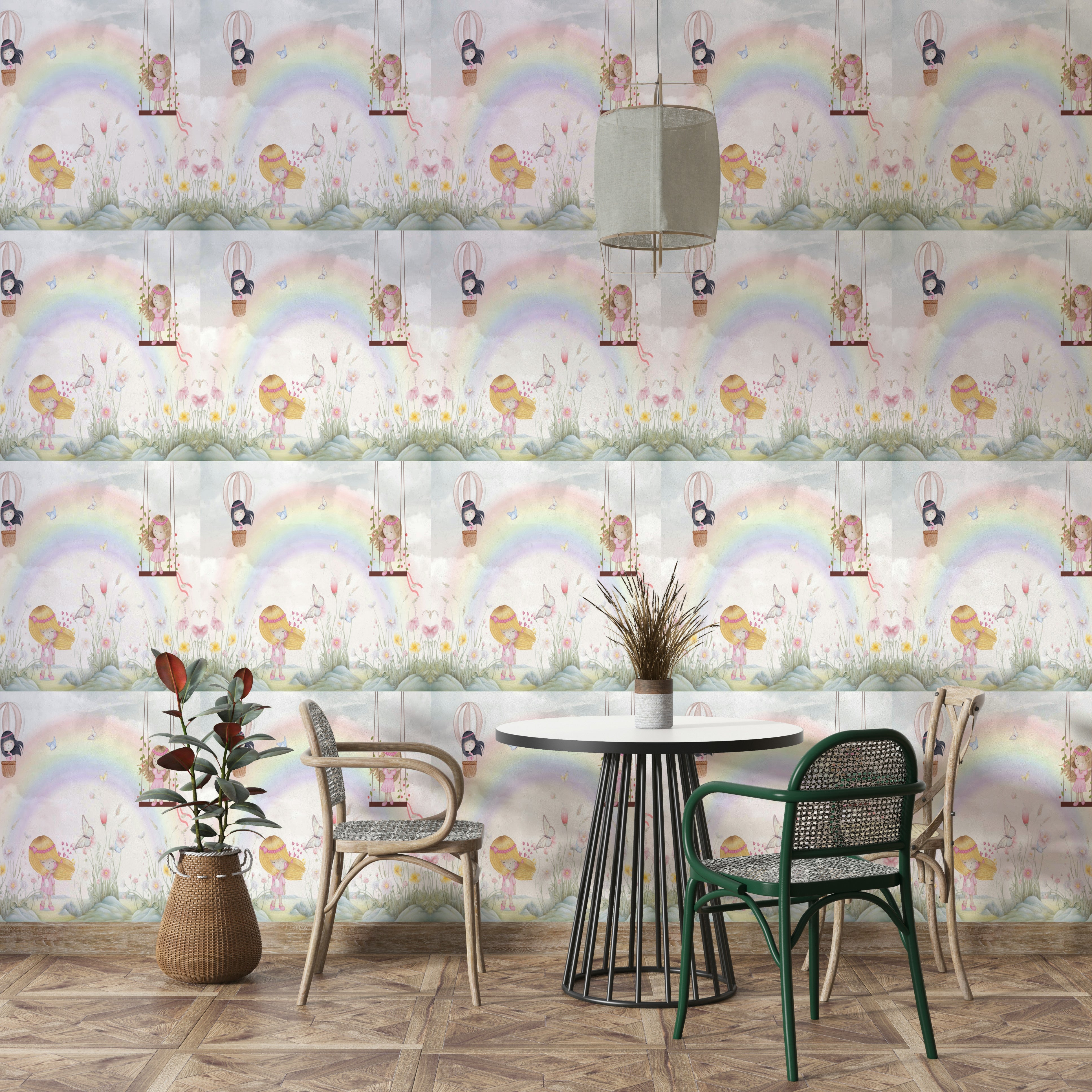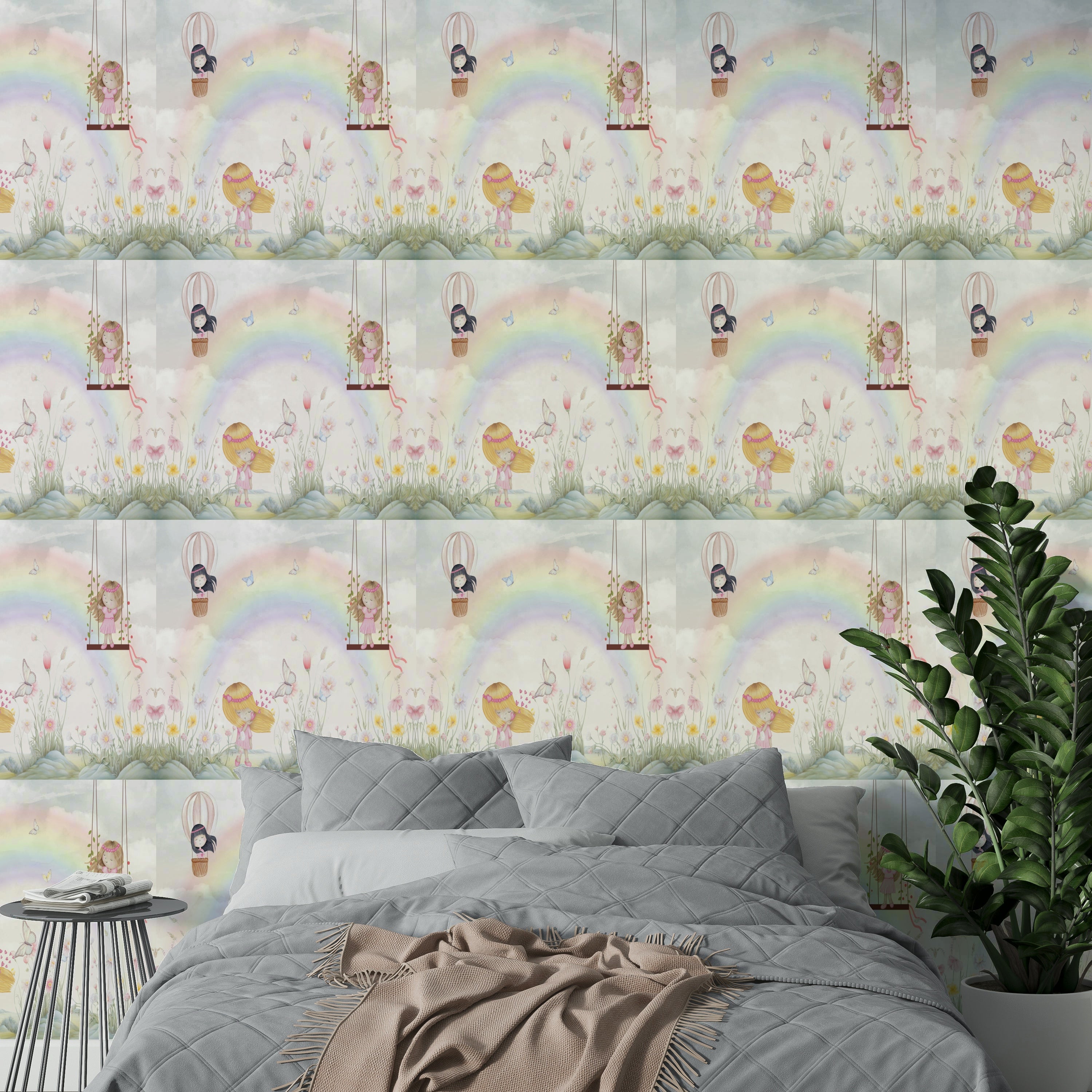 This enchanting wallpaper transports you to a dreamy world of pastel hues and playful characters. Delicate watercolor flowers bloom beneath a vibrant rainbow, while adorable girls embark on whimsical adventures – one soaring in a hot air balloon, another swinging gently amidst blossoming branches. Butterflies flutter freely, adding to the ethereal ambiance. The soft color palette and hand-drawn style create a serene and captivating scene, perfect for a child's room or any space needing a touch of magic and wonder.